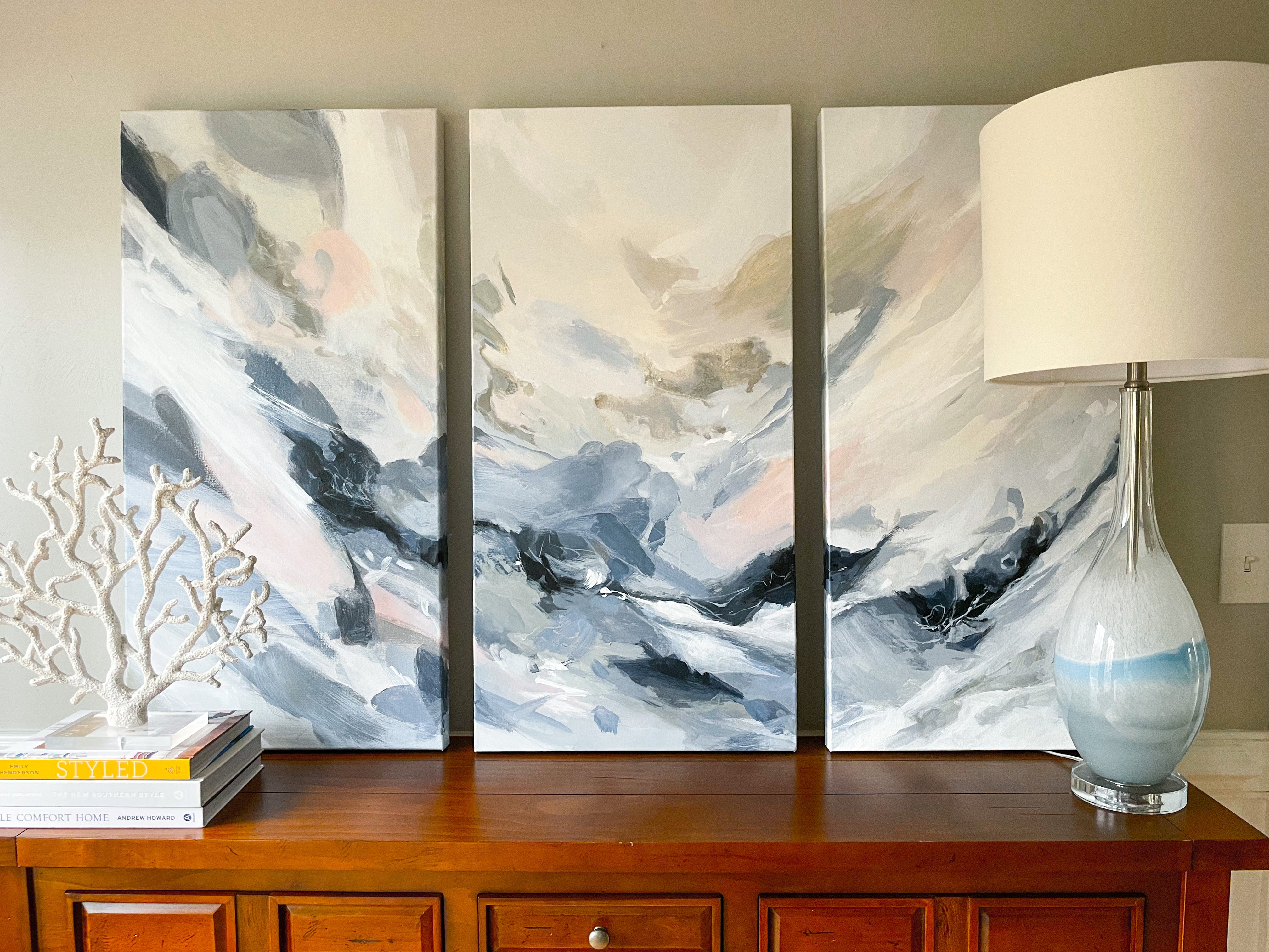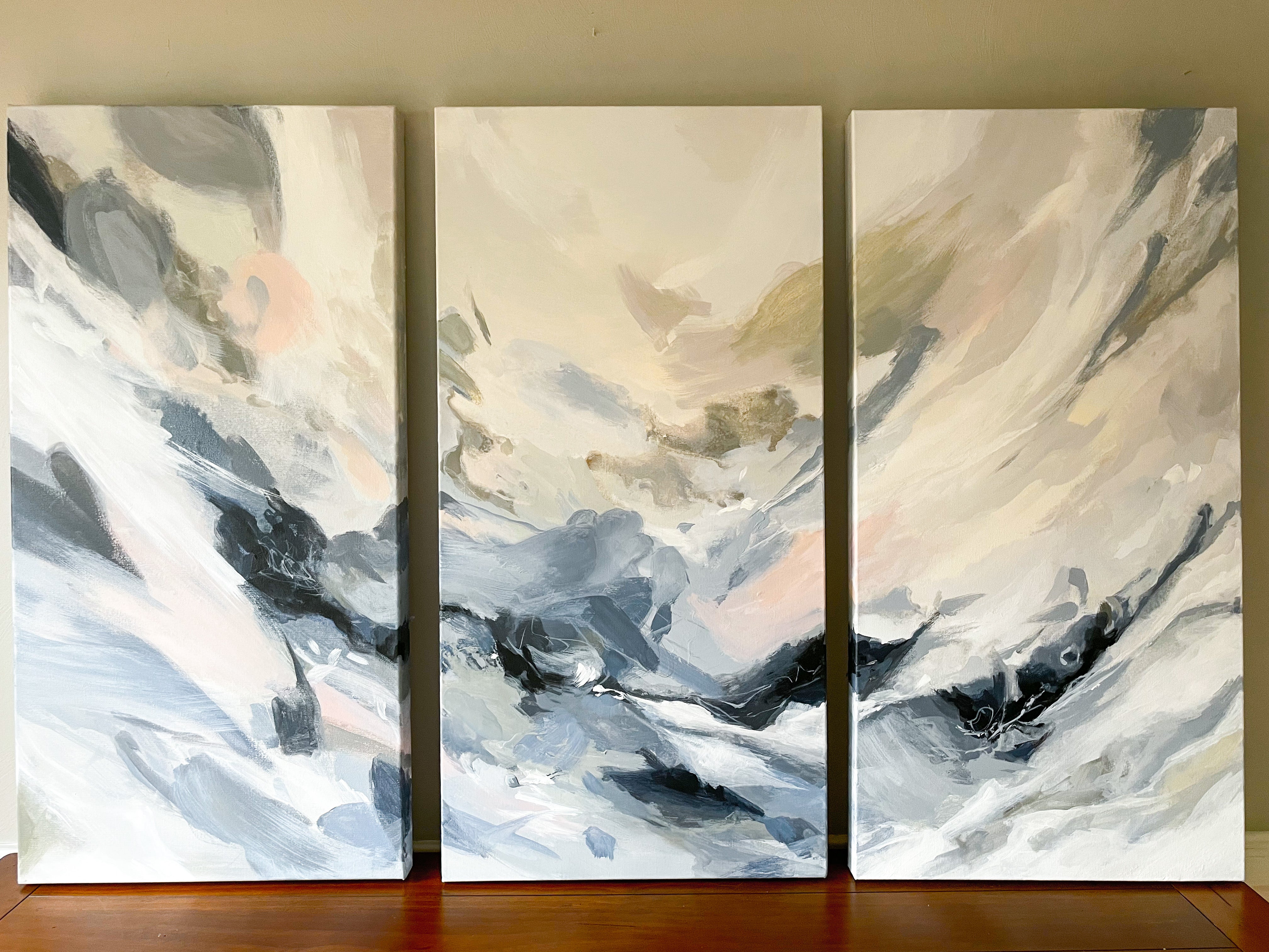 Three (3) 18“ x 36“ paintings, acrylic on canvas, 1.75” gallery wrapped deep painted edge. Wired and ready to hang.
