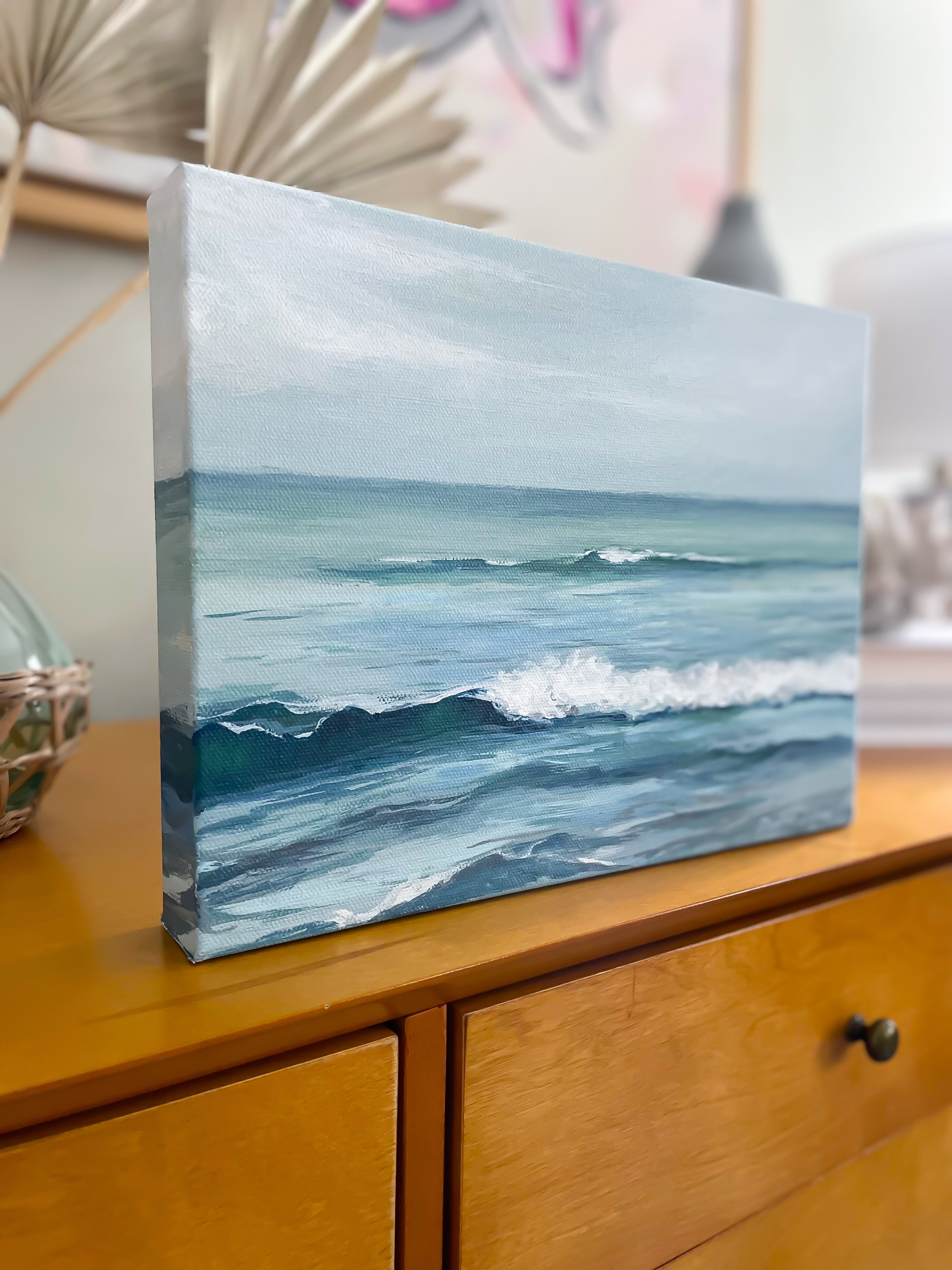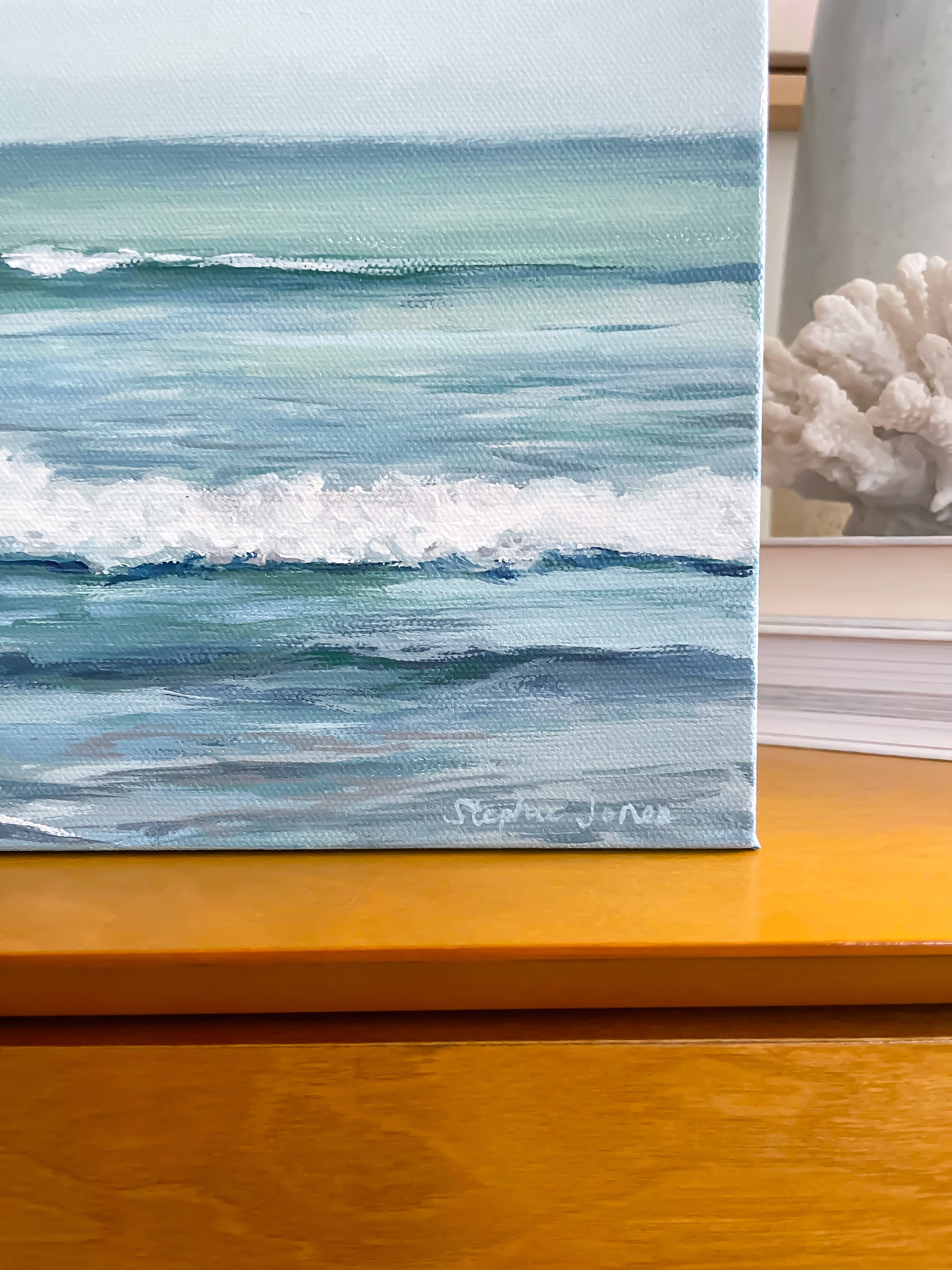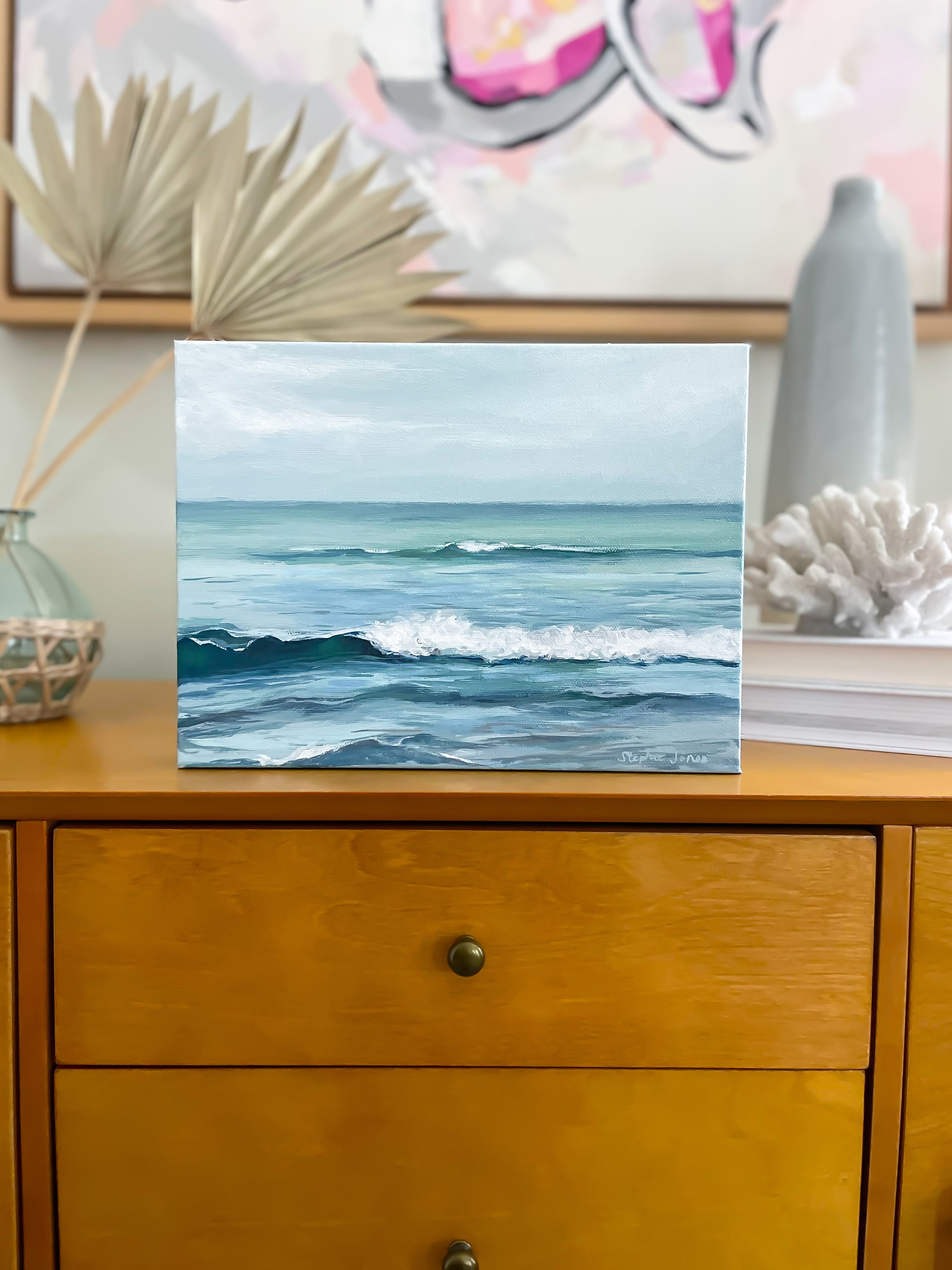 This original 9x12” acrylic ocean painting by Stephie Jones features a 1.5" gallery wrapped canvas edge with painted sides. It adds a sophisticated, summery, coastal vibe to your home.