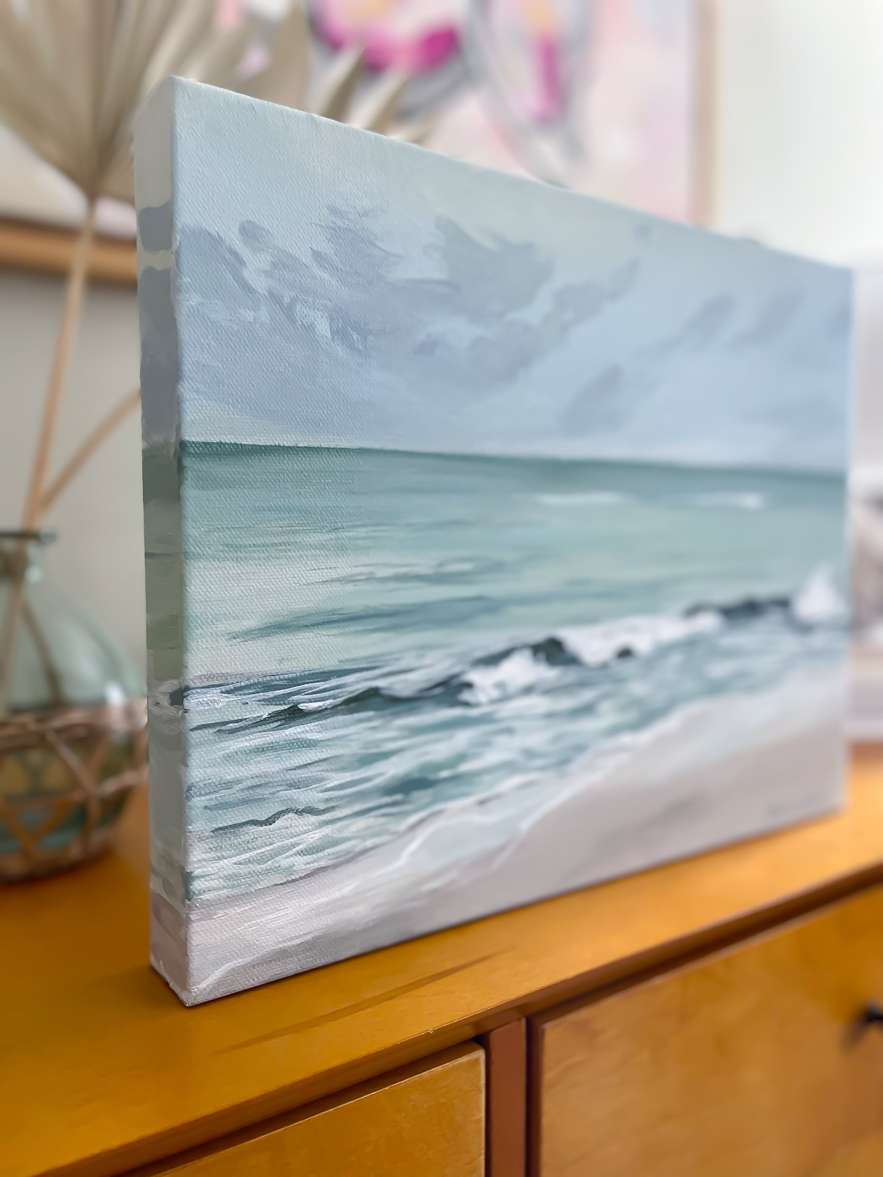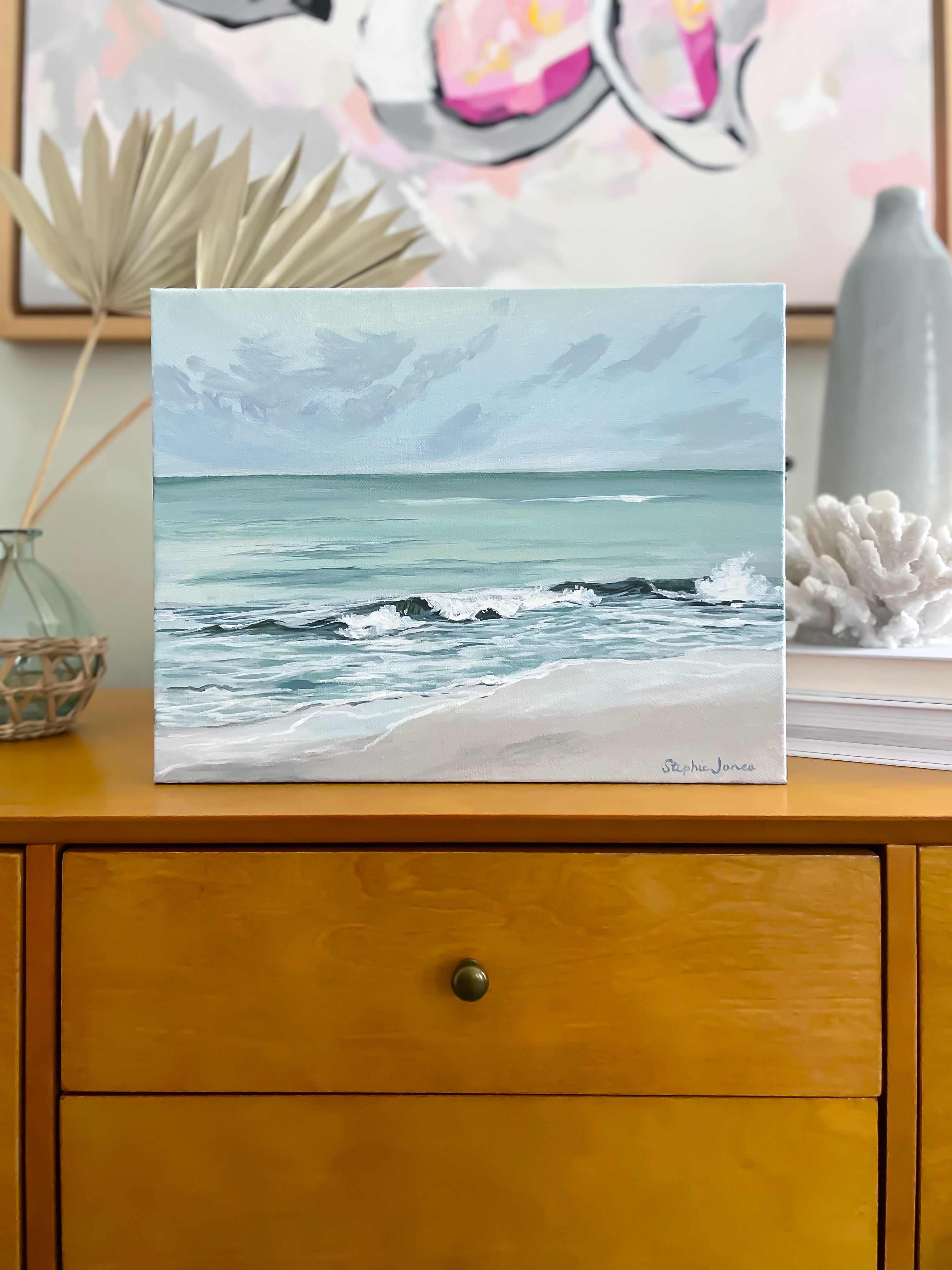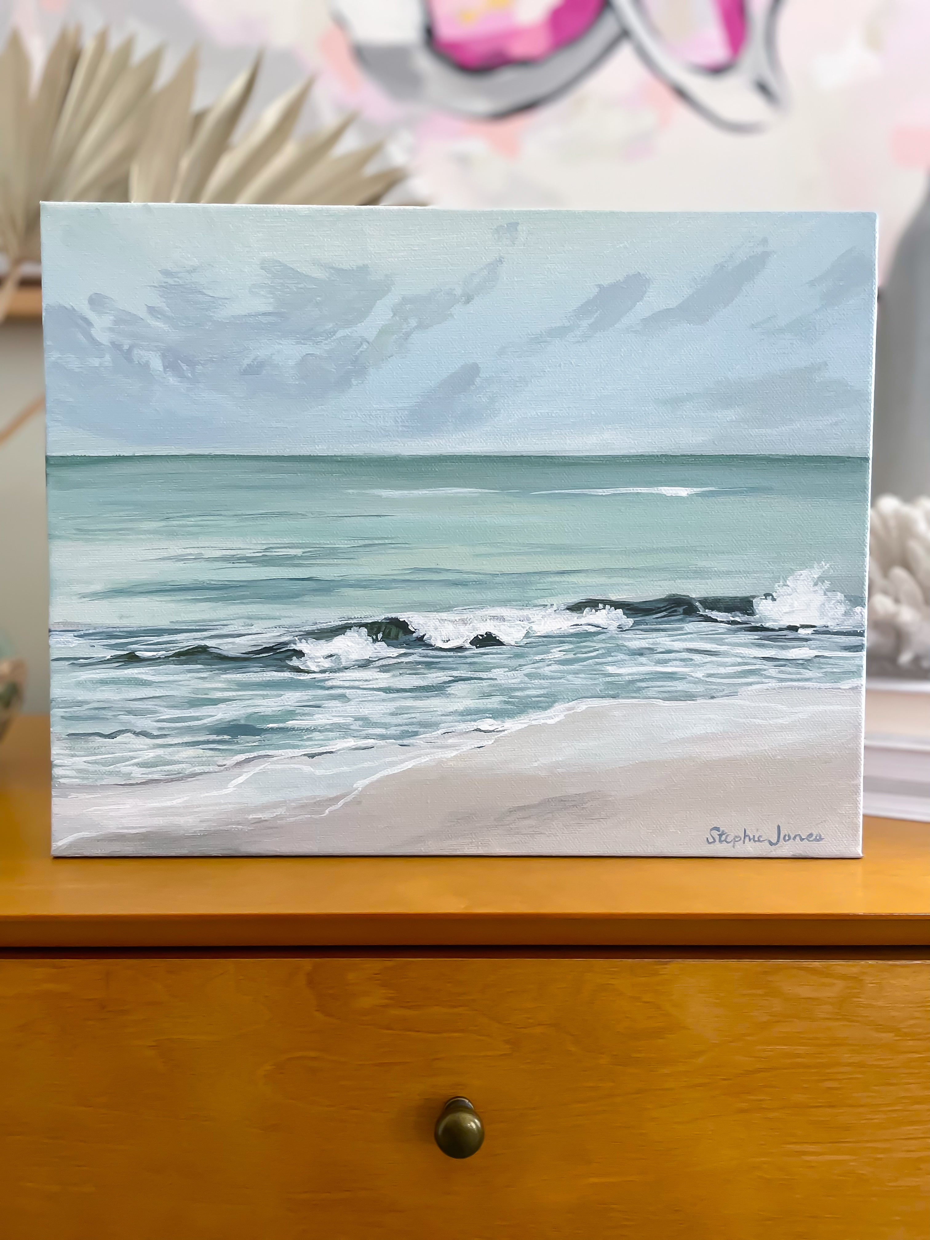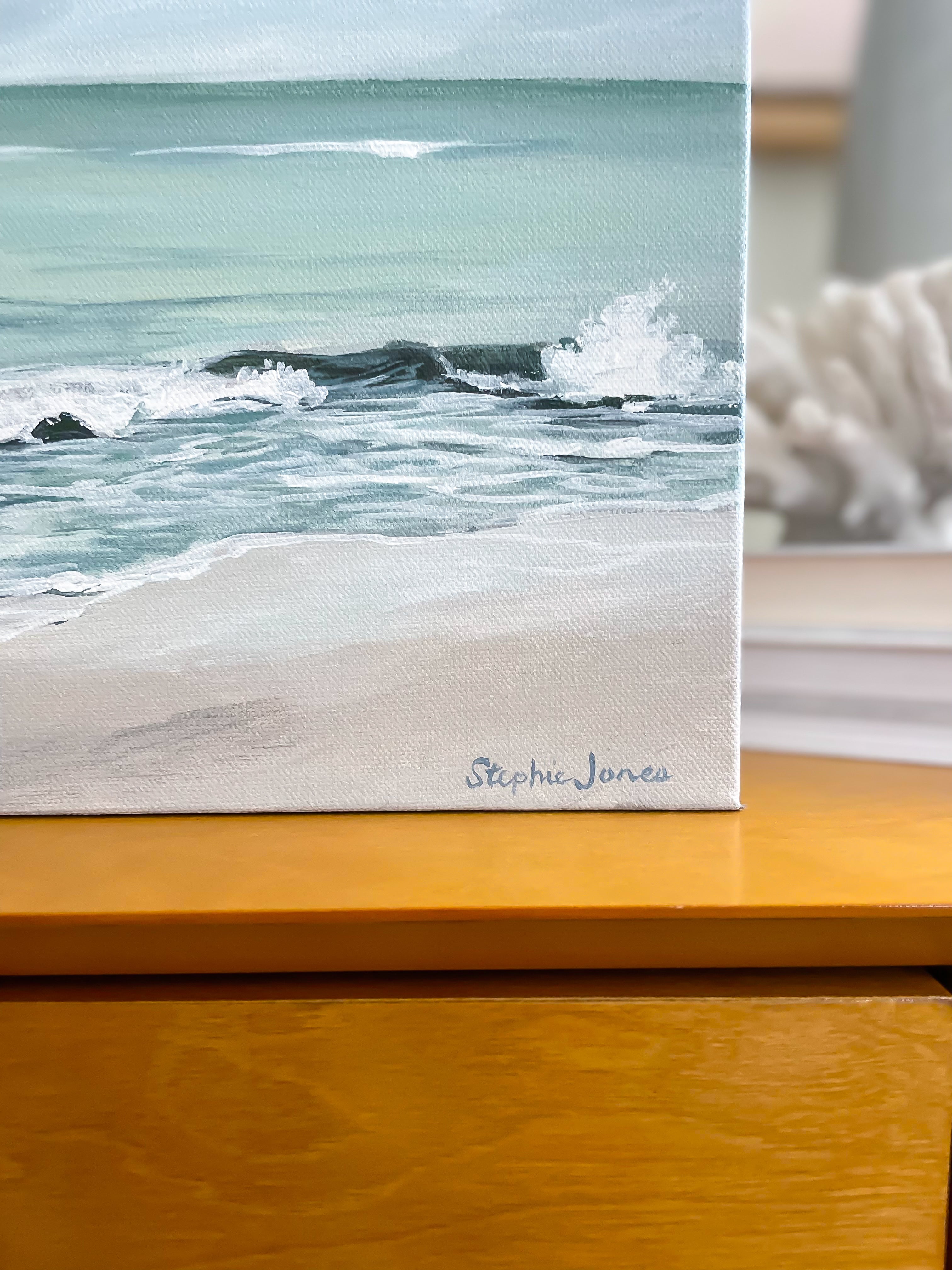 All the beachy summer vibes come alive in this serene and soft coastal ocean painting by Stephie Jones. Can't you just hear the waves lapping the seashore? Seagulls in flight and a gorgeous sunset are within reach.