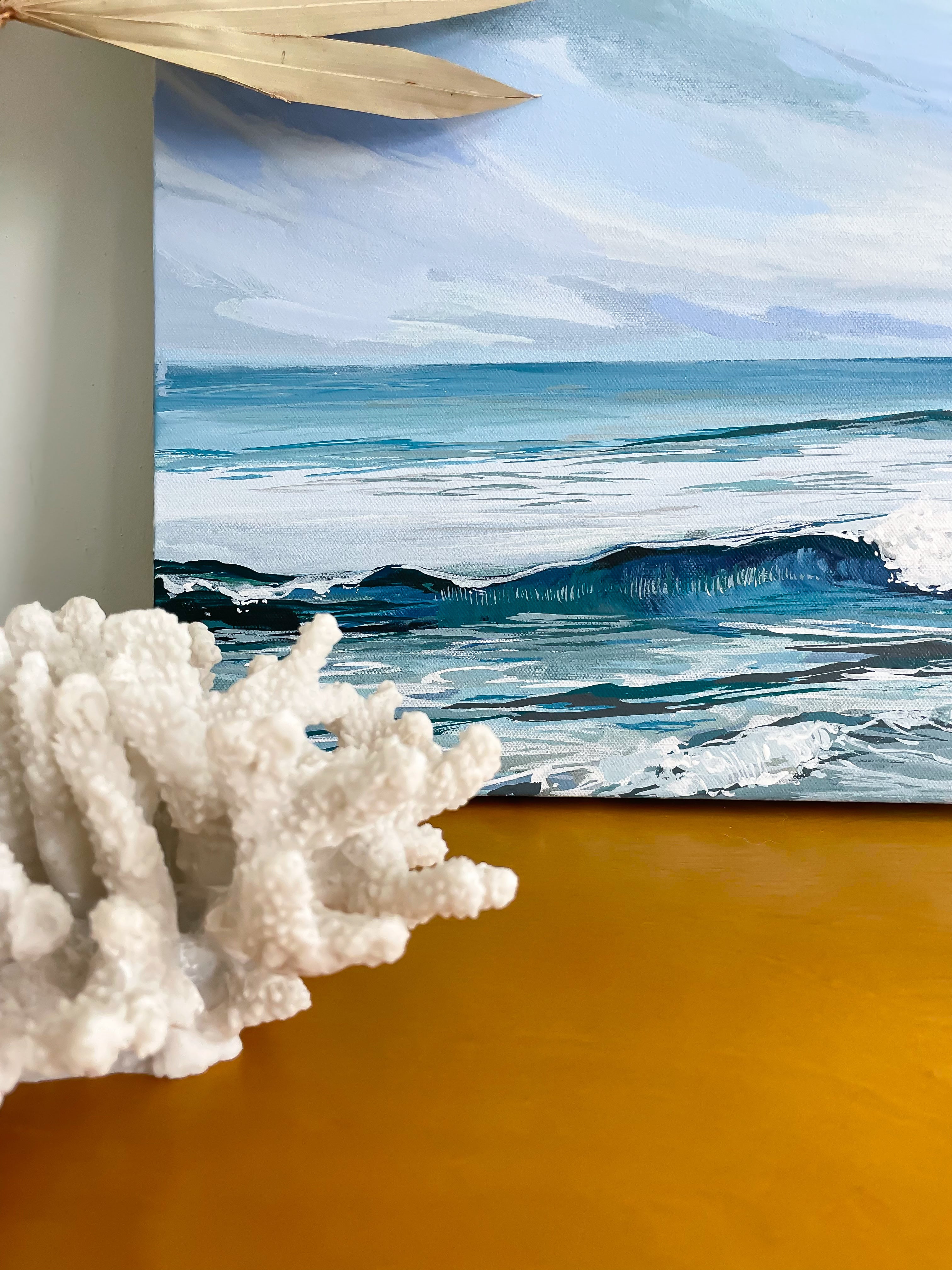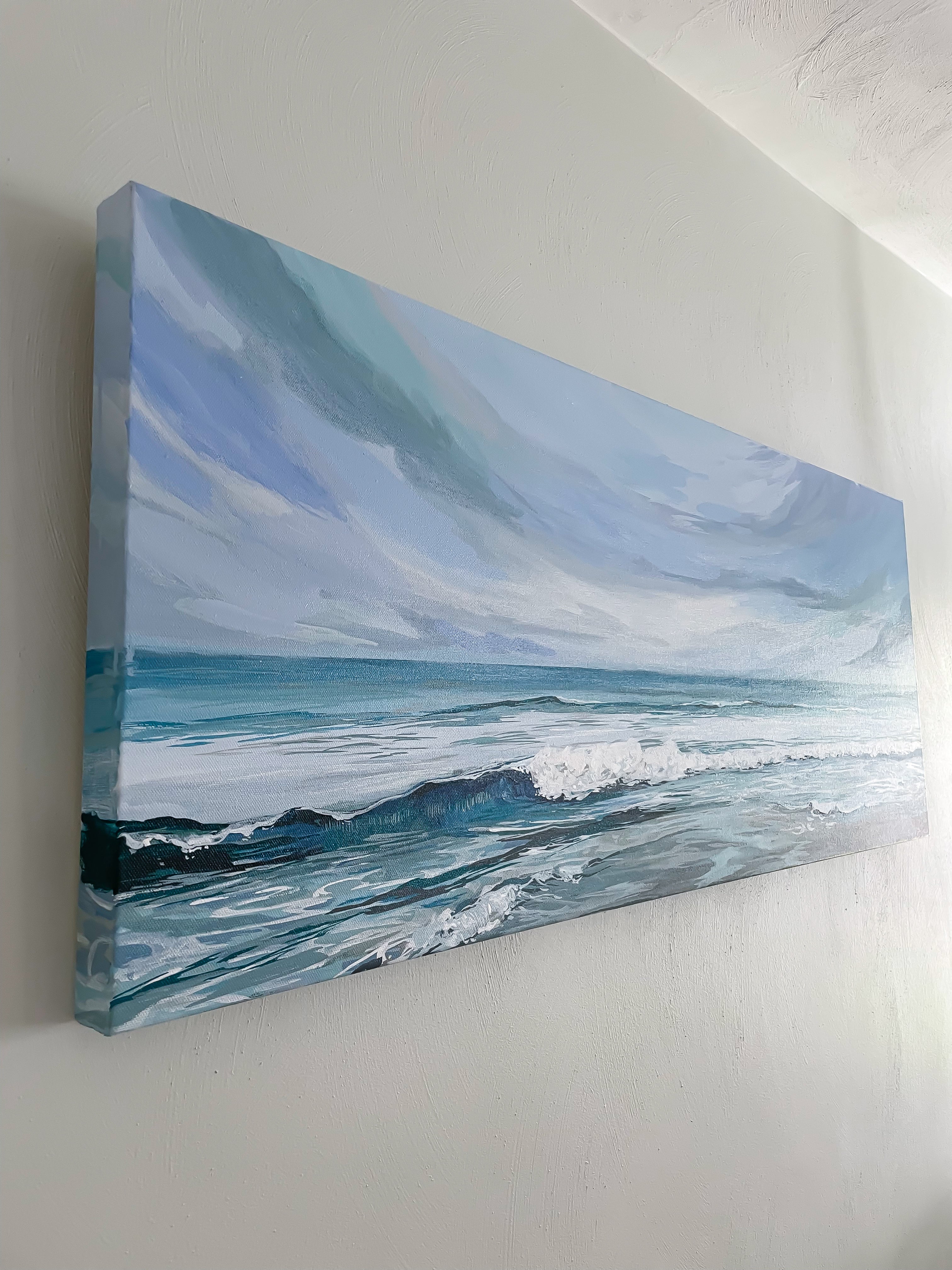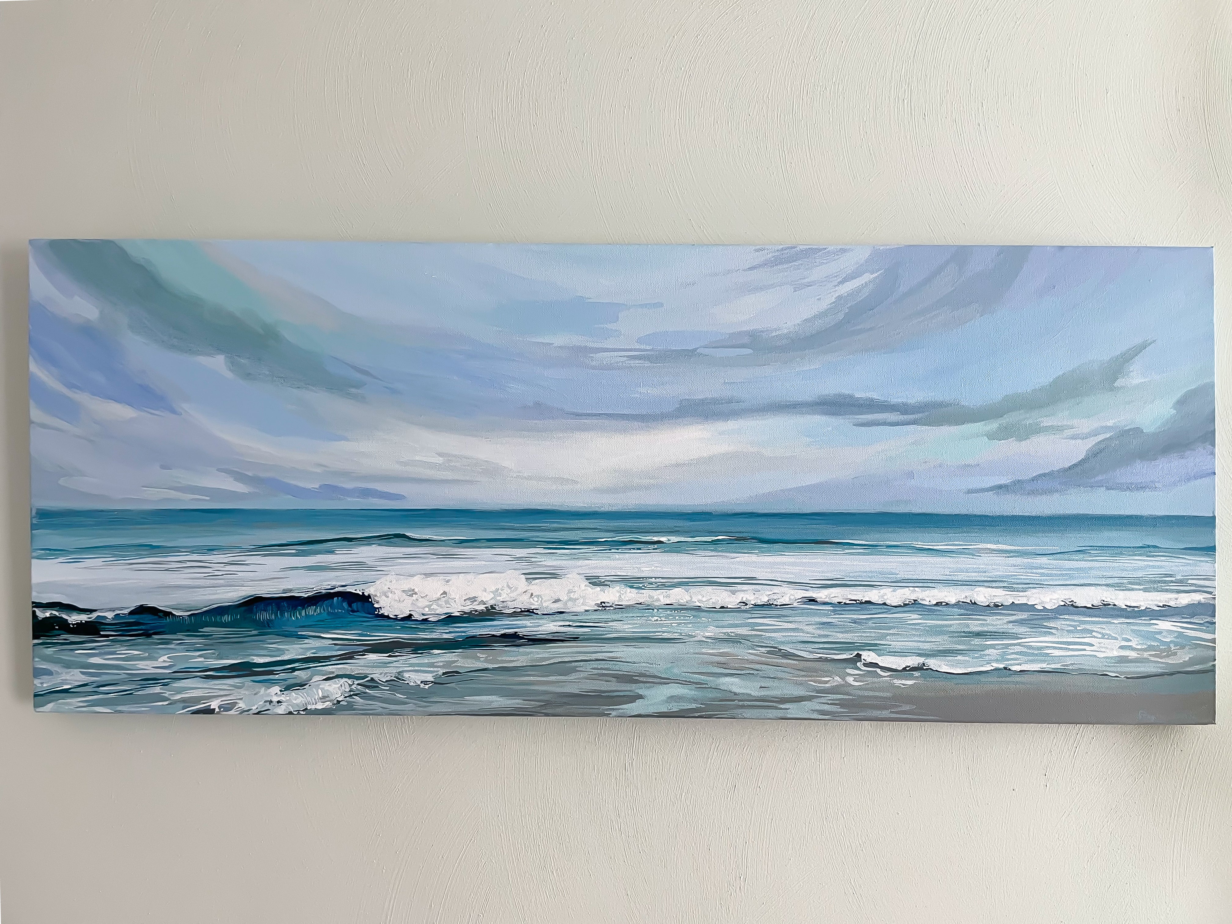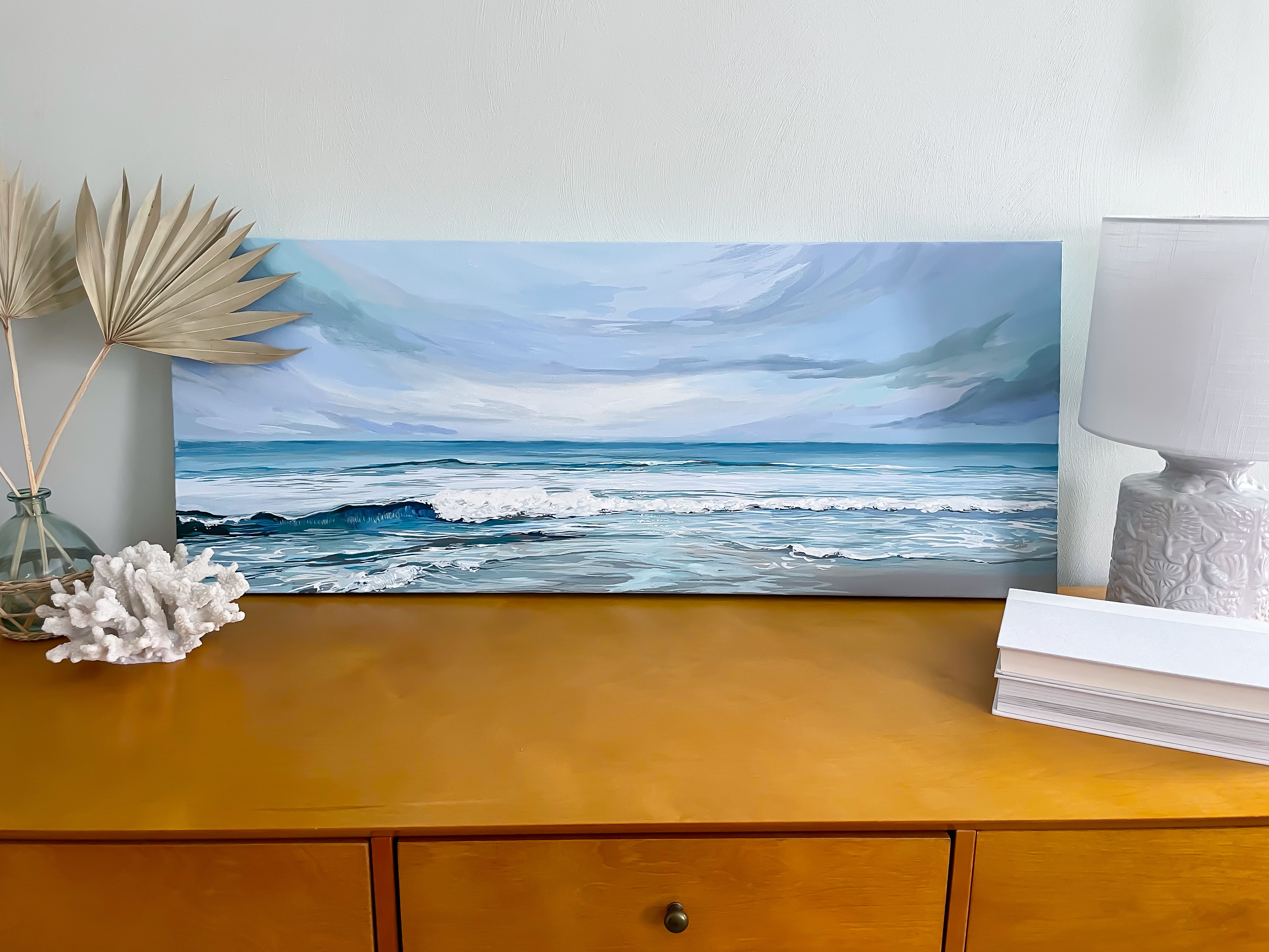 This original 40x16” acrylic ocean painting by Stephie Jones features a 1.5" gallery wrapped canvas edge with painted sides. It adds a sophisticated, summery, coastal vibe to your home.