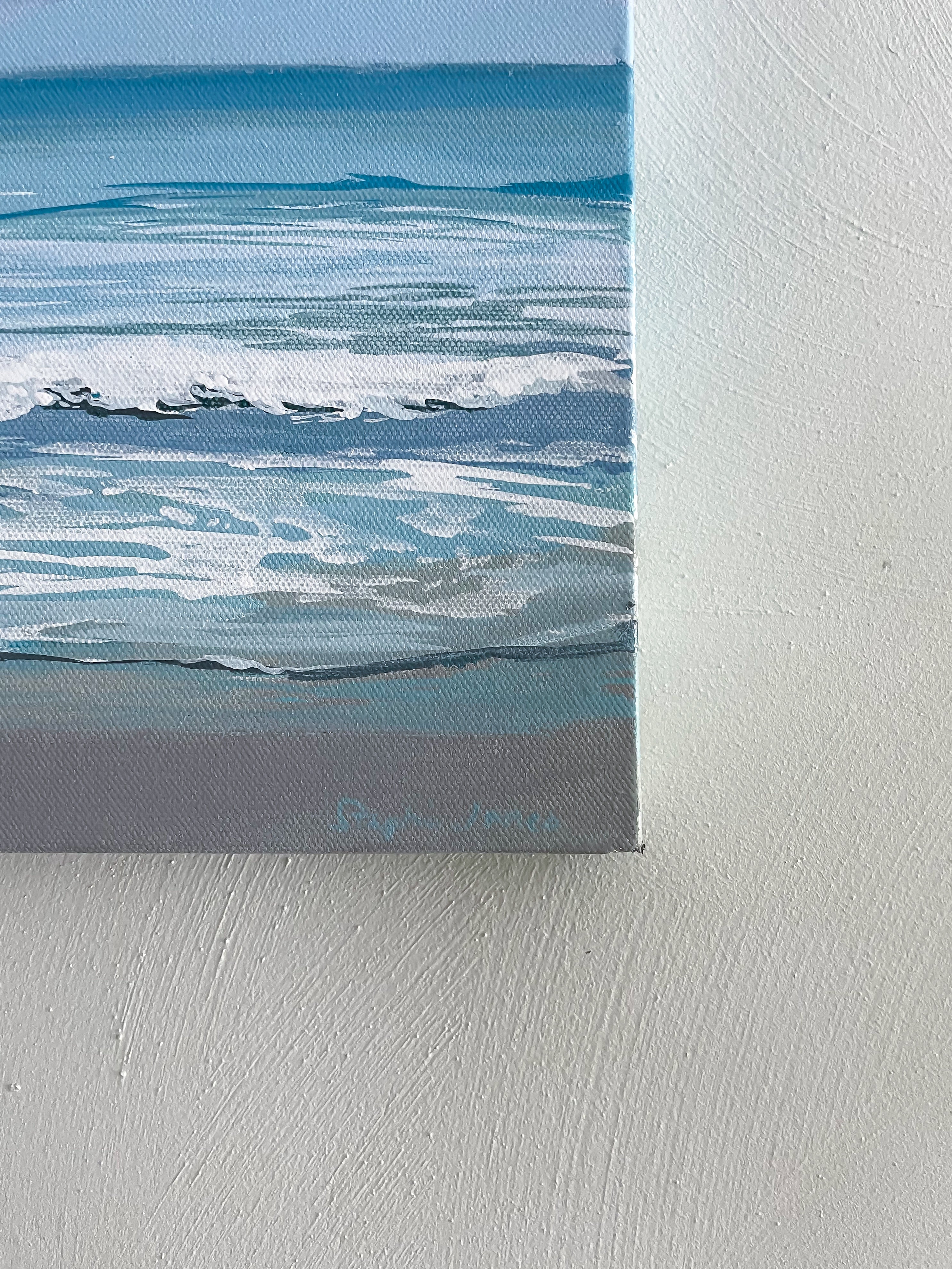 All the beachy summer vibes come alive in this serene and soft coastal ocean painting by Stephie Jones. Can't you just hear the waves lapping the seashore? Seagulls in flight and a gorgeous sunset are within reach.