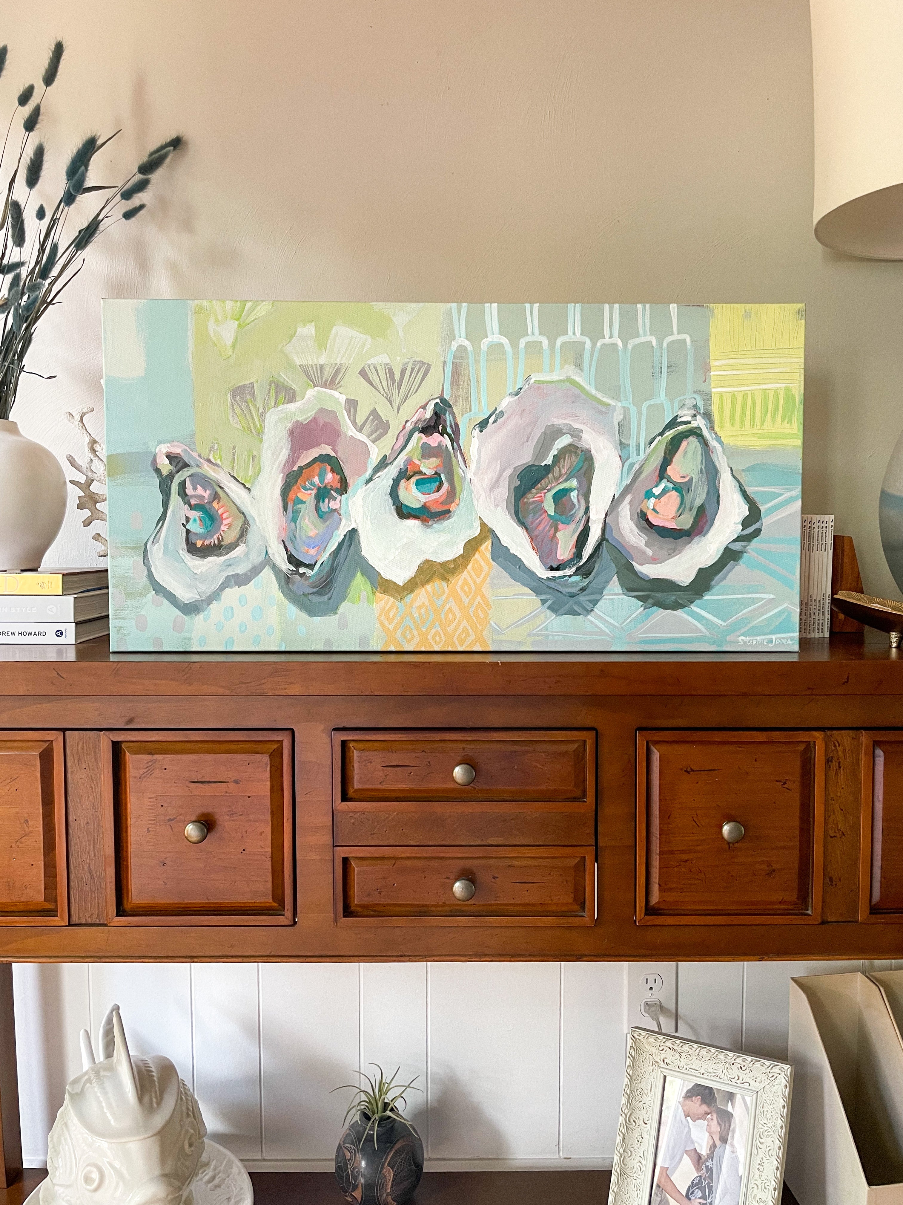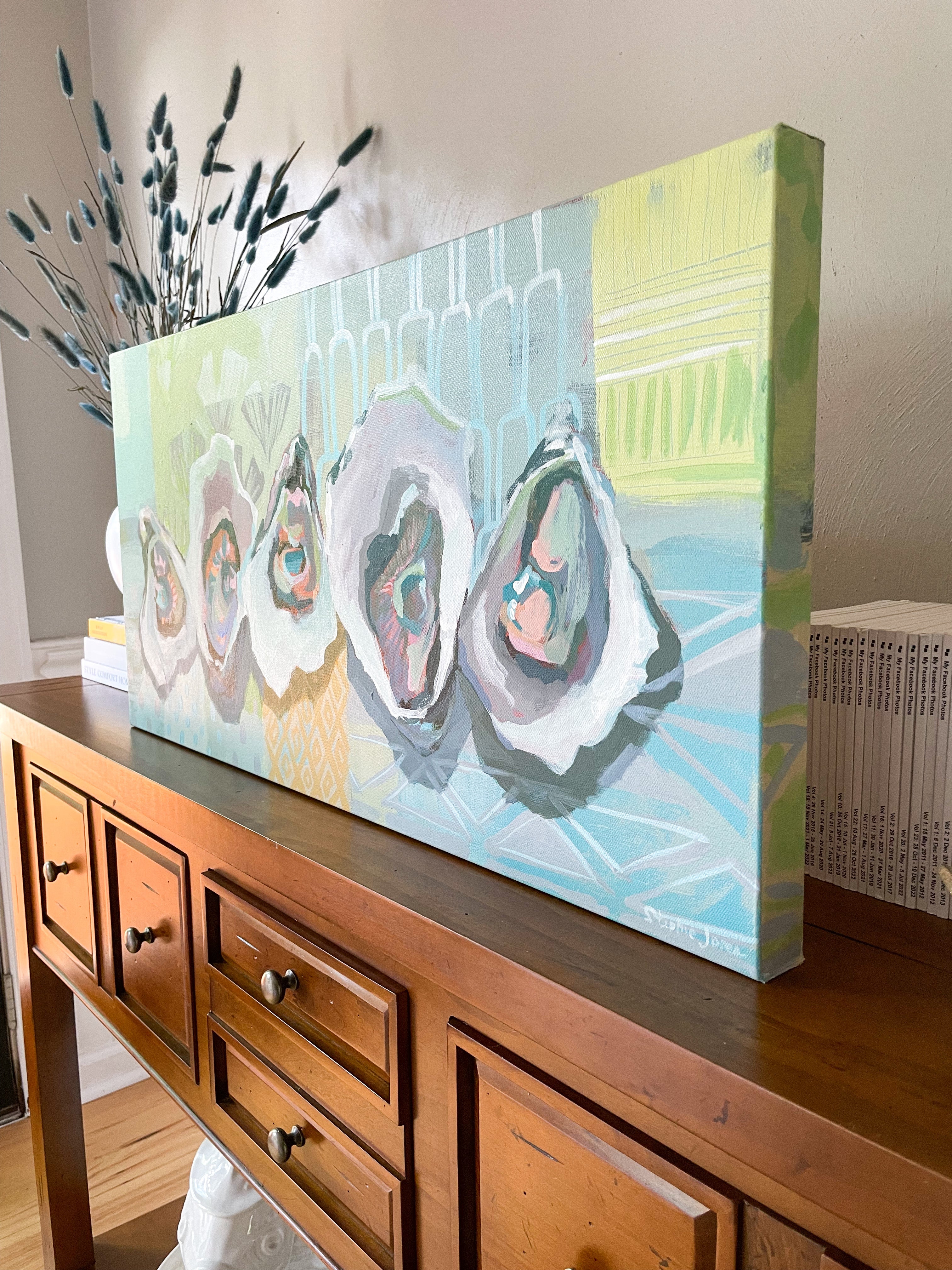This original 30x15” acrylic oyster painting by Stephie Jones features a 1.5" gallery wrapped canvas edge with painted sides. It adds a sophisticated, summery, coastal vibe to your home.