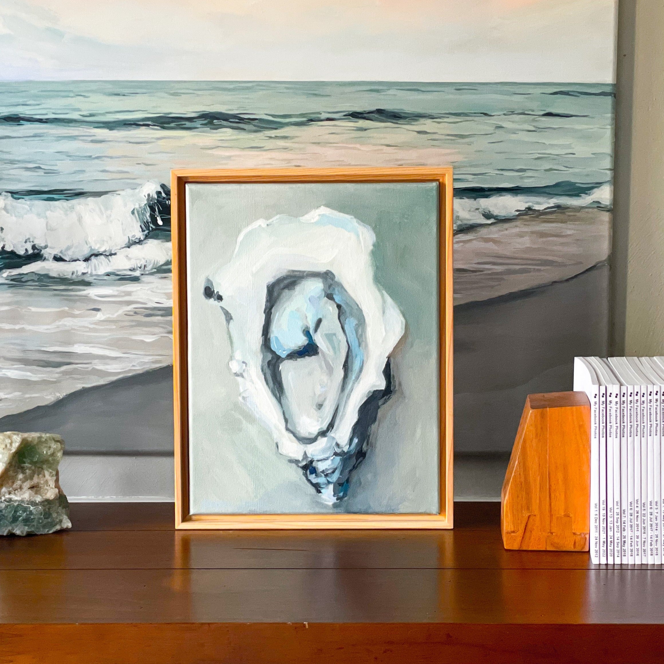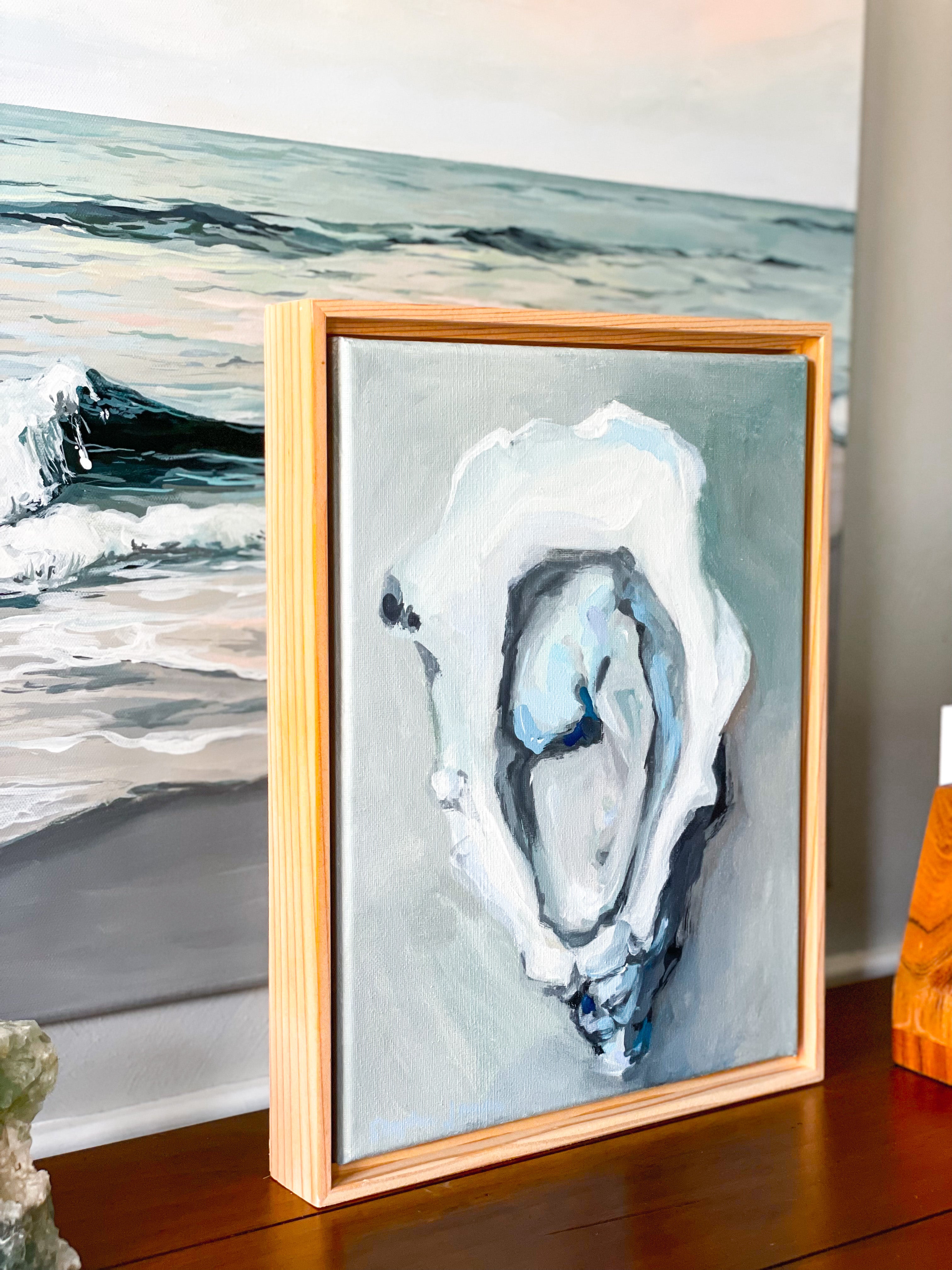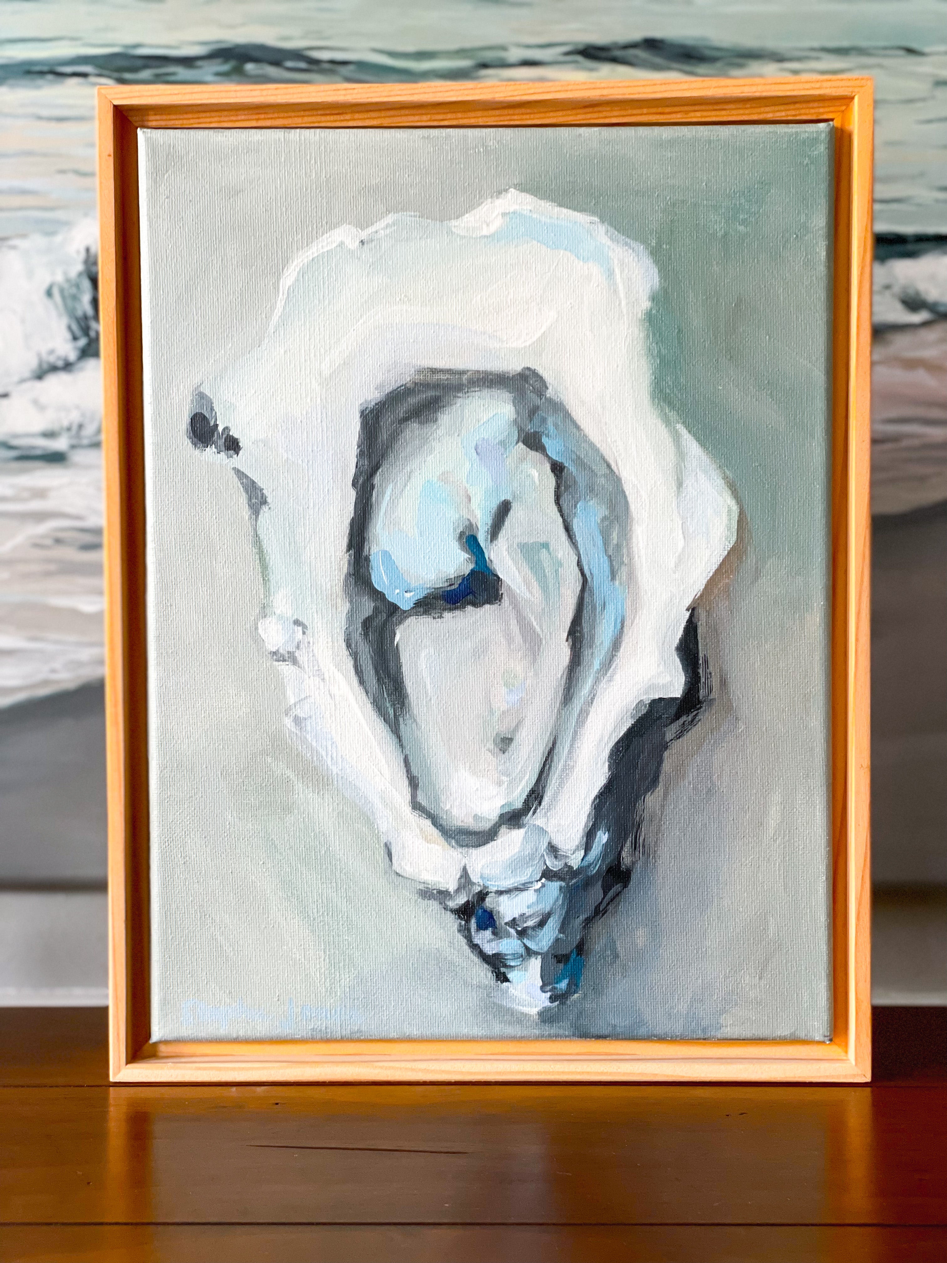This original 10x13” acrylic oyster painting by Stephie Jones features a 1.5" gallery wrapped canvas edge with painted sides. Wired and ready to hang. It adds a sophisticated, summery, coastal vibe to your home.