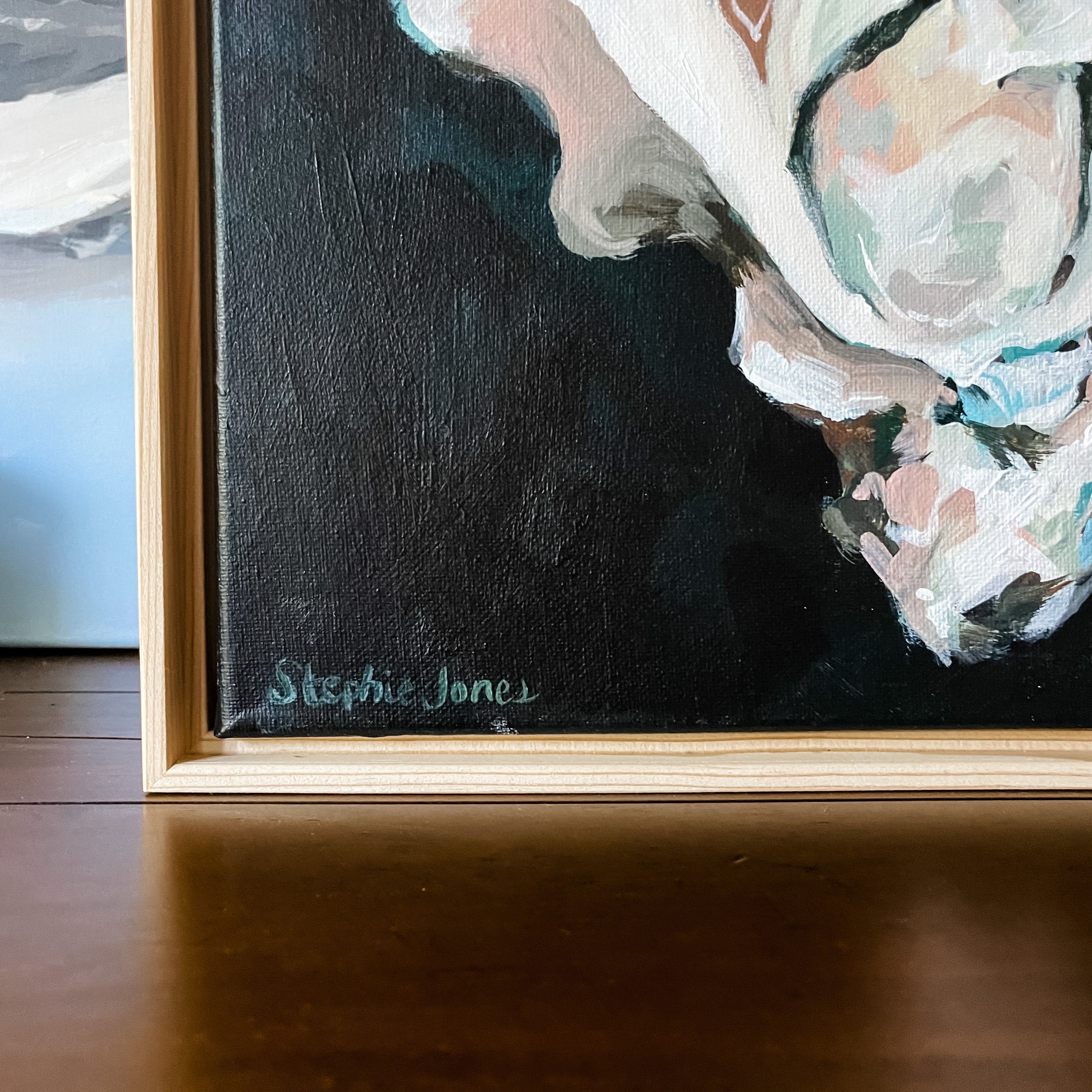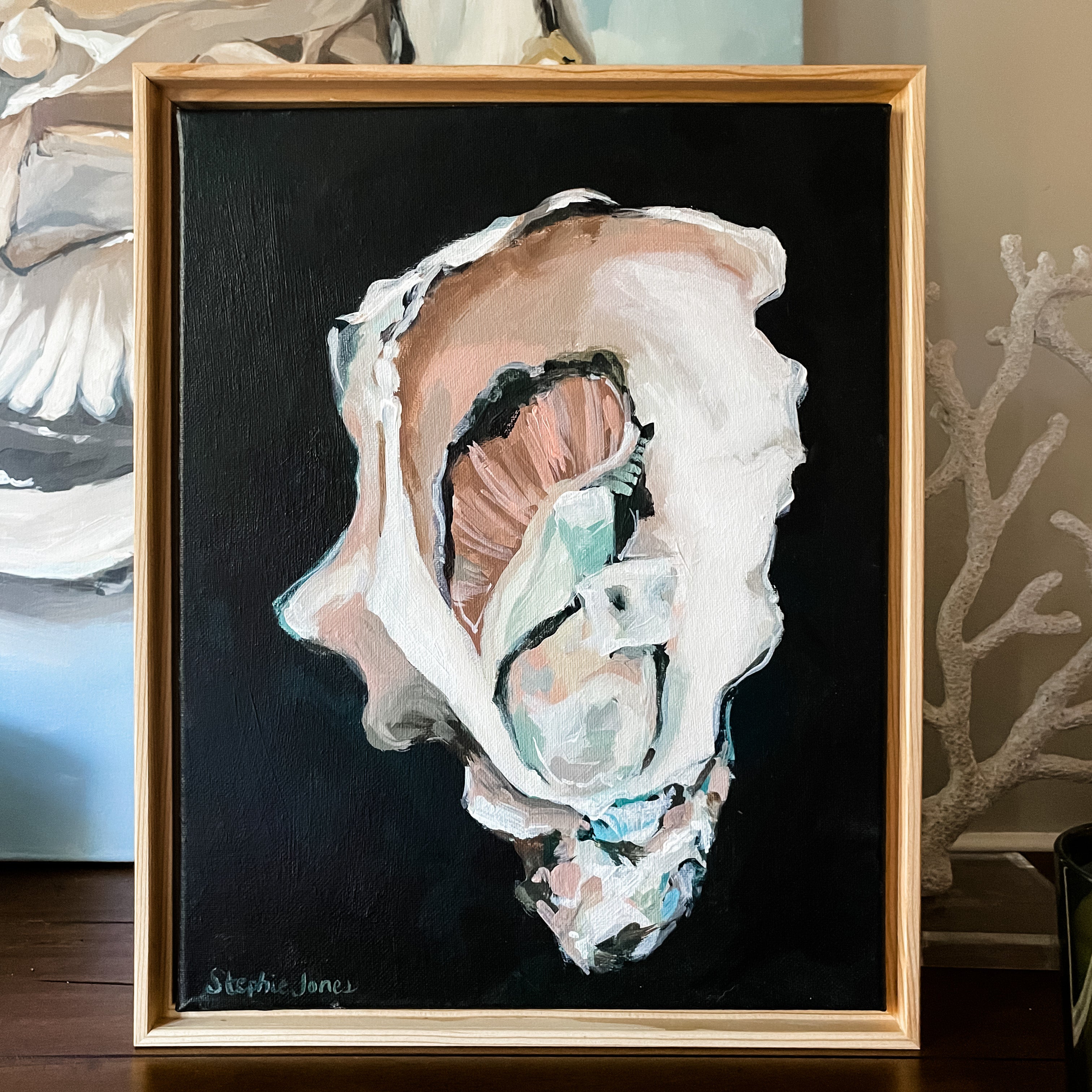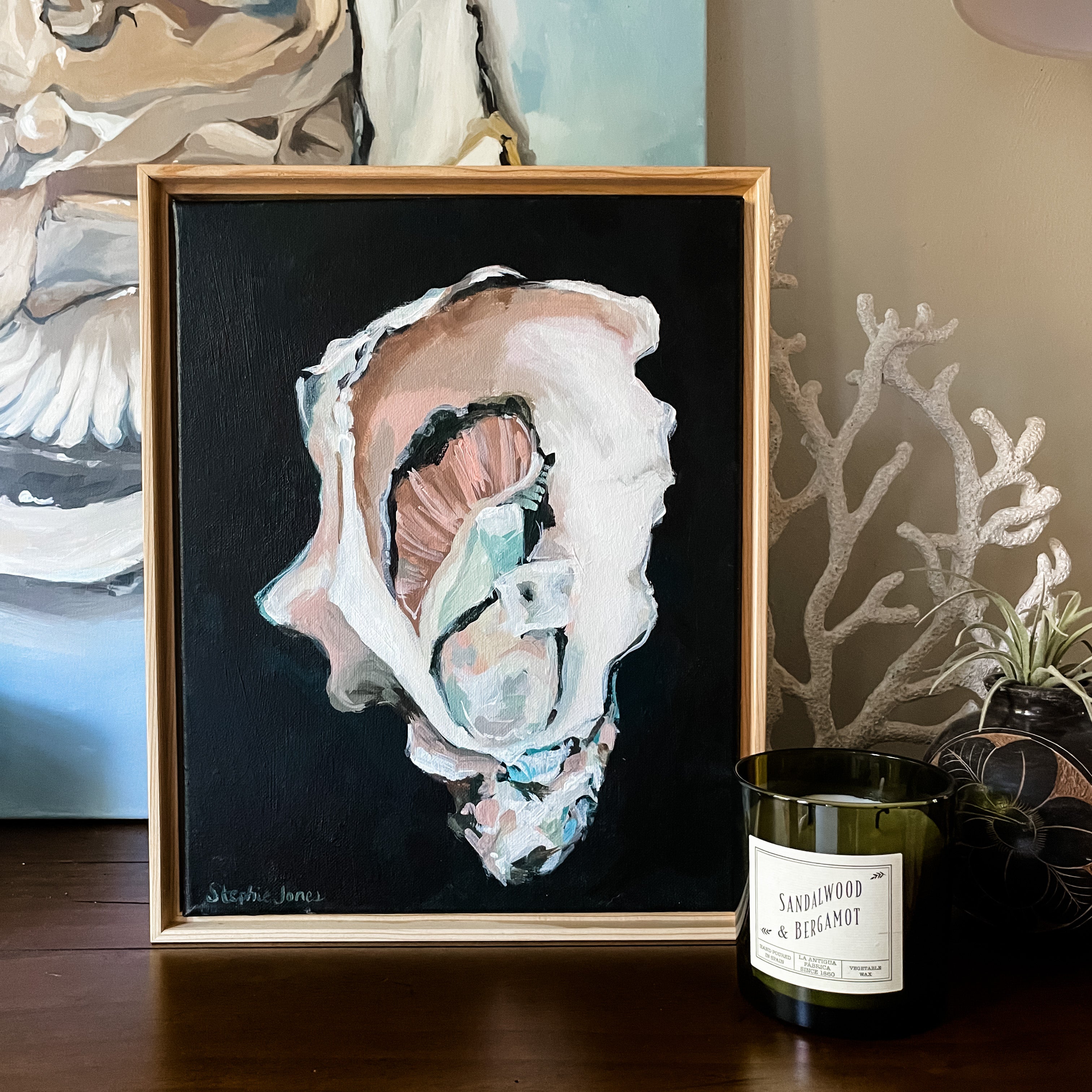 Brightly painted oyster by Stephie Jones, acrylic on canvas.