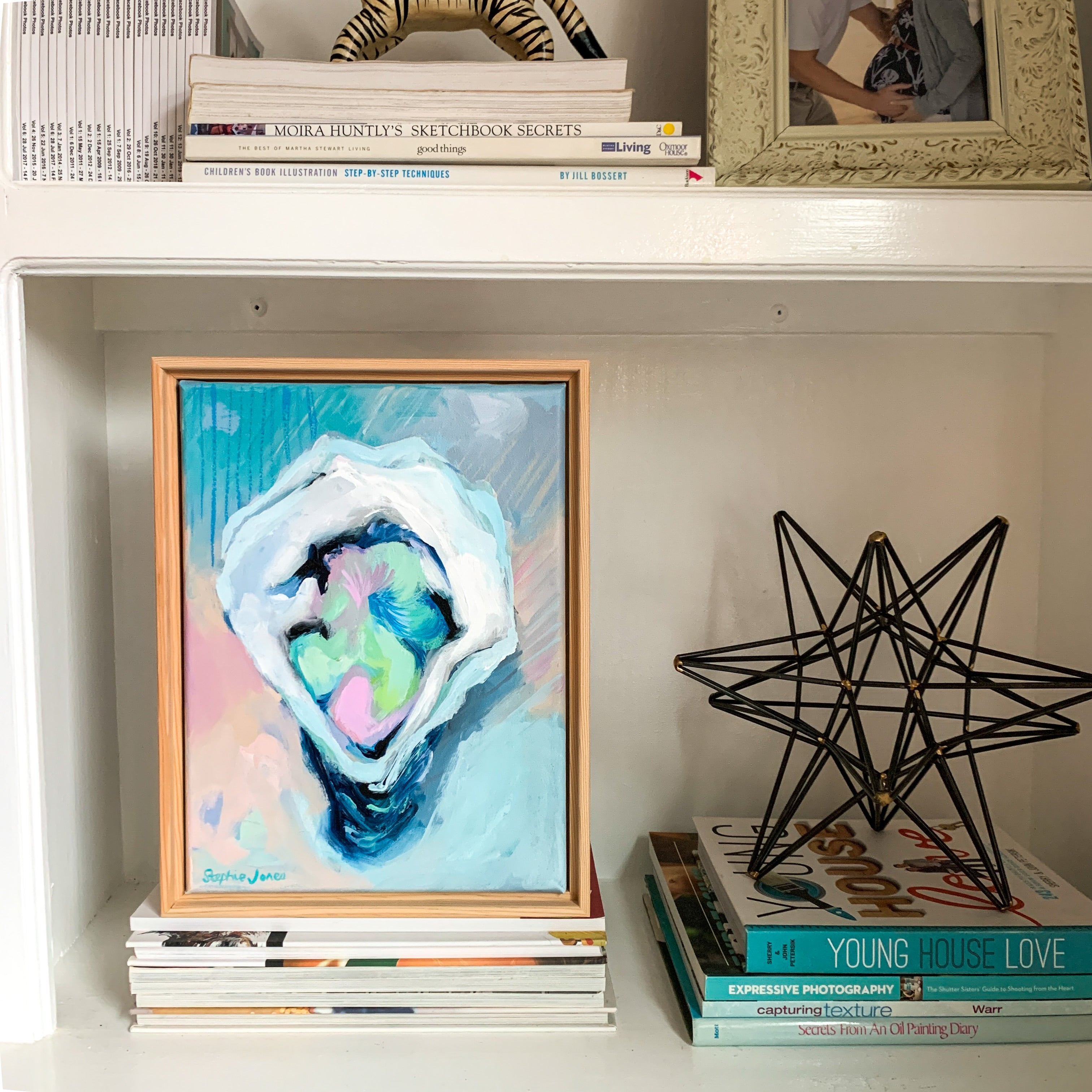 Brightly painted oysters by Stephie Jones, acrylic on canvas. Framed in natural wood float frame, wired and ready to hang.