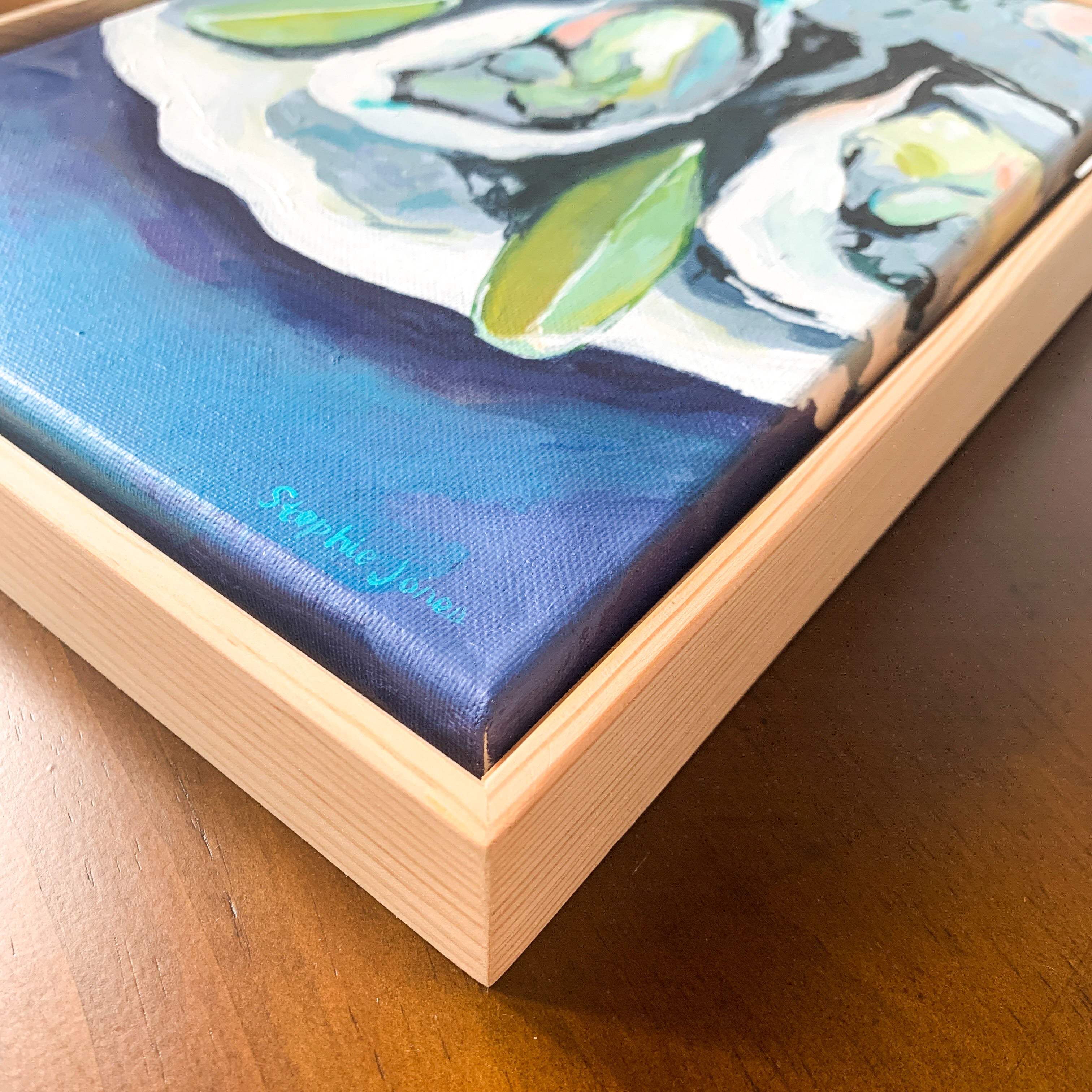 Brightly painted oysters by Stephie Jones, acrylic on canvas. Framed in natural wood float frame, wired and ready to hang.