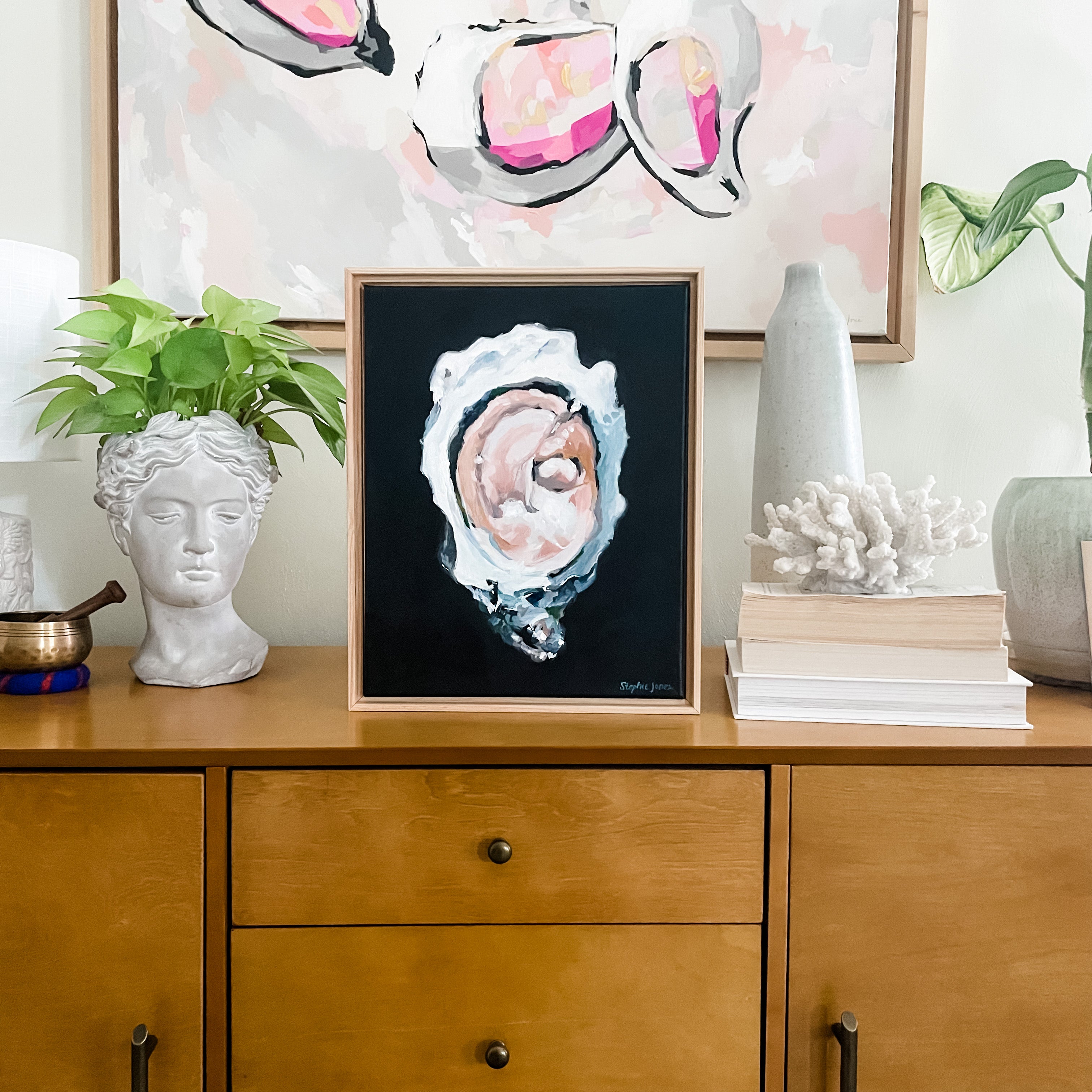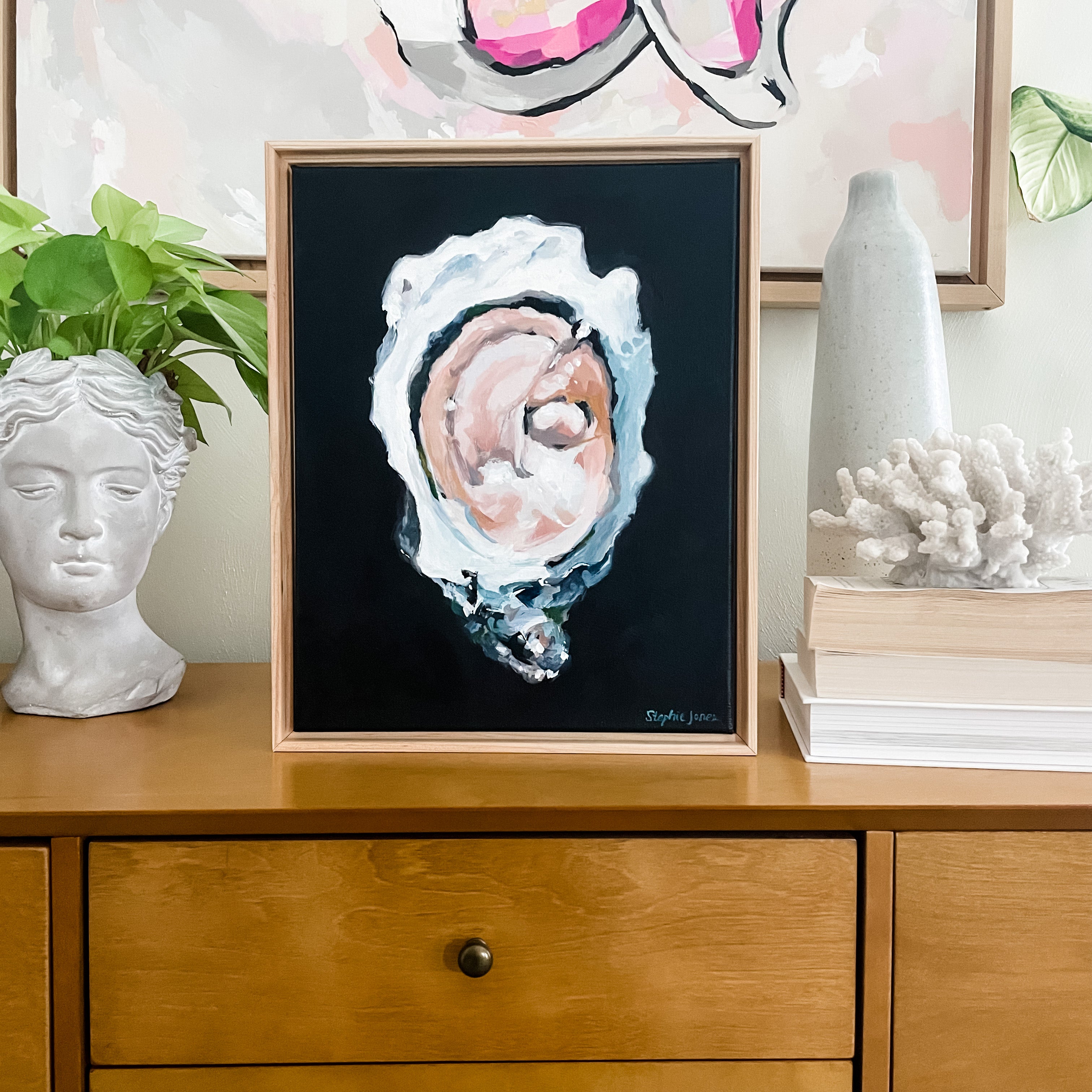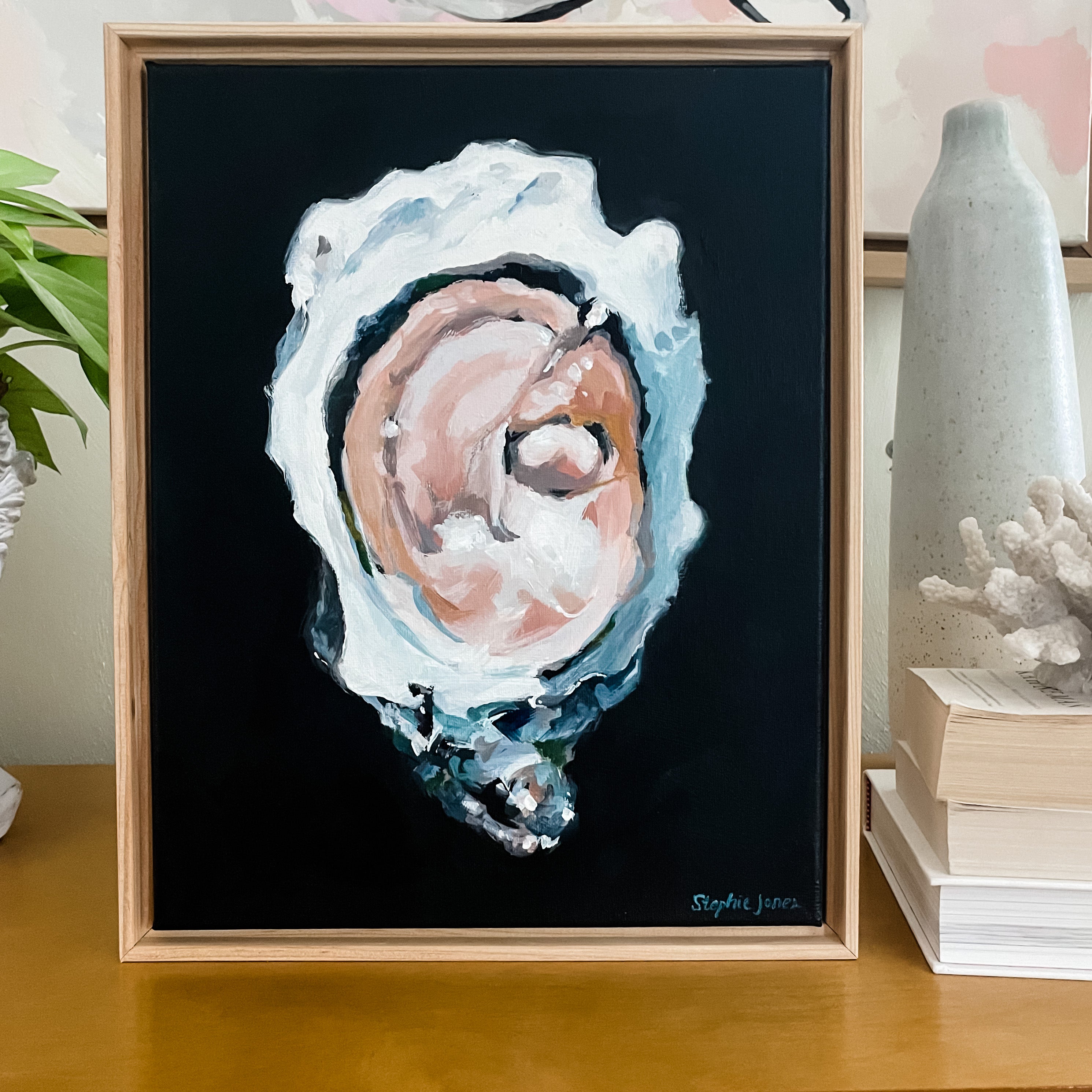 Brightly painted oyster by Stephie Jones, acrylic on canvas.