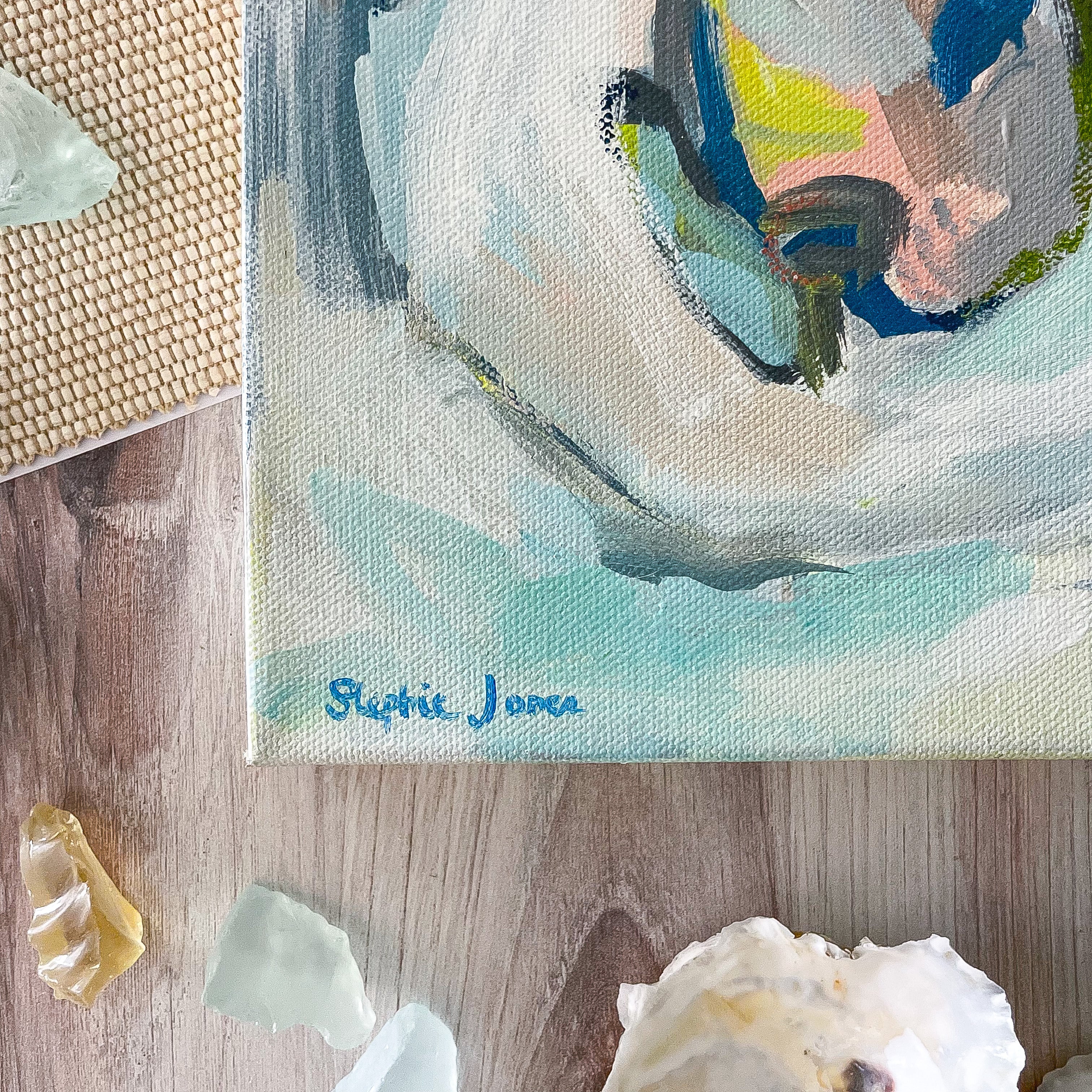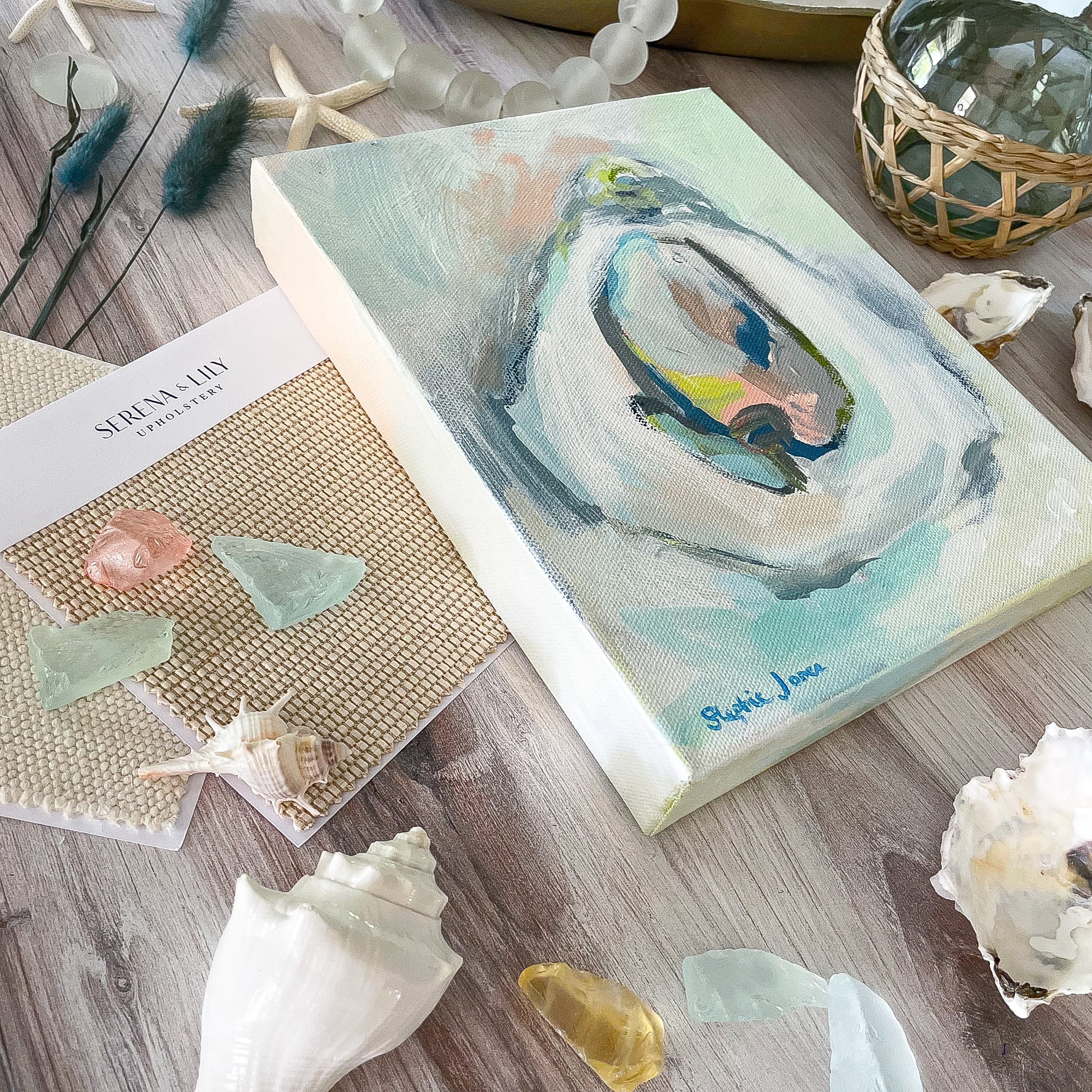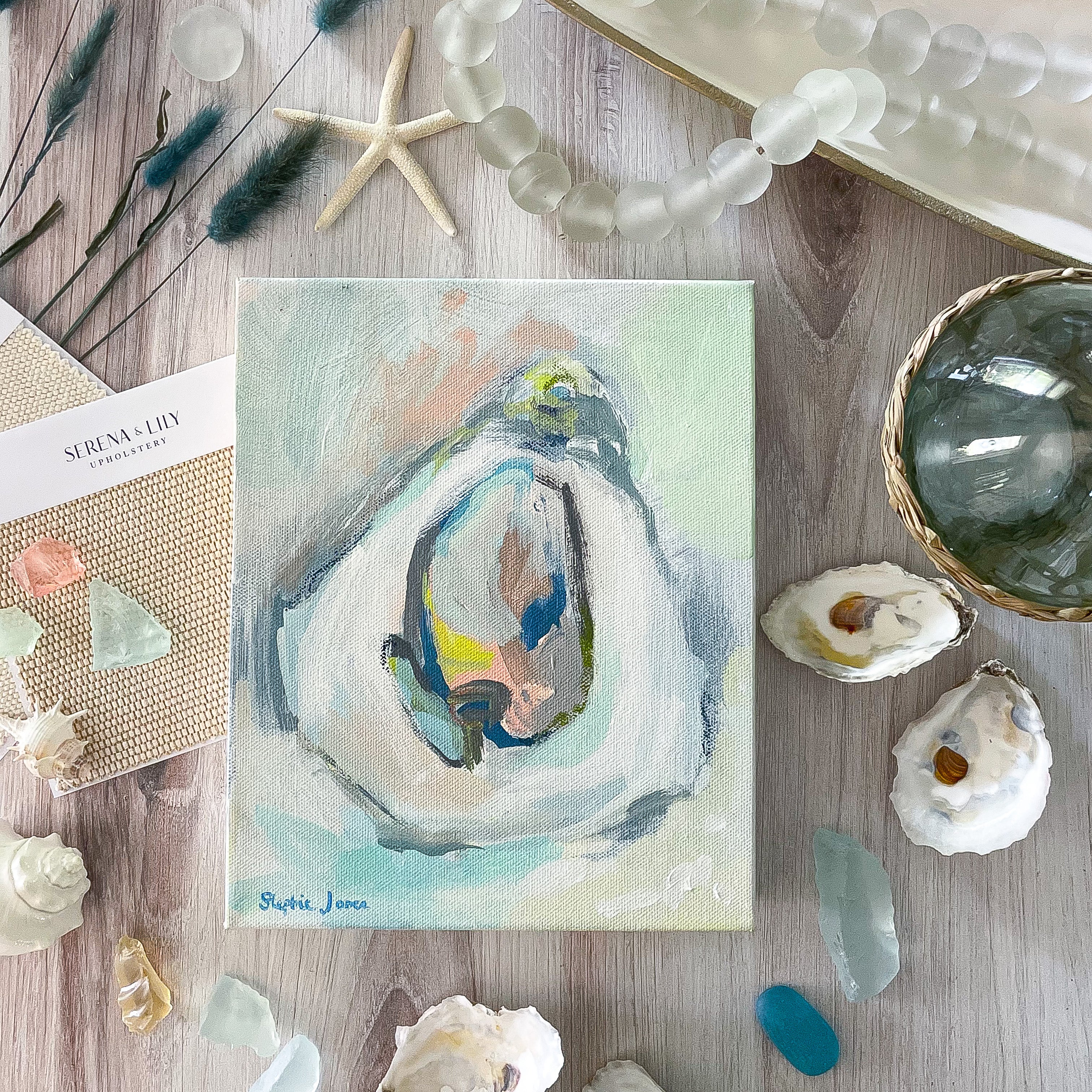 This original 8x10” acrylic oyster painting by Stephie Jones features a 1.5" gallery wrapped canvas edge with painted sides. It adds a sophisticated, summery, coastal vibe to your home.