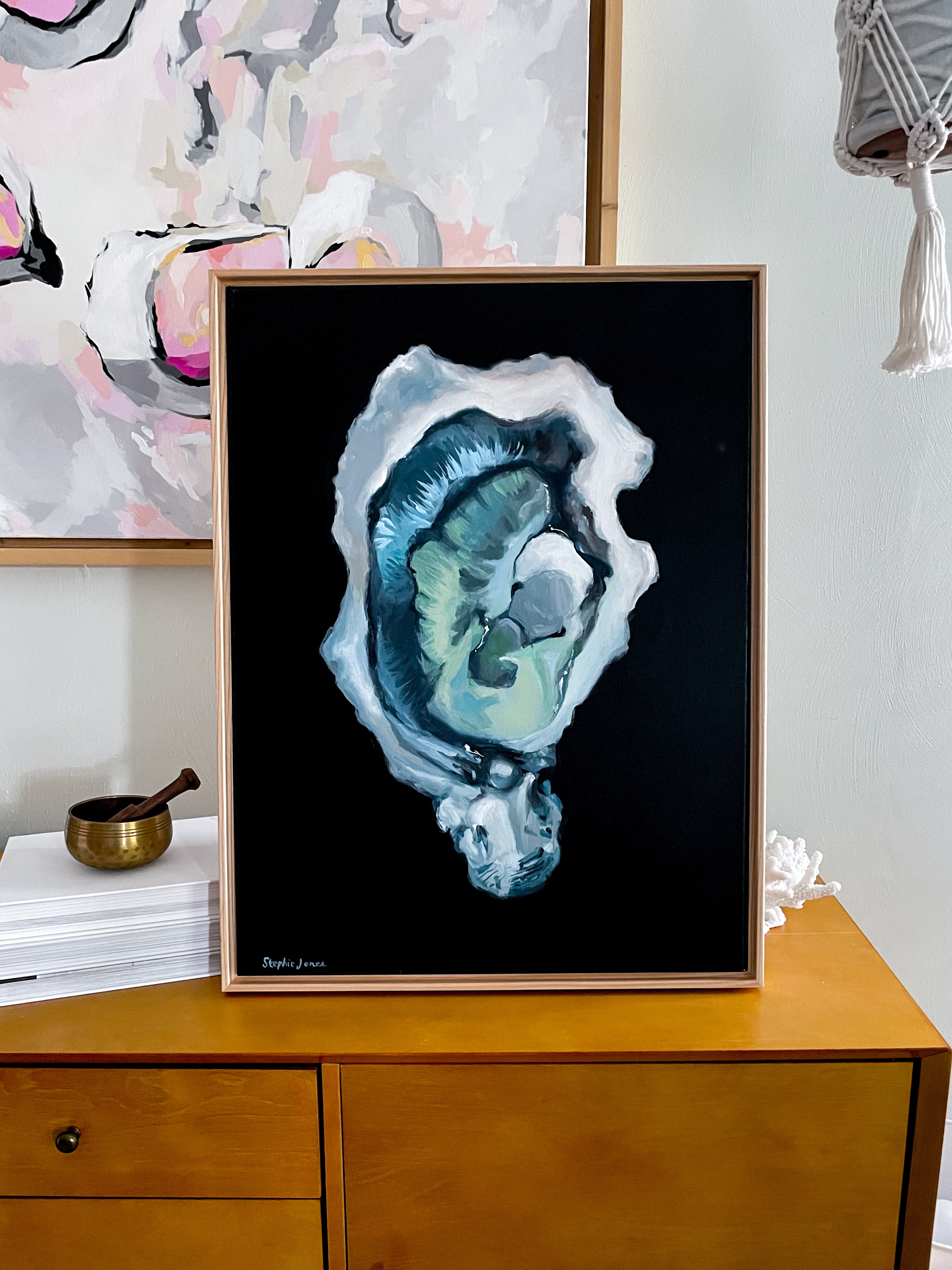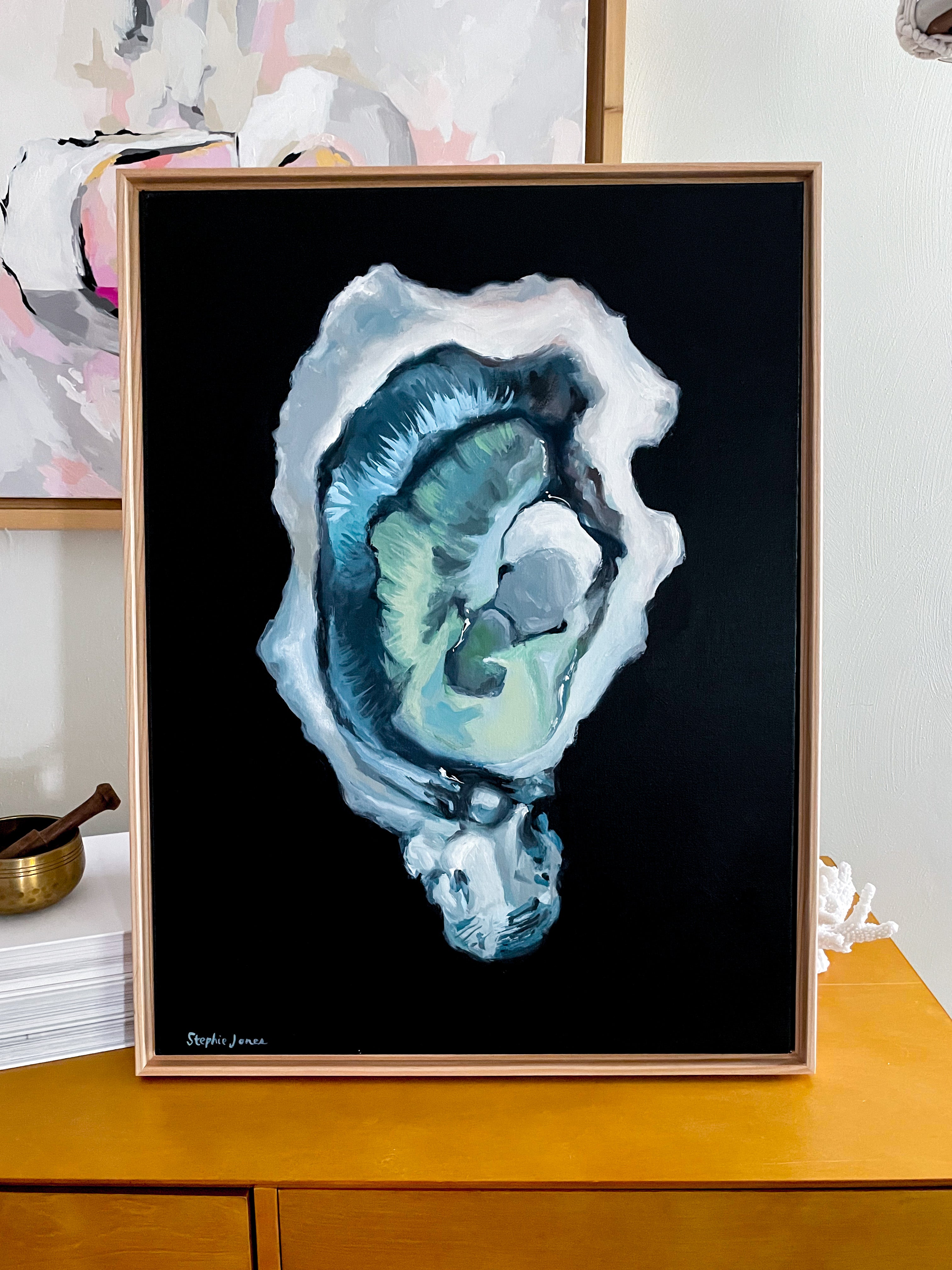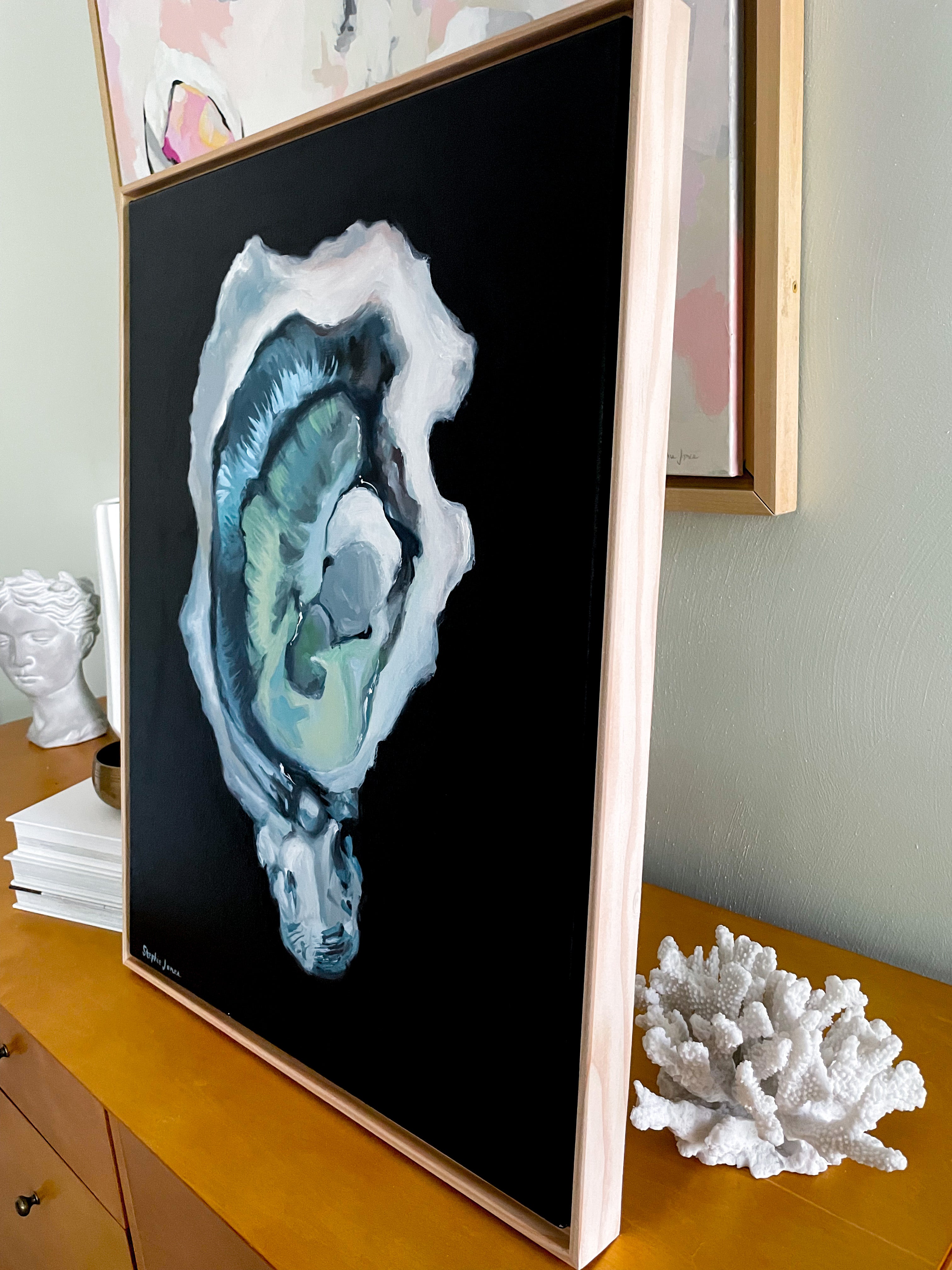 18"x24" acrylic on canvas, natural wood float frame. Wired and ready to hang.