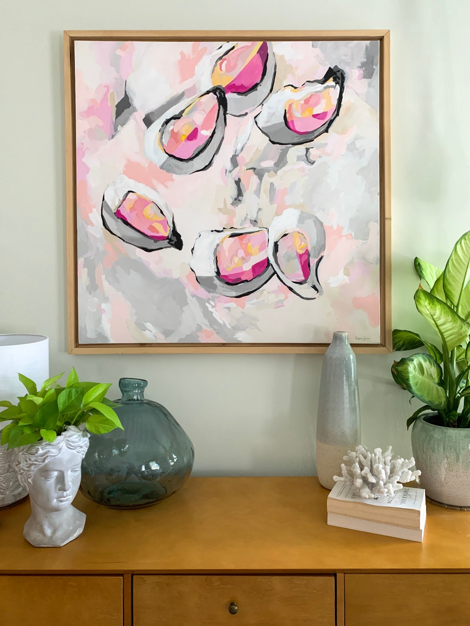 36"x36" in handcrafted poplar float frame. Wired and ready to hang.