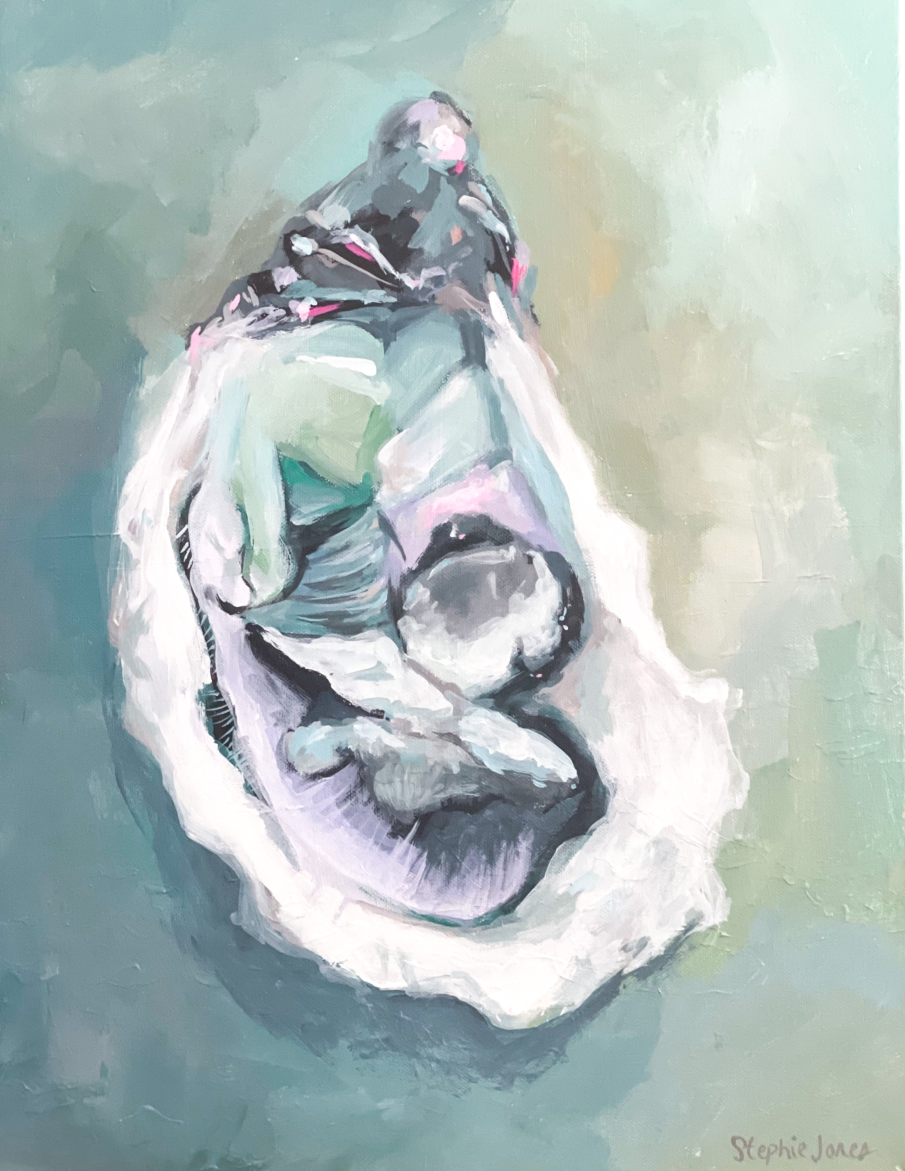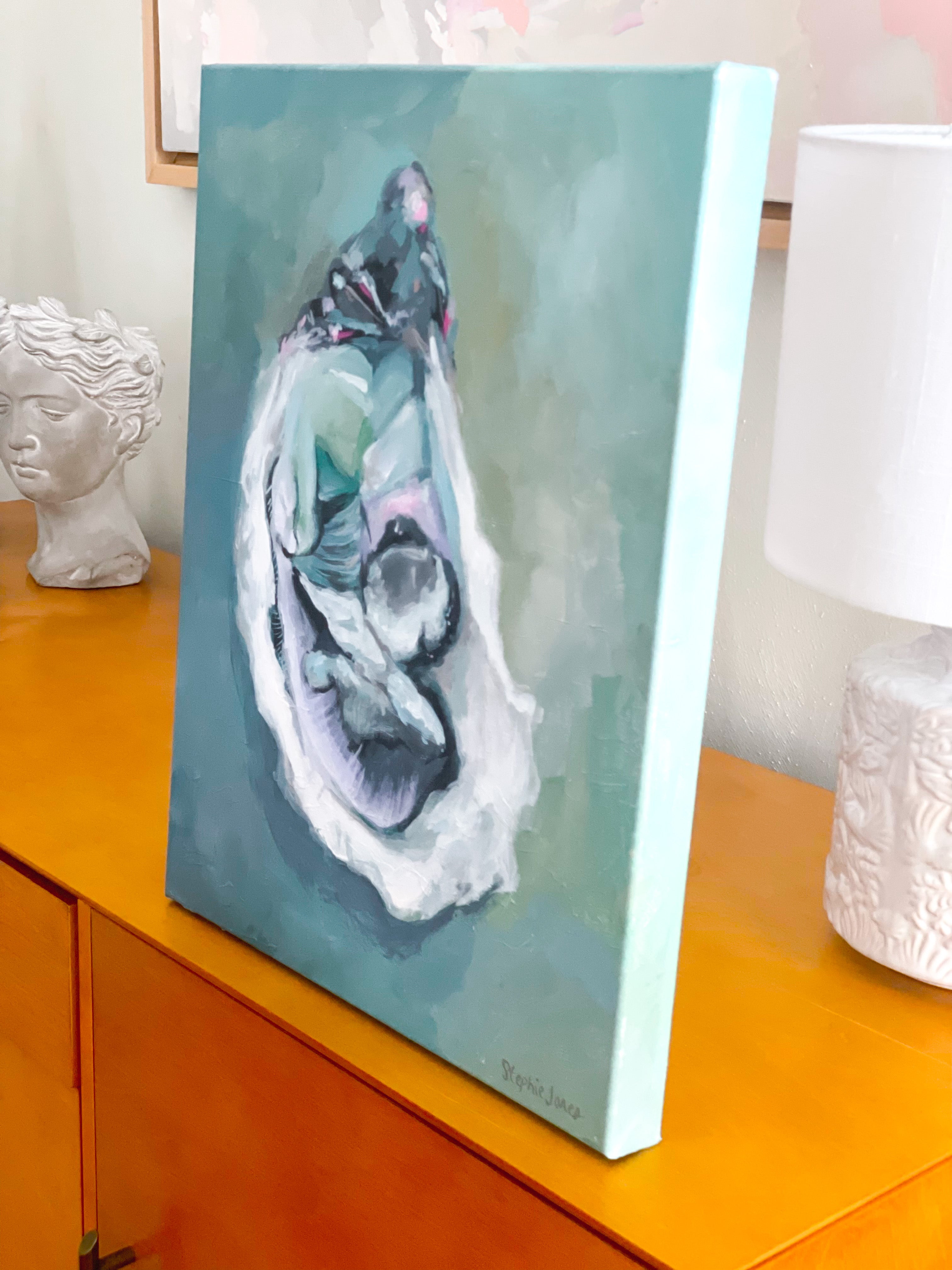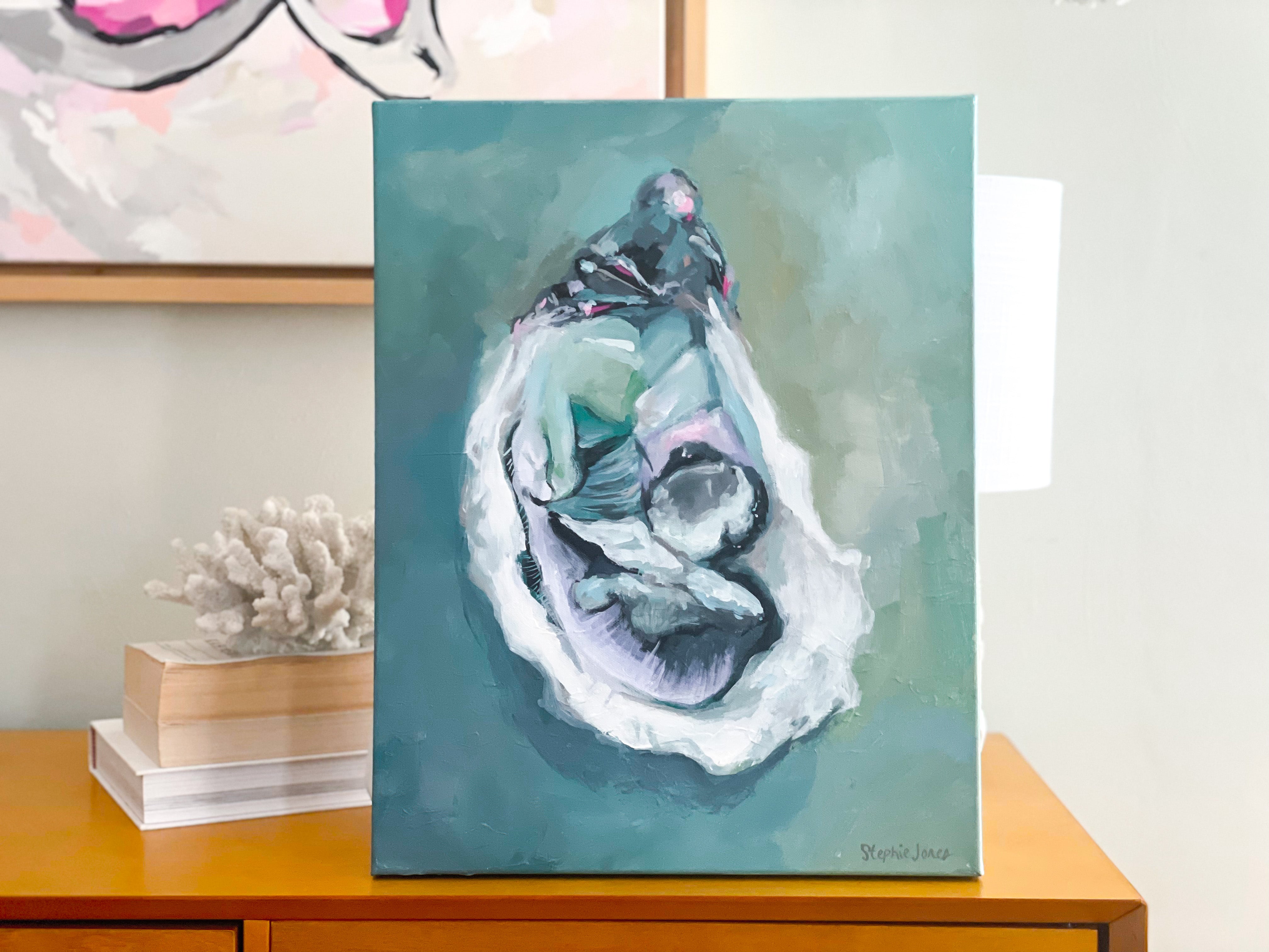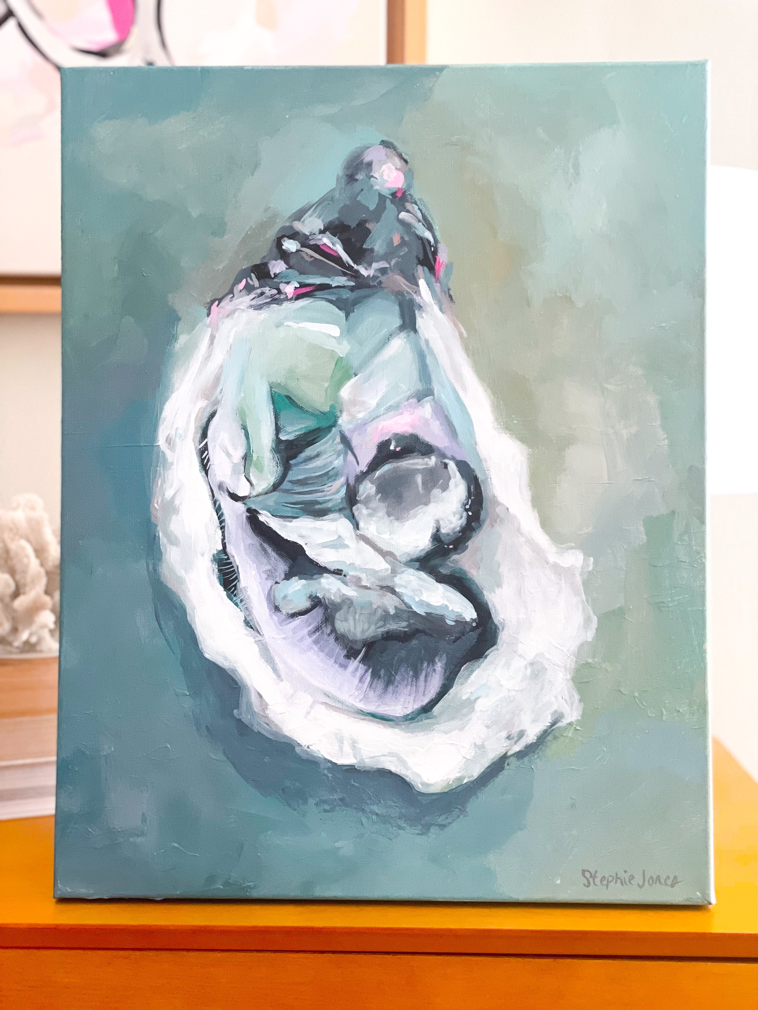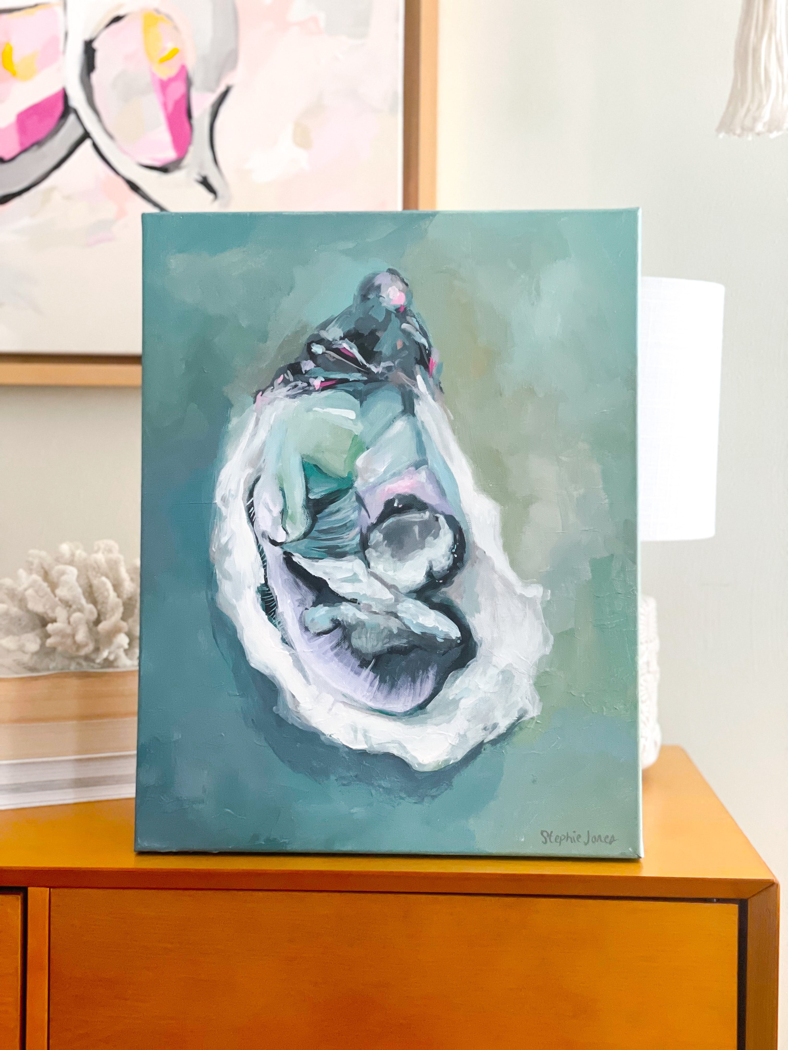 This original 14x18” acrylic oyster painting by Stephie Jones features a 1.5" gallery wrapped canvas edge with painted sides. Wired and ready to hang. It adds a sophisticated, summery, coastal vibe to your home.