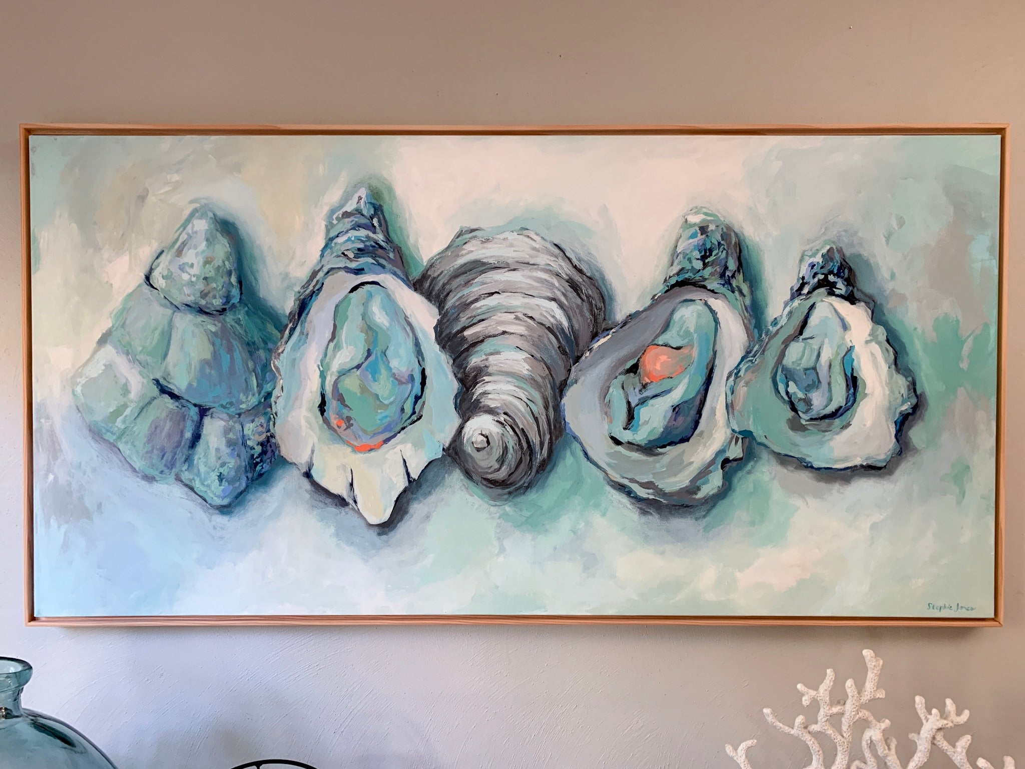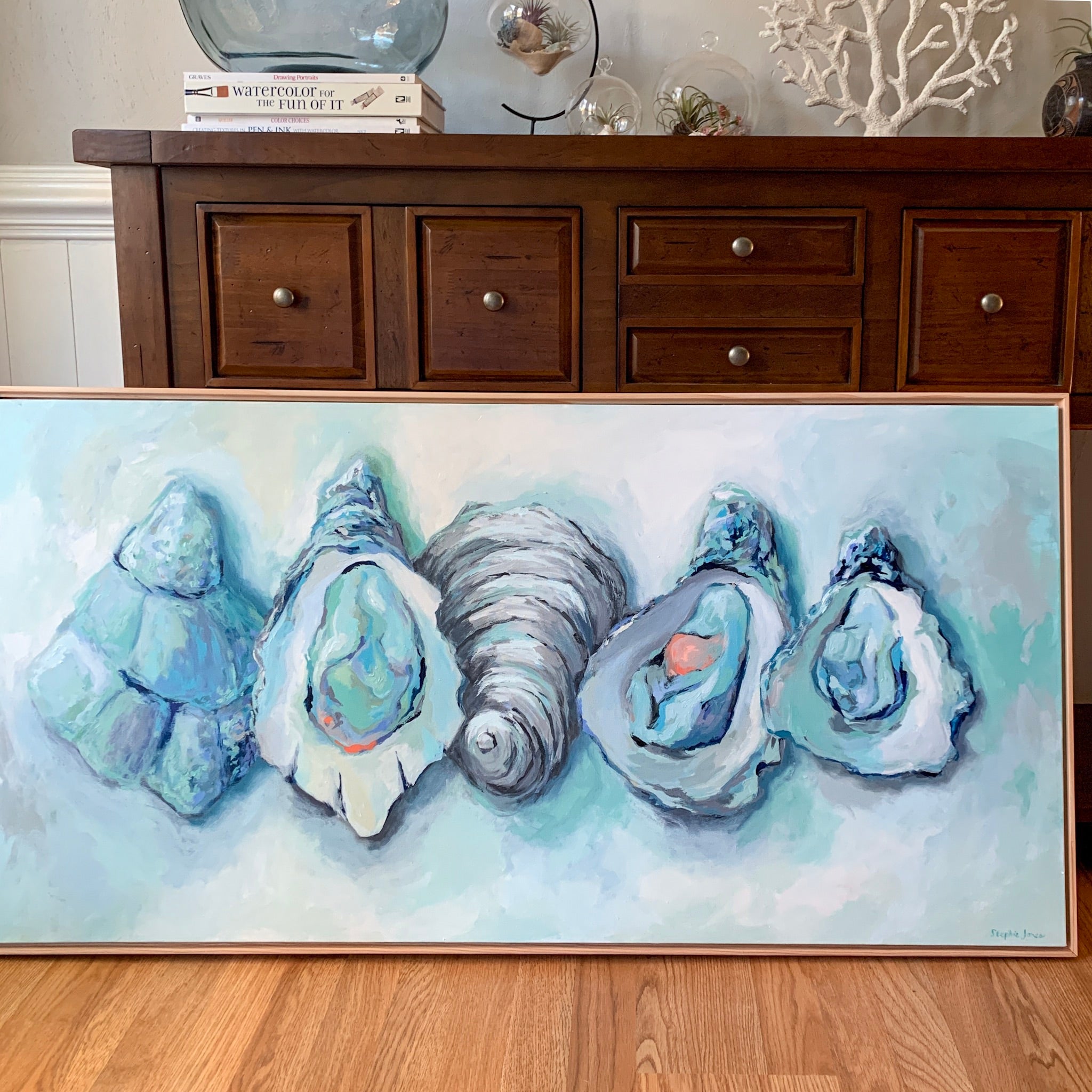 48“ x 24“ acrylic on canvas, framed in a natural wood float frame. Wired and ready to hang.