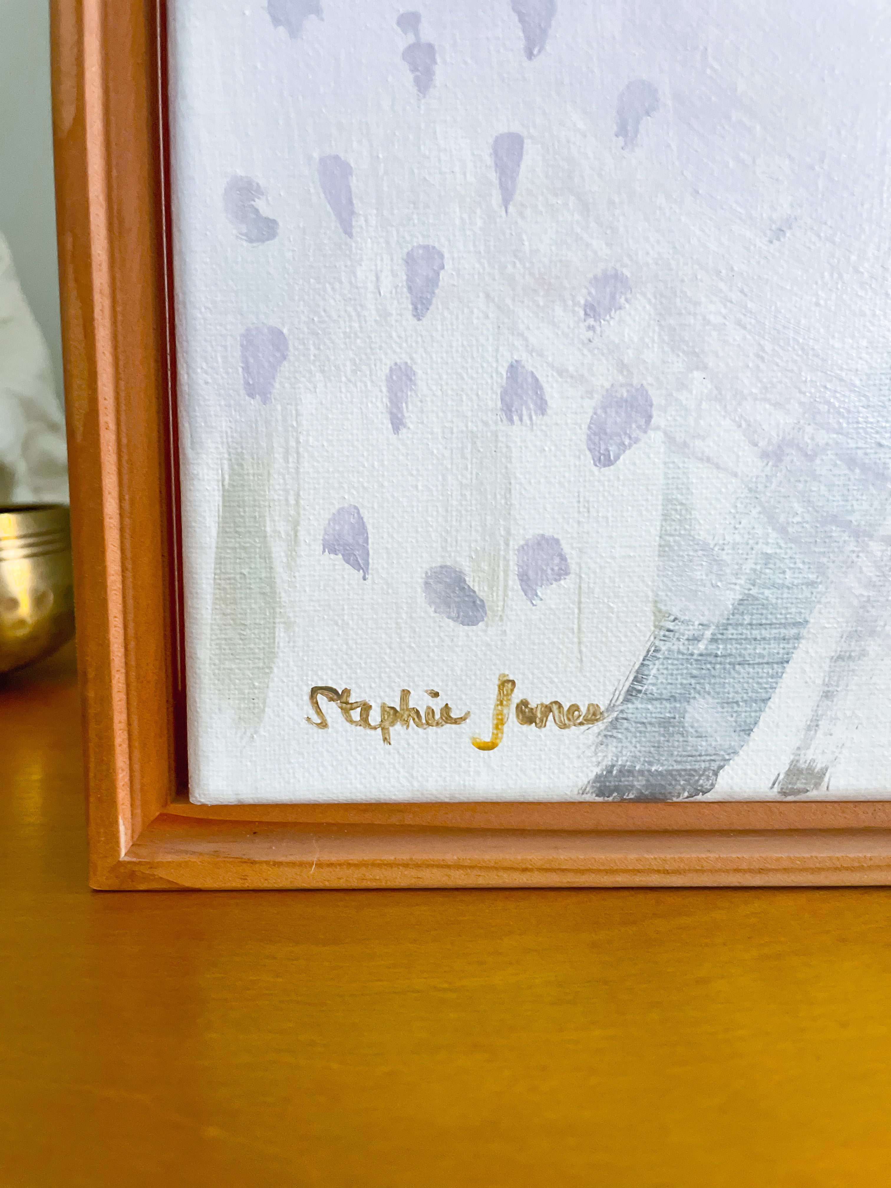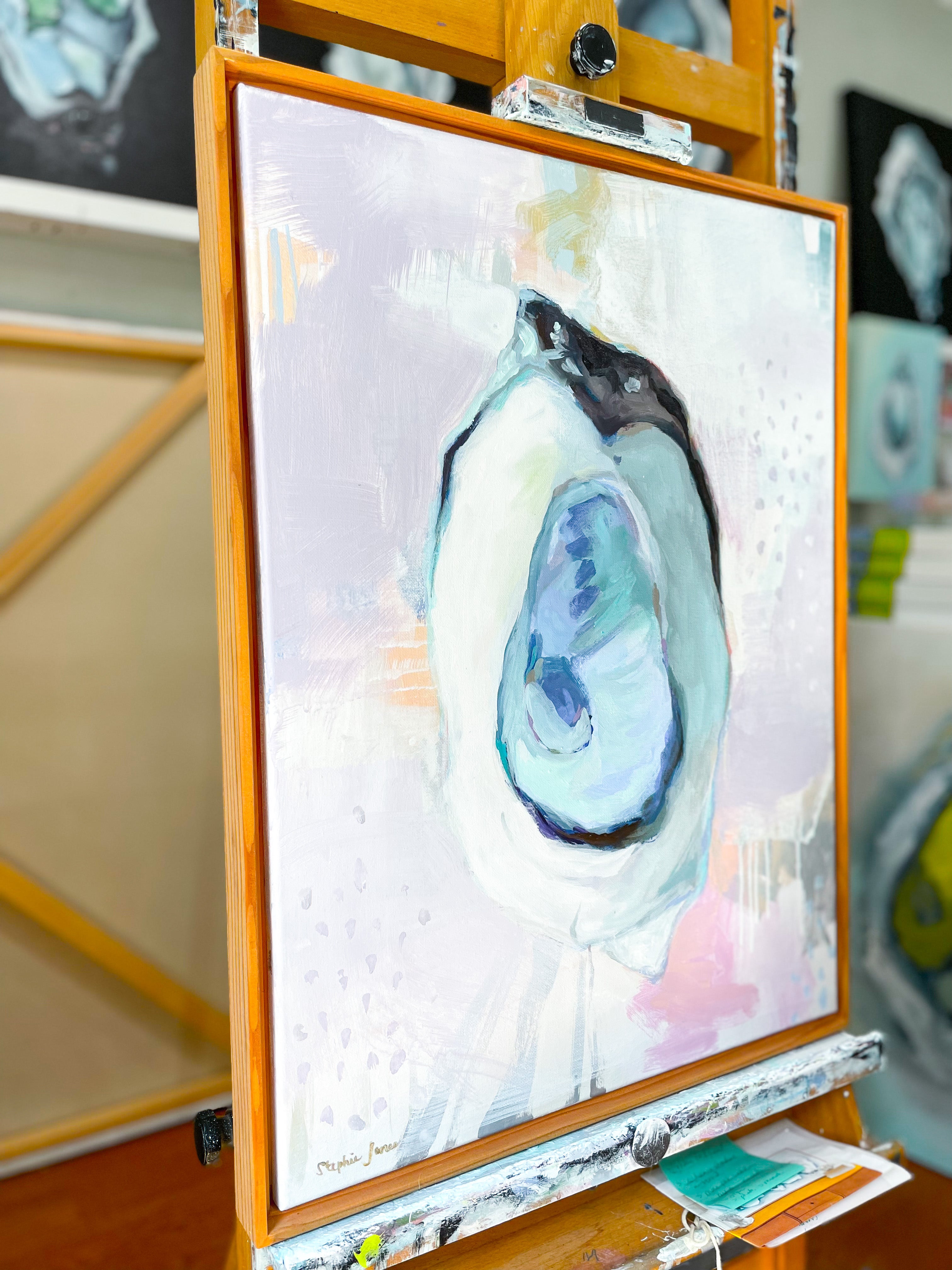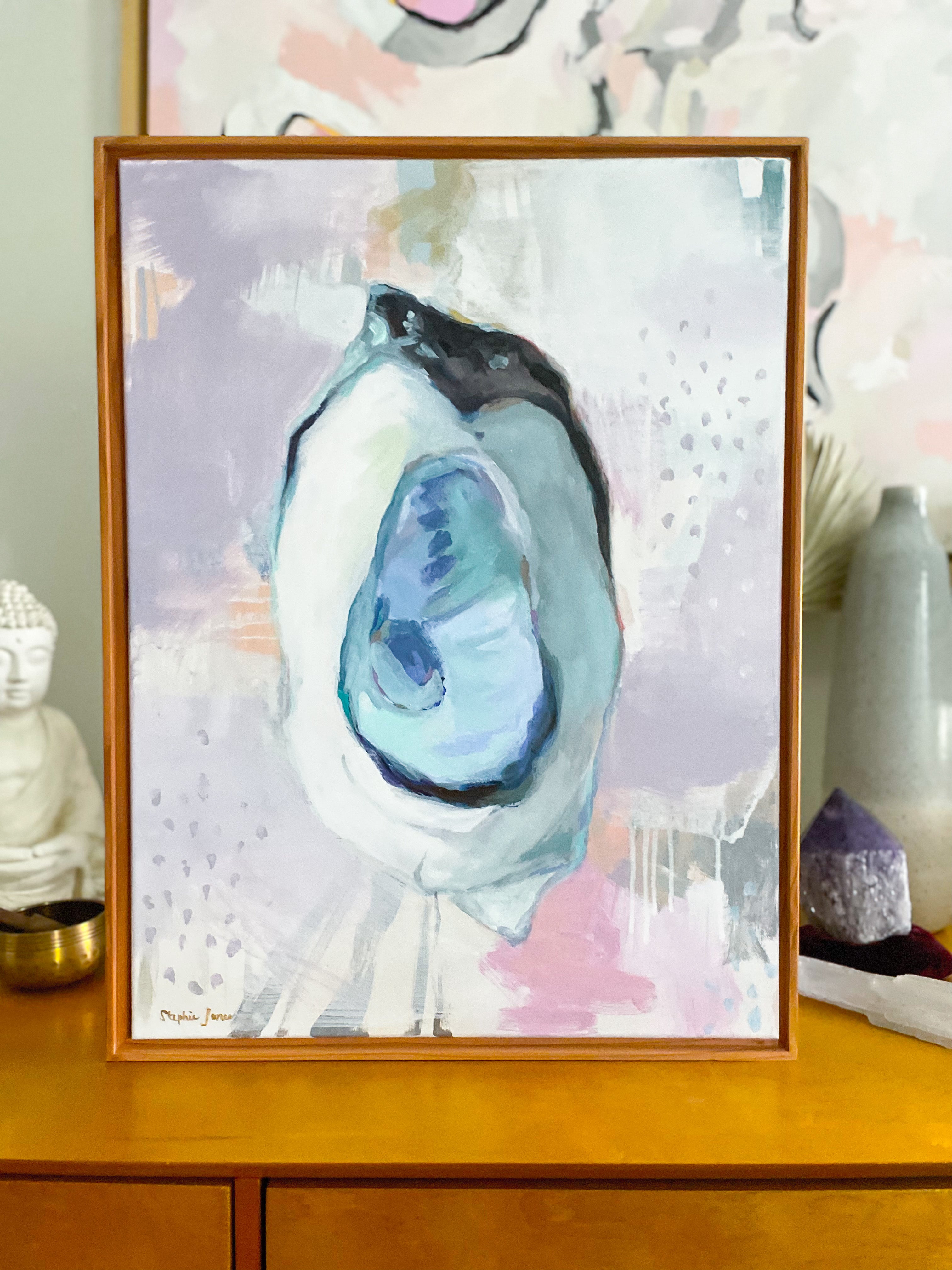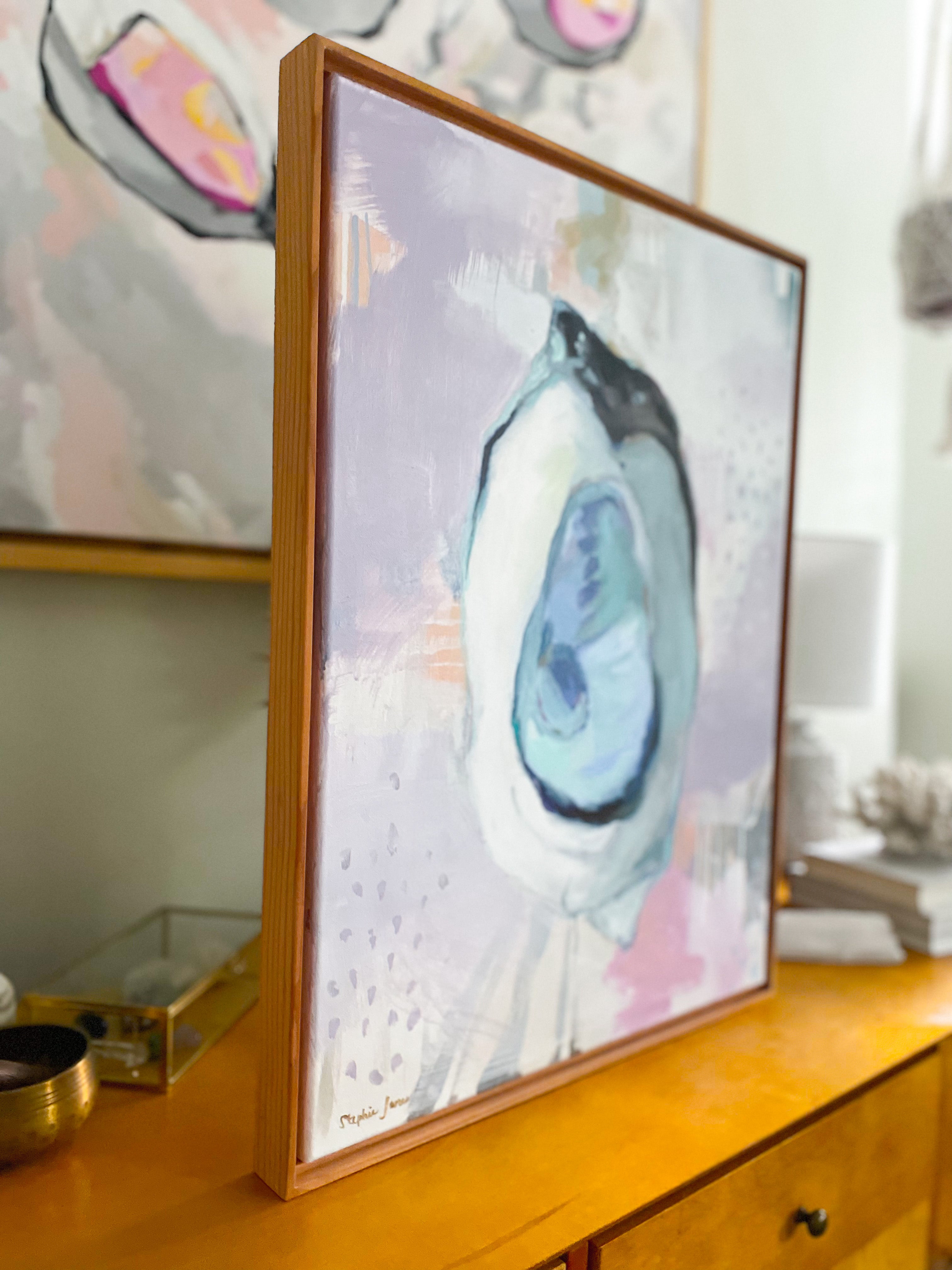 Acrylic on canvas, 18" x 24" framed in a natural wood float frame, wired and ready to hang.