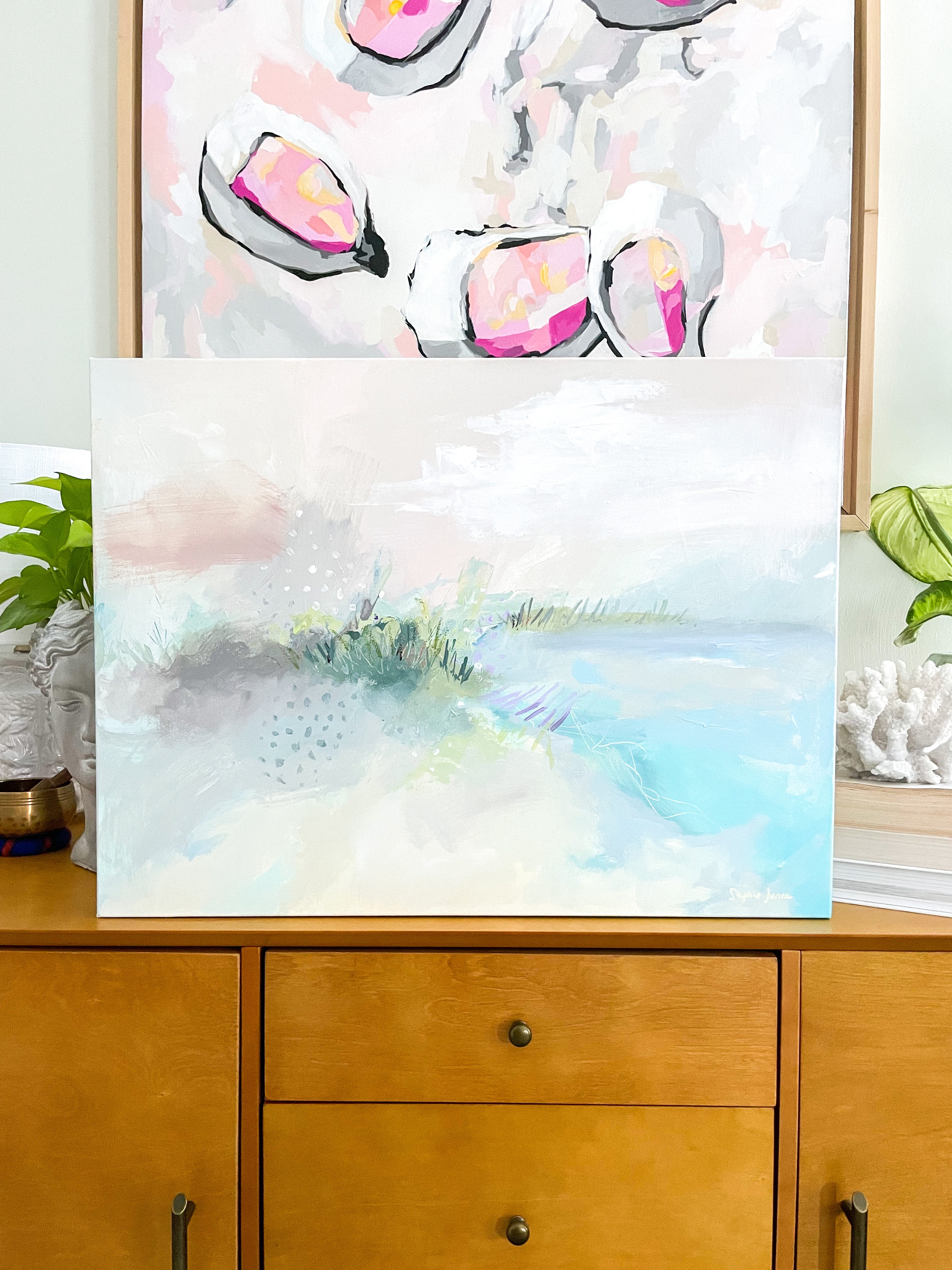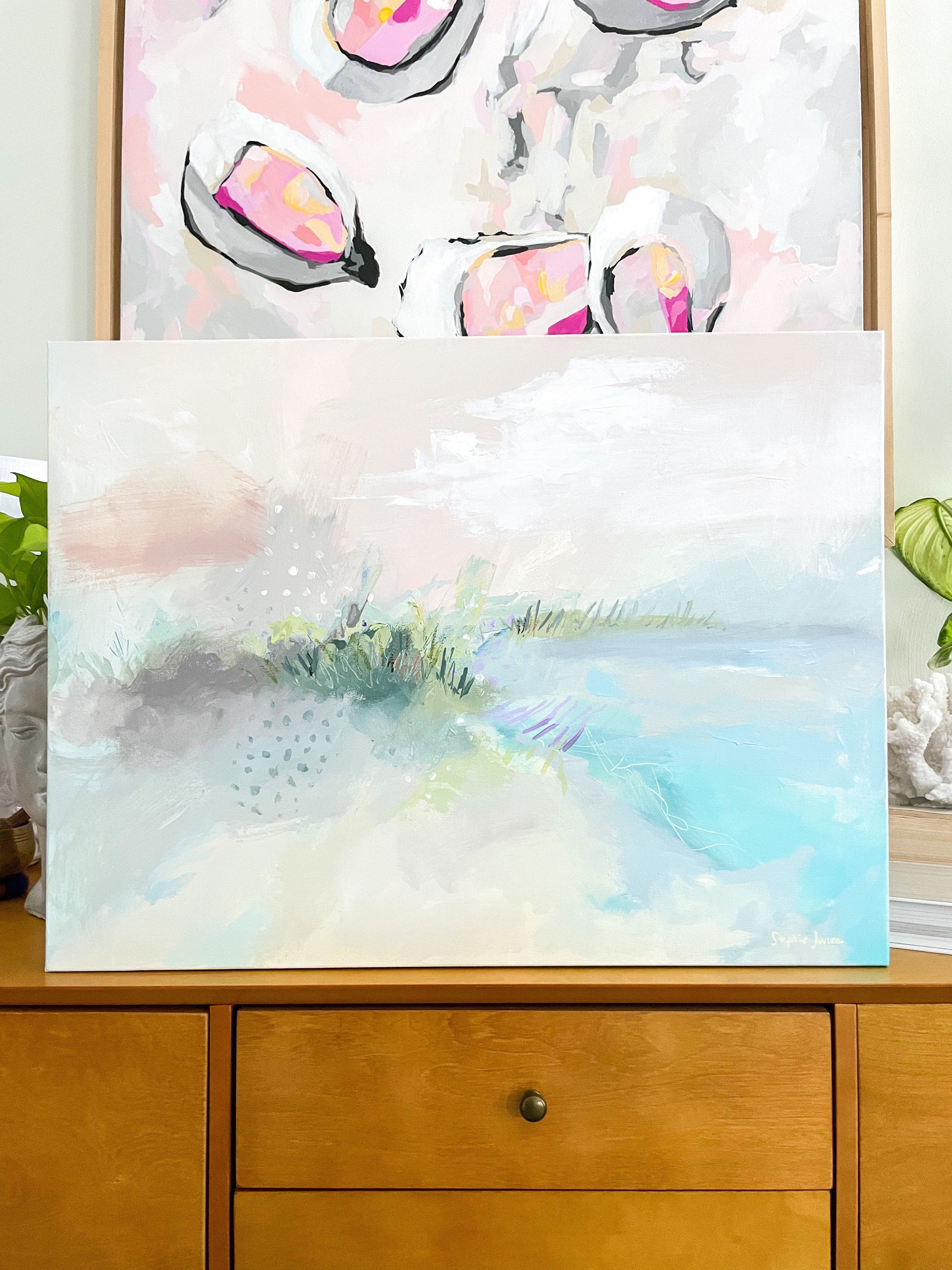 Brightly painted abstracted shoreline by Stephie Jones, acrylic on canvas, with pastel.