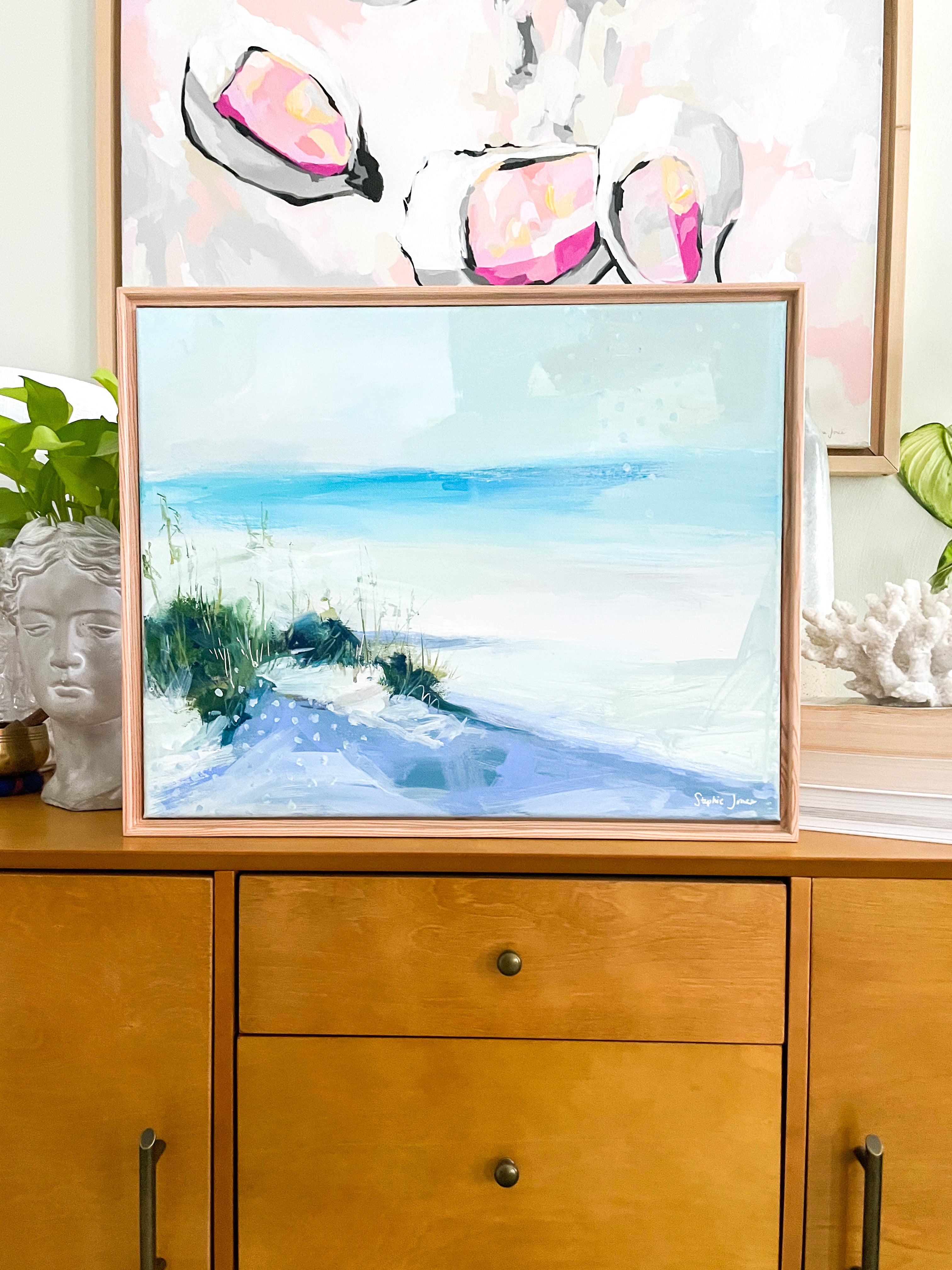 Brightly painted abstracted shoreline by Stephie Jones, acrylic on canvas.