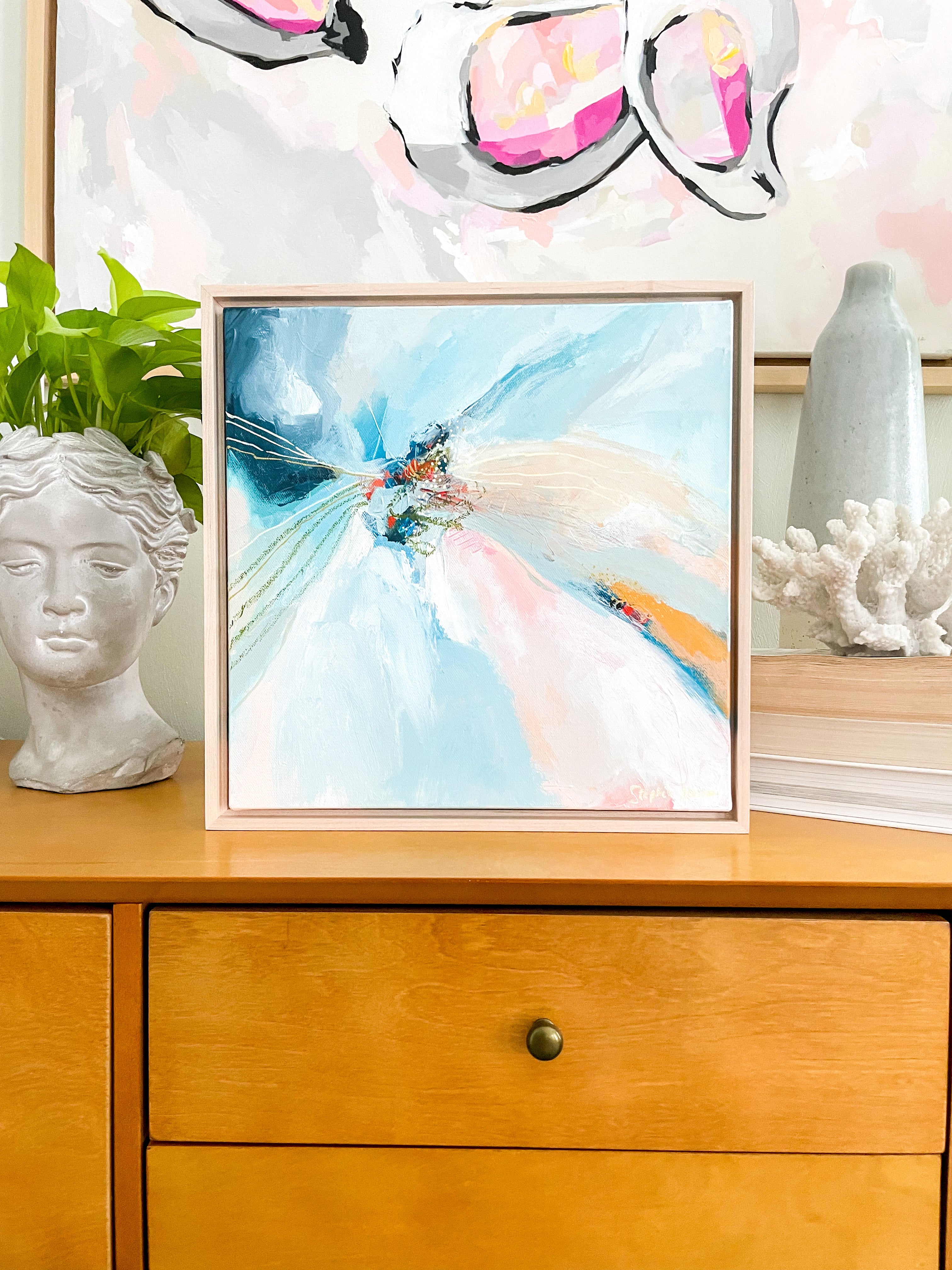 Brightly painted abstract by Stephie Jones, acrylic on canvas, with pastel.