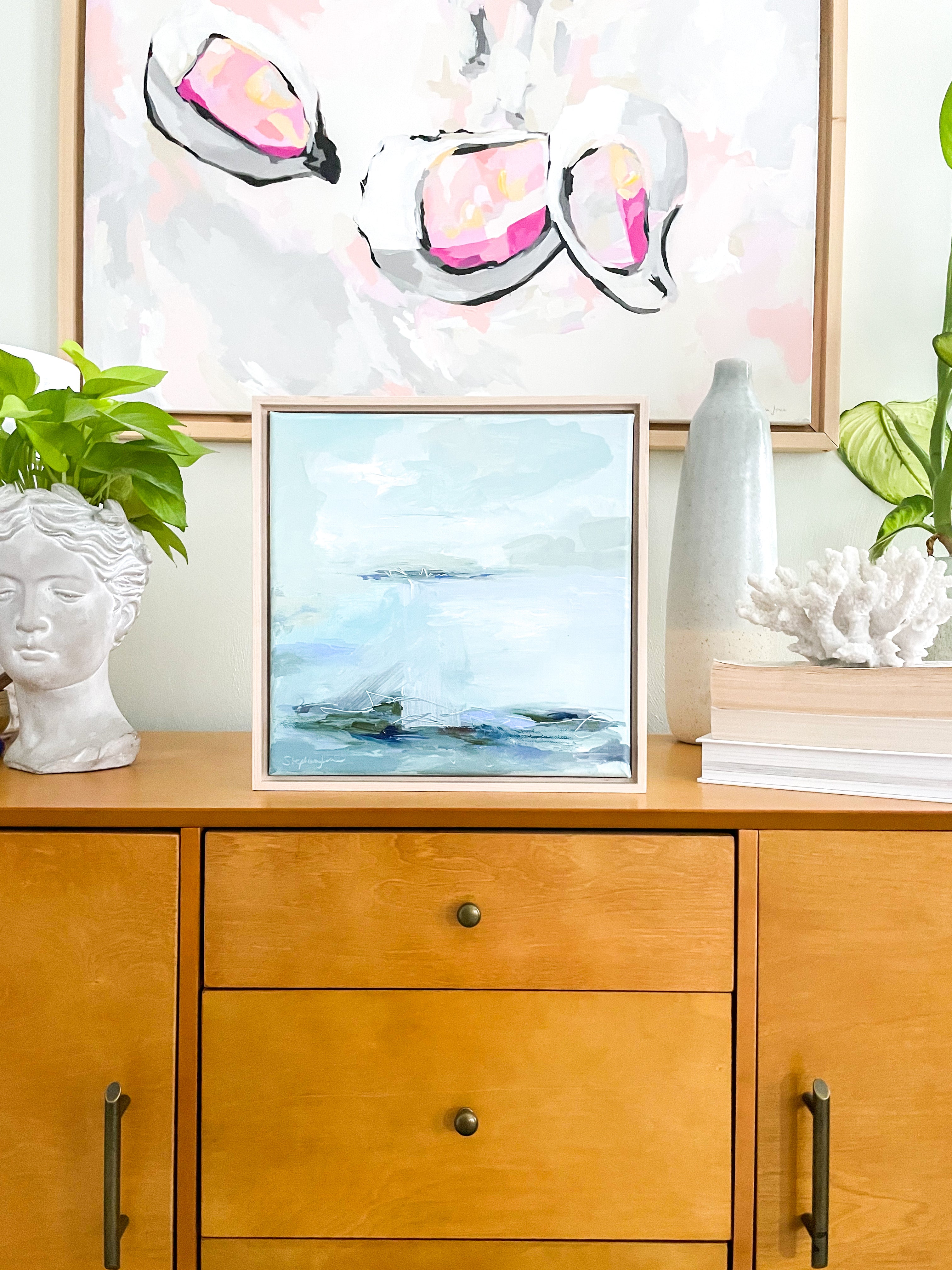 Framed in natural wood float frame, wired and ready to hang.