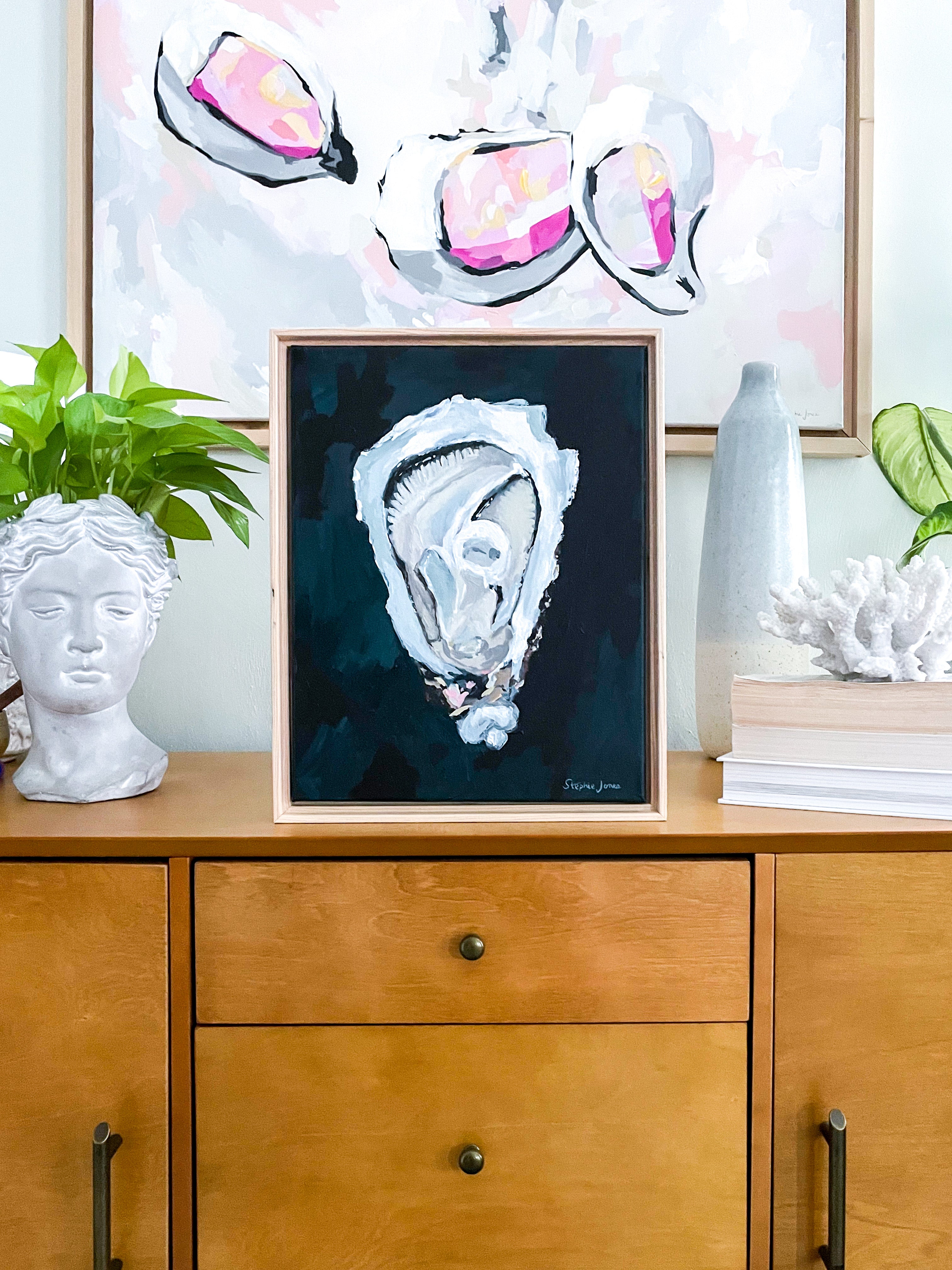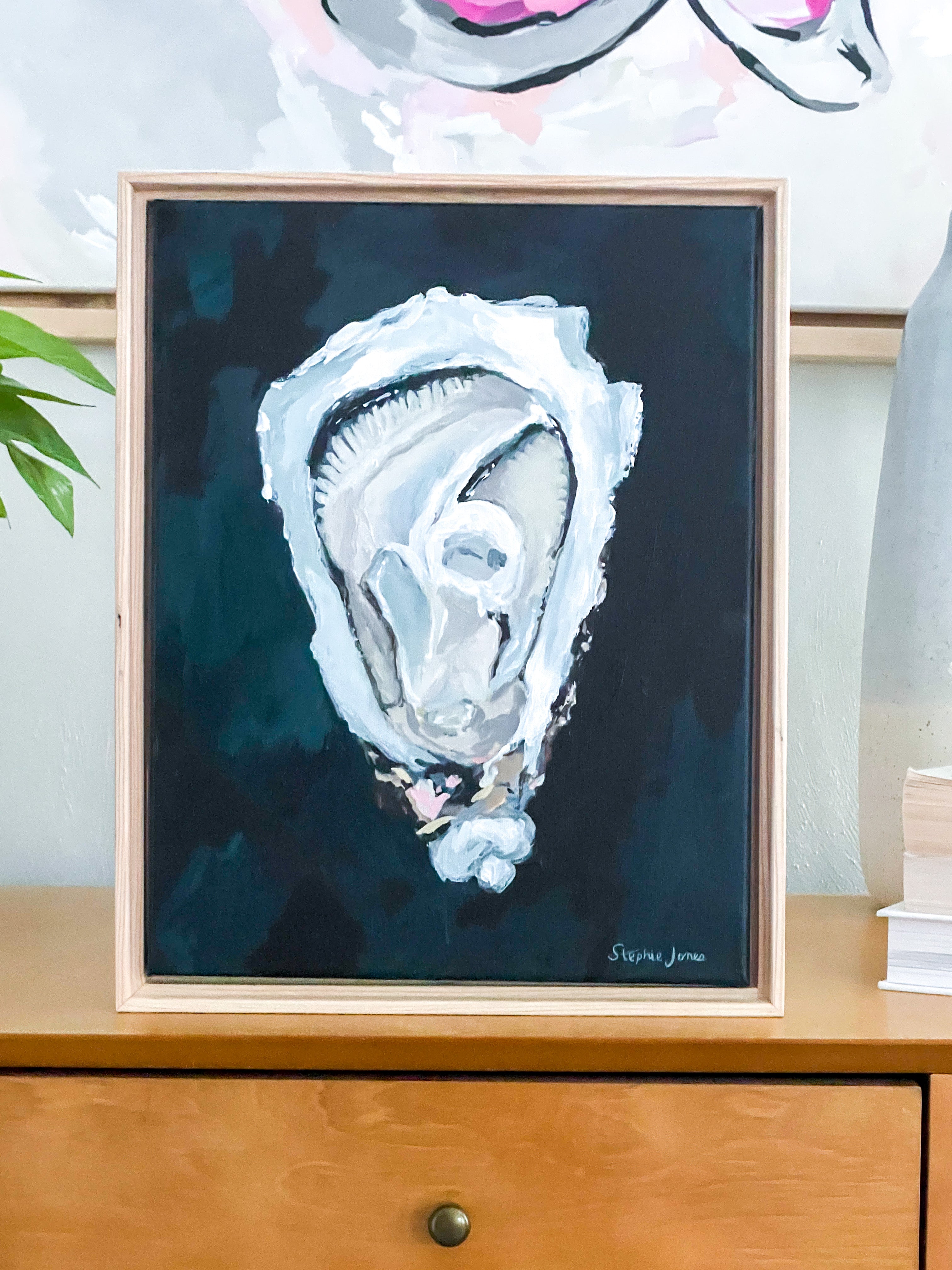 Brightly painted oyster by Stephie Jones, acrylic on canvas.