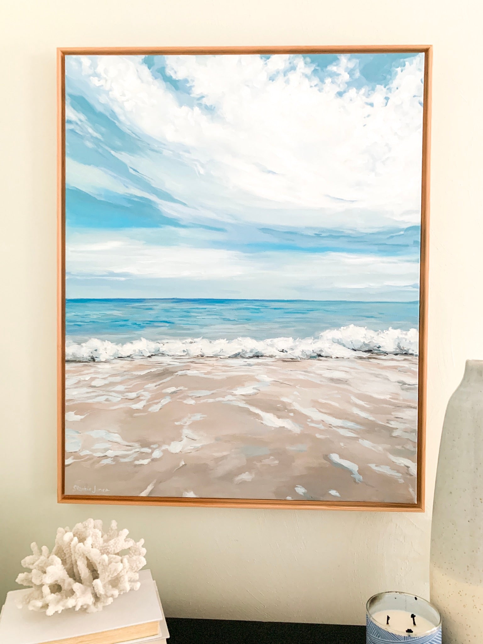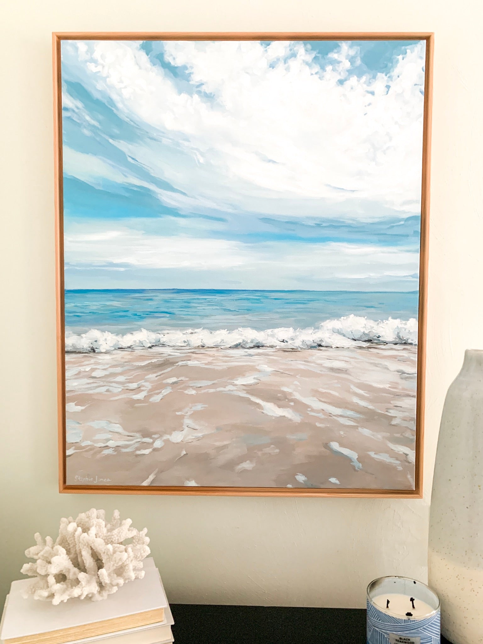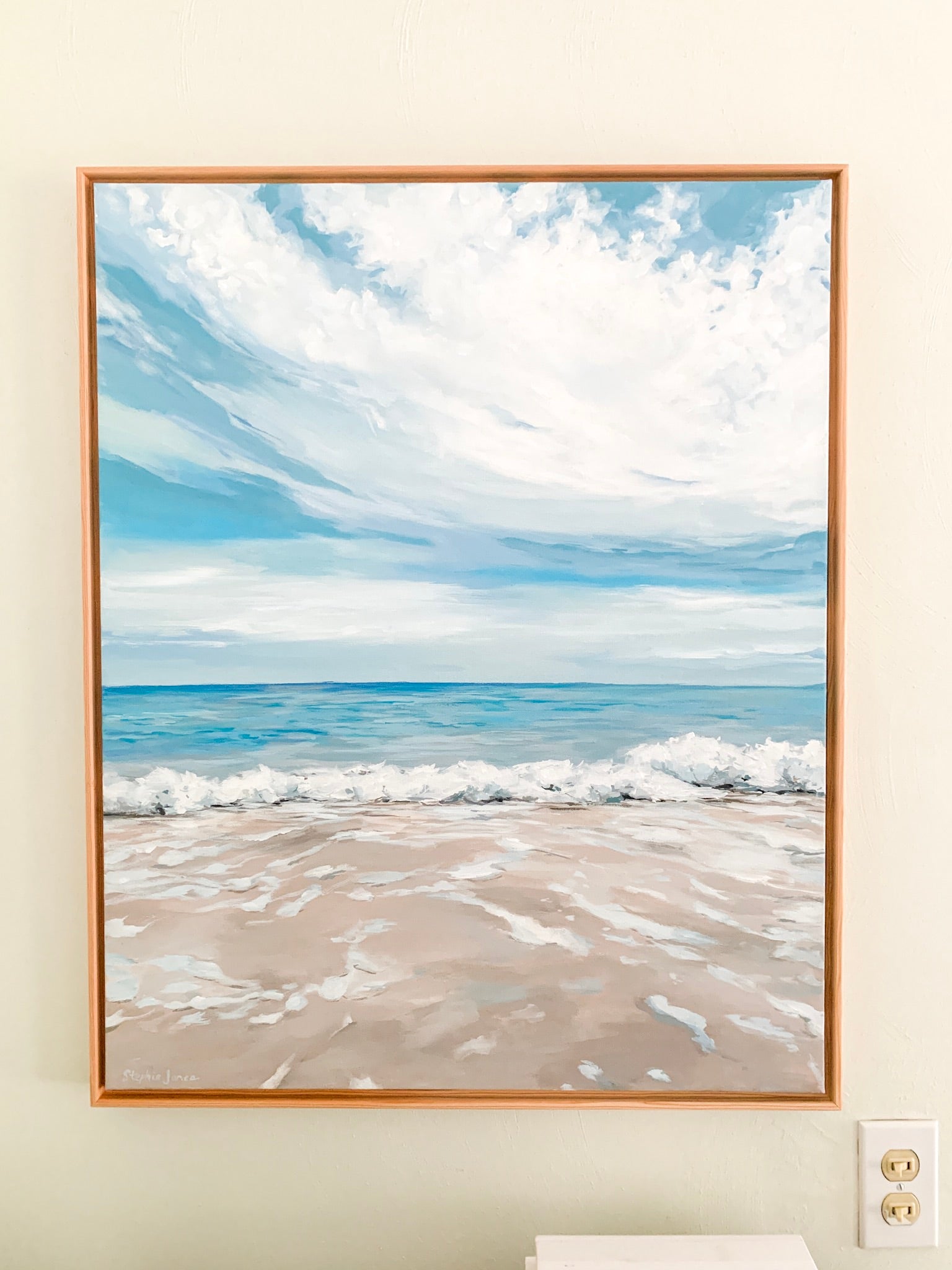 Acrylic on canvas, 25“ x 31“ framed in natural wood float frame, wired and ready to hang.