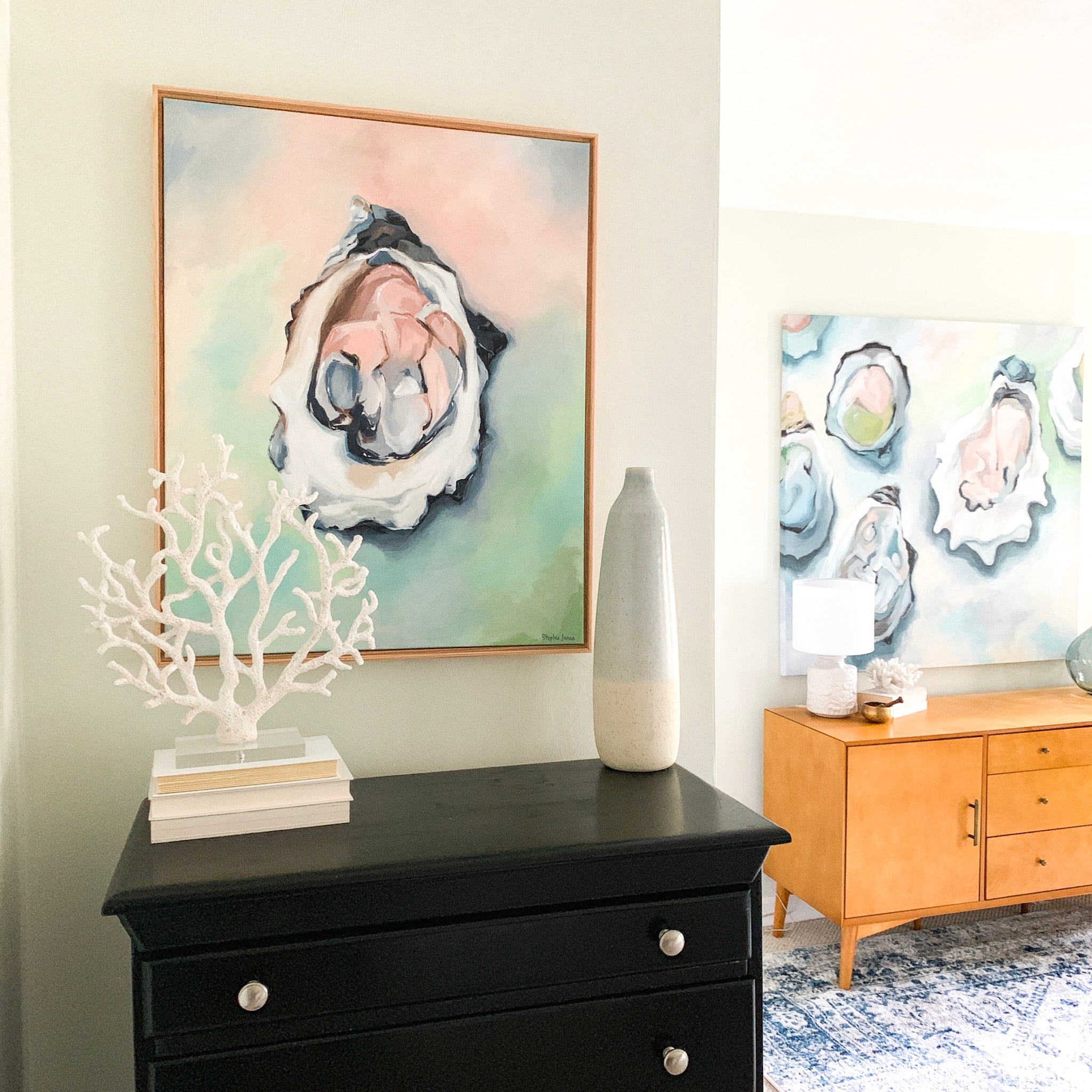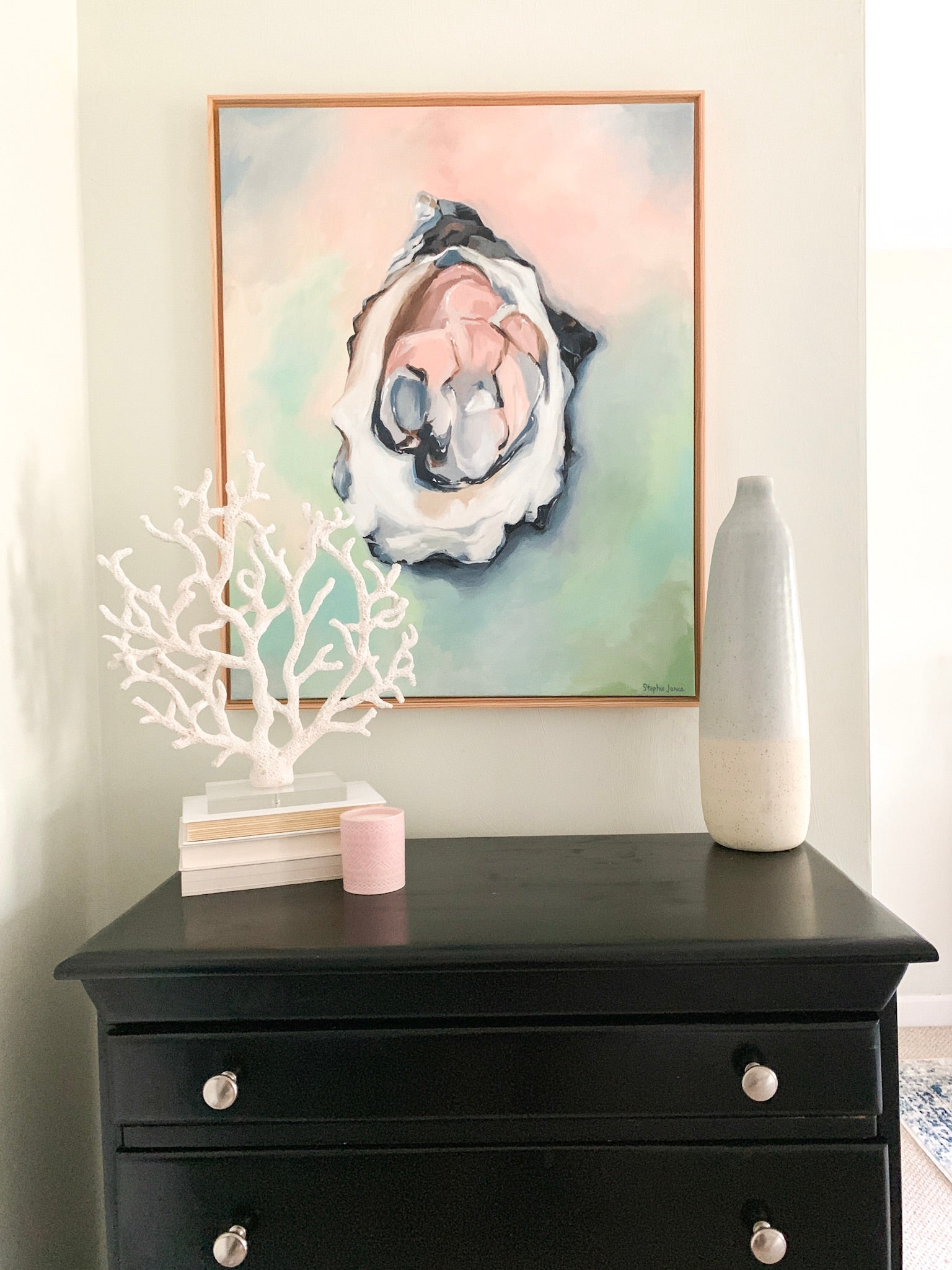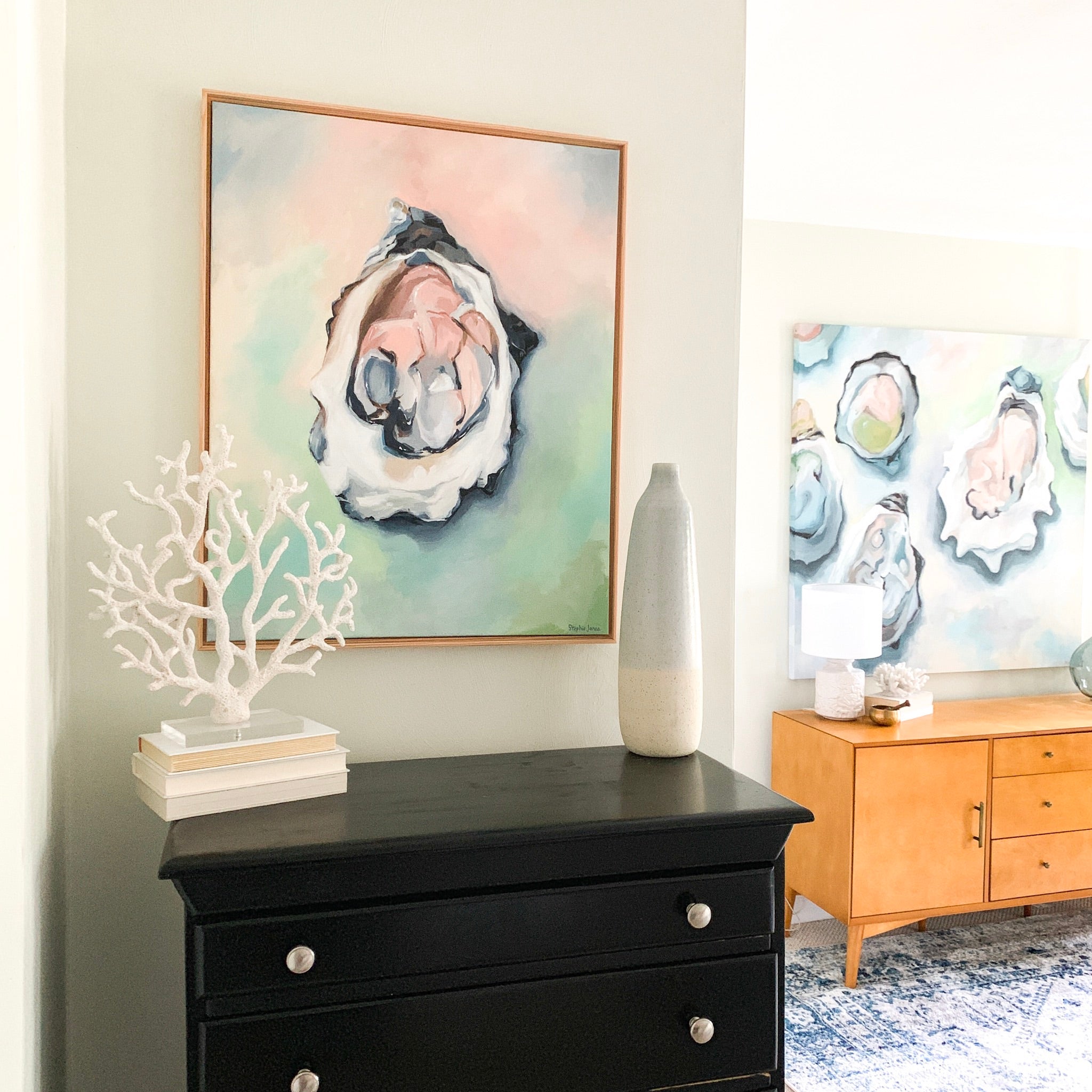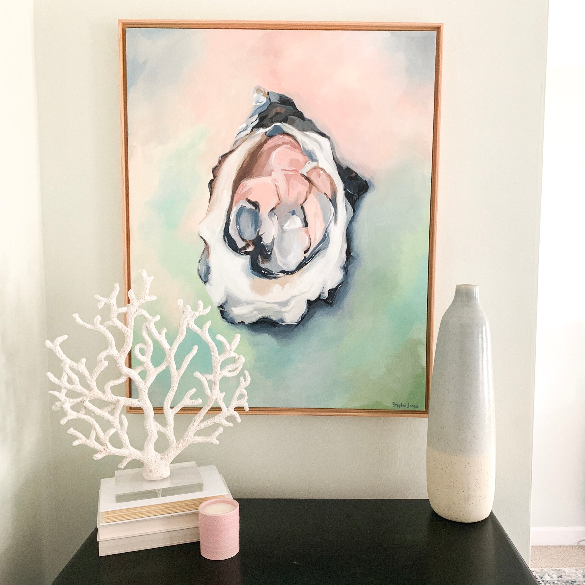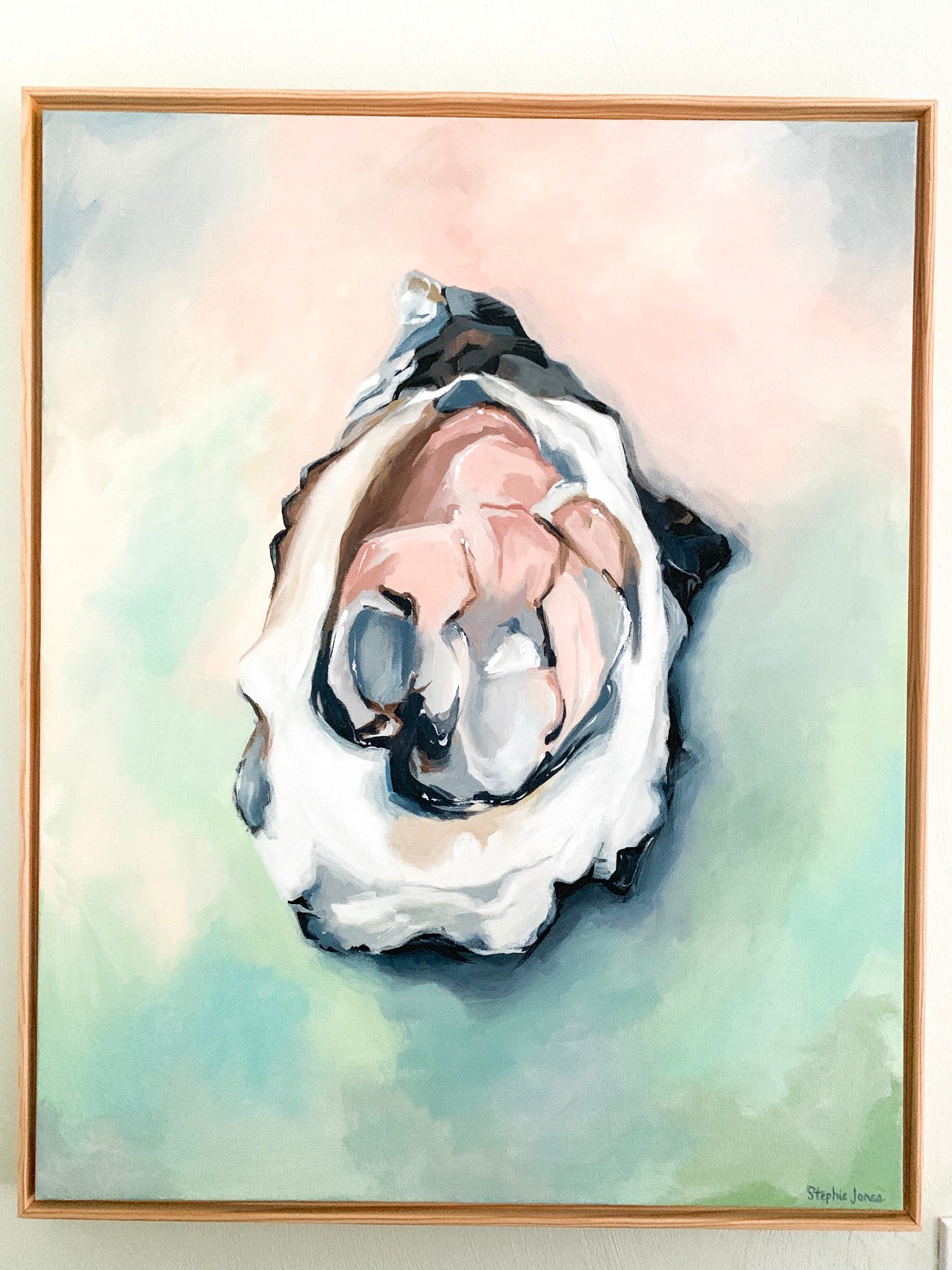 Acrylic on canvas, 25“ x 31“ framed in natural wood float frame, wired and ready to hang.