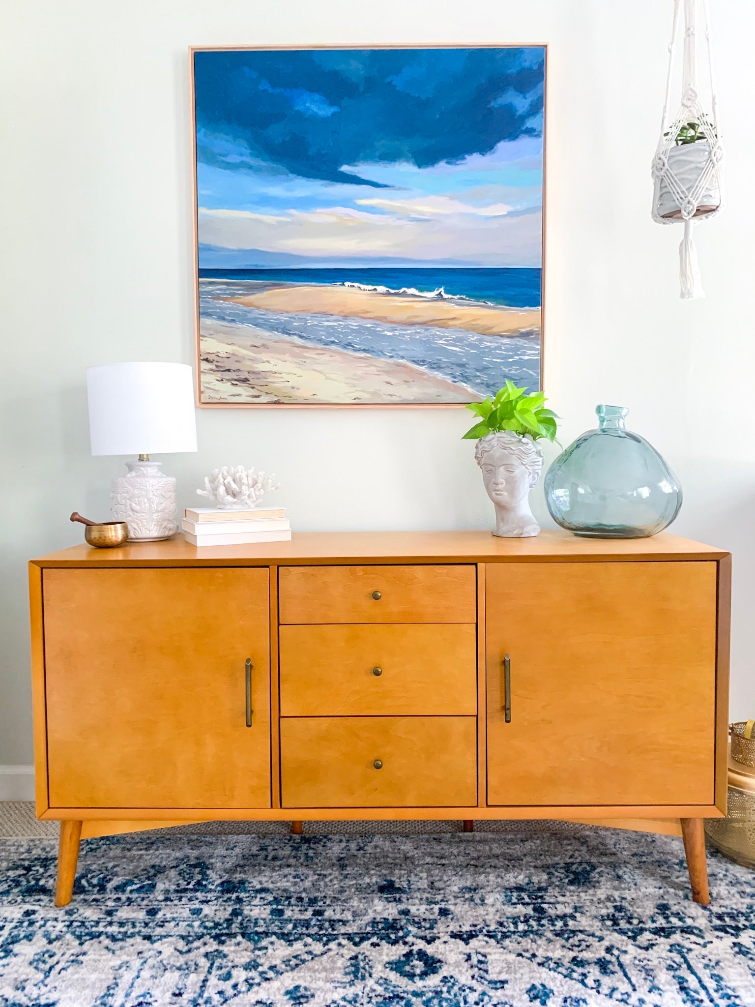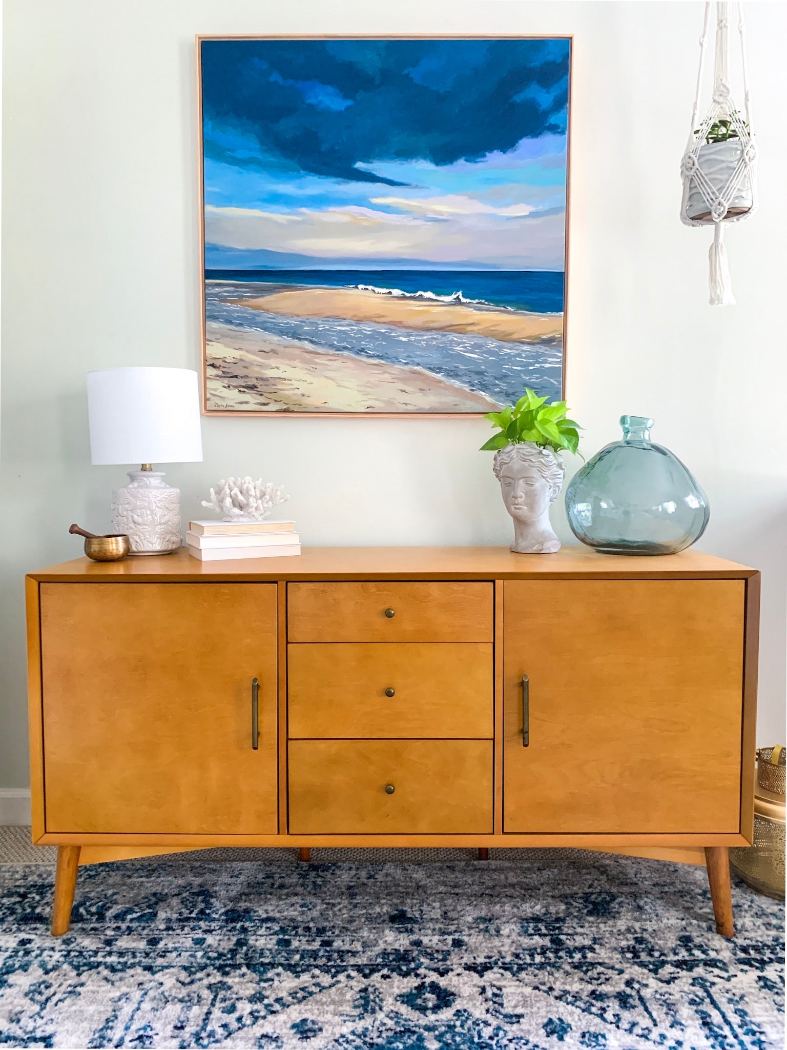 Acrylic on canvas, 37“ x 37“ framed in natural wood float frame, wired and ready to hang.