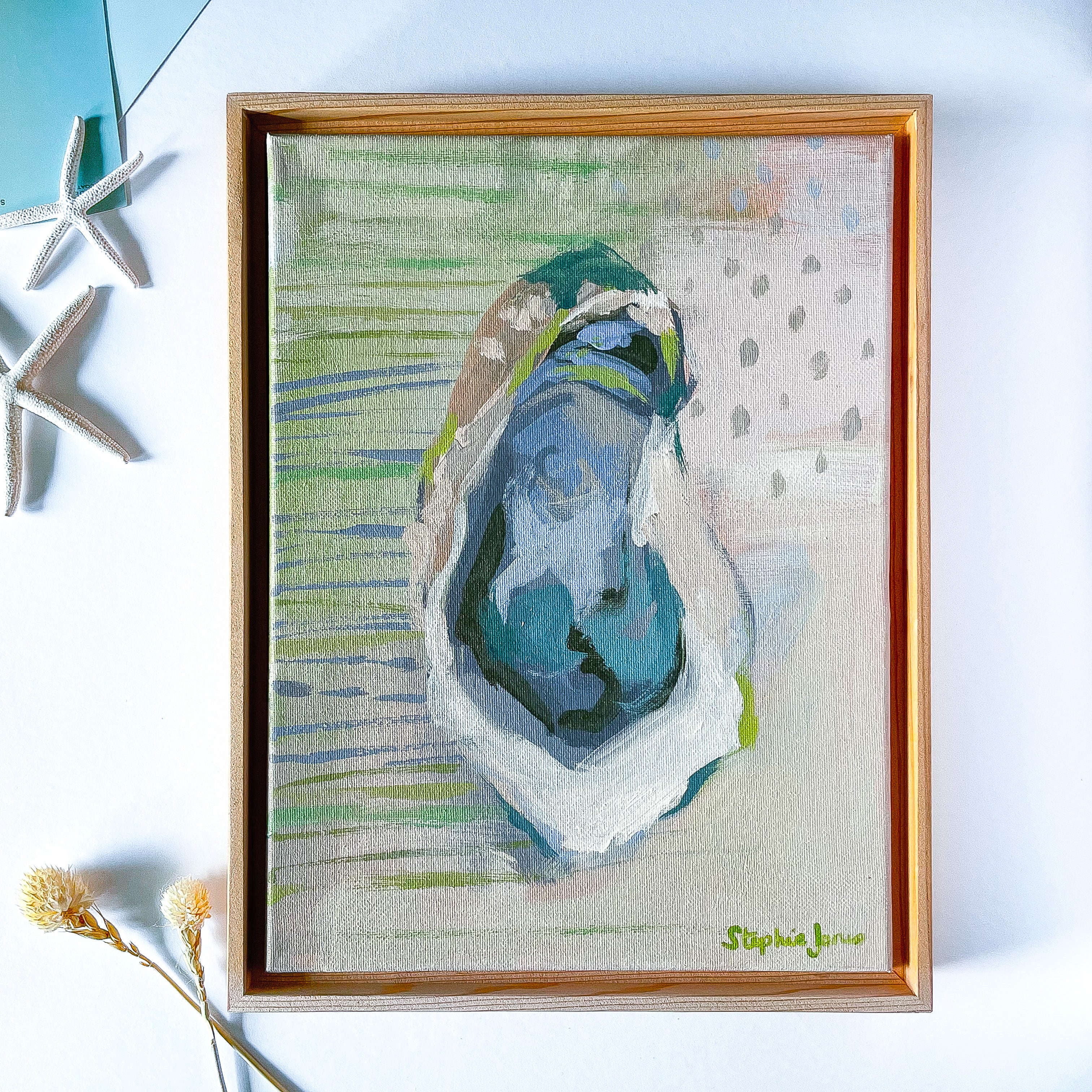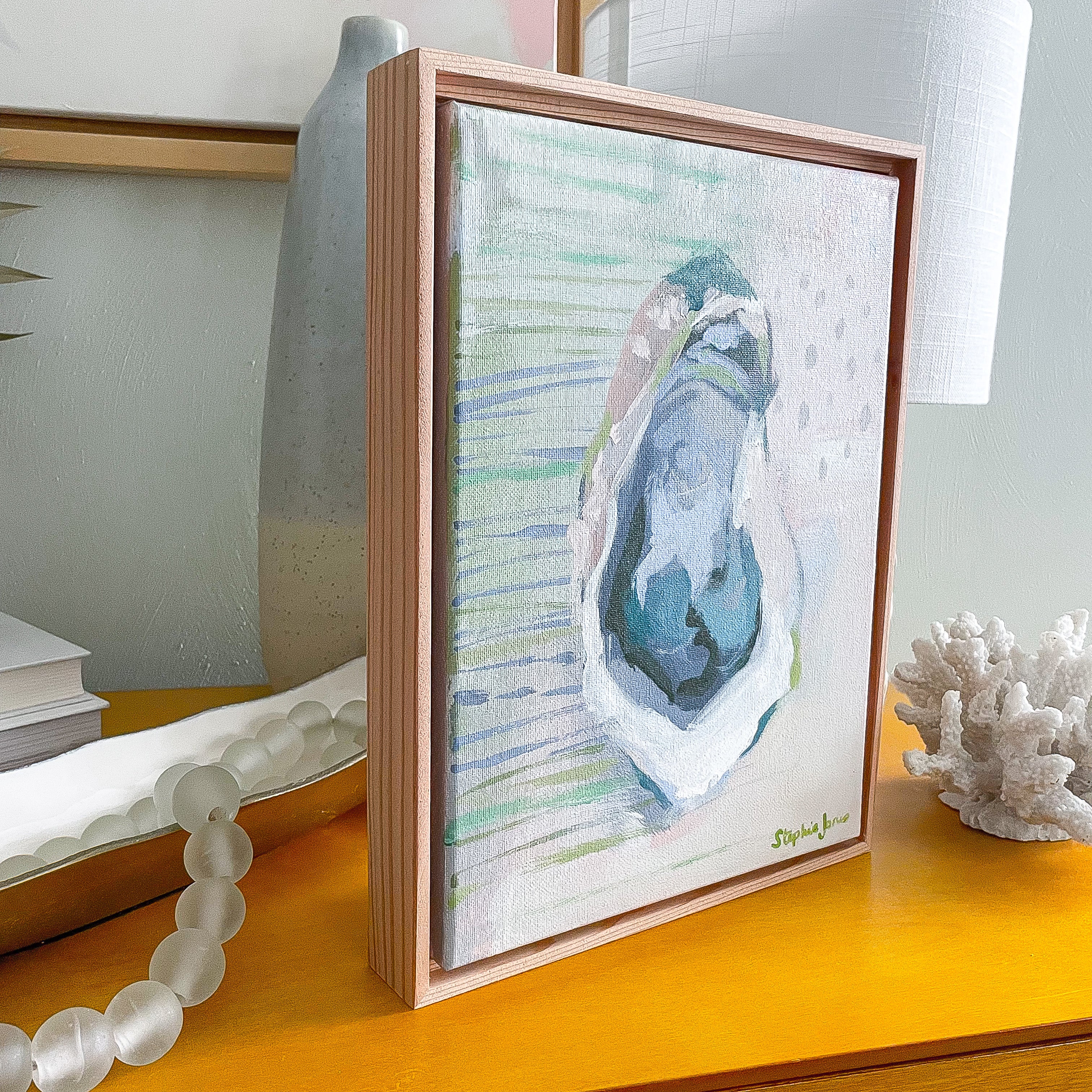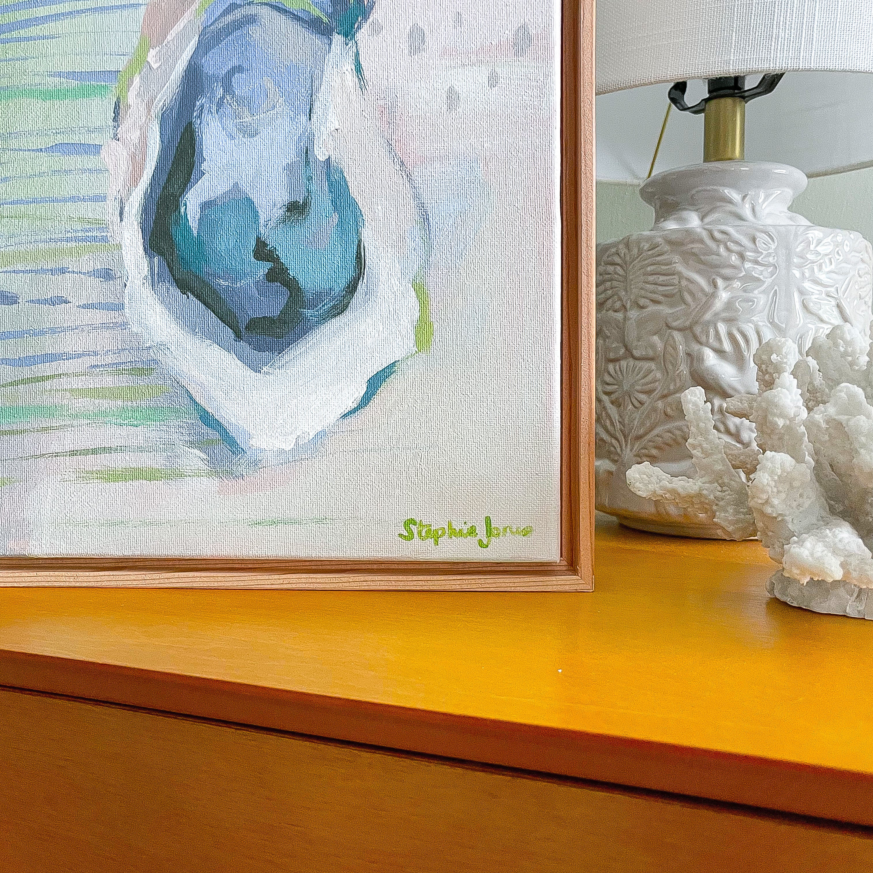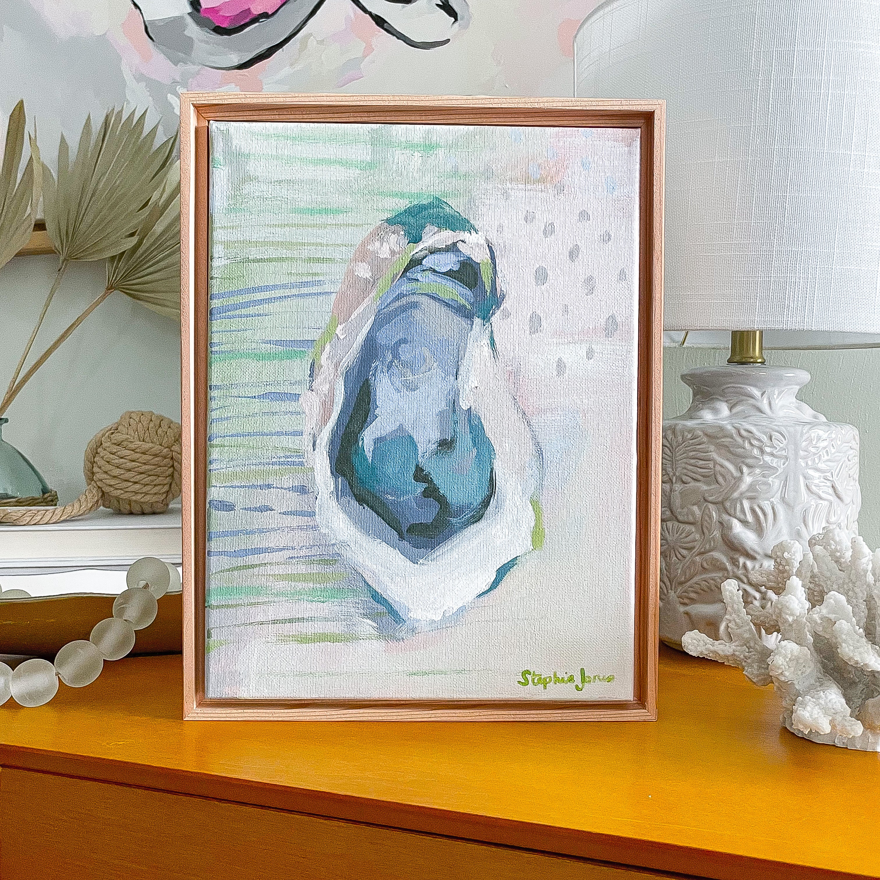 This original 9x12” acrylic oyster painting by Stephie Jones features a natural wood float frame. It adds a sophisticated, summery, coastal vibe to your home.