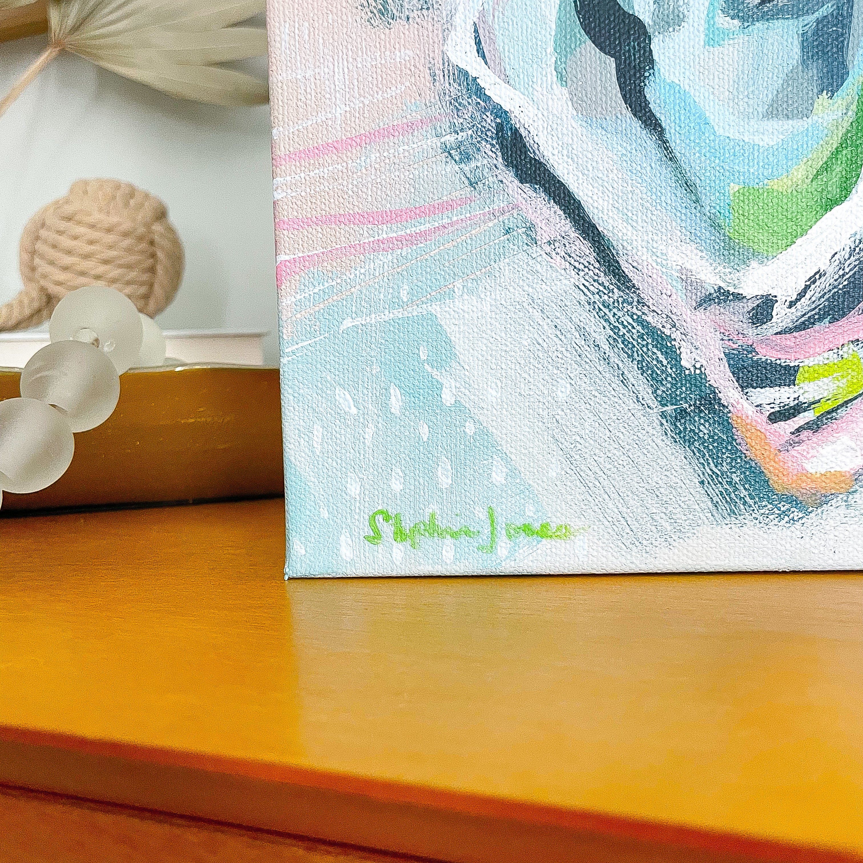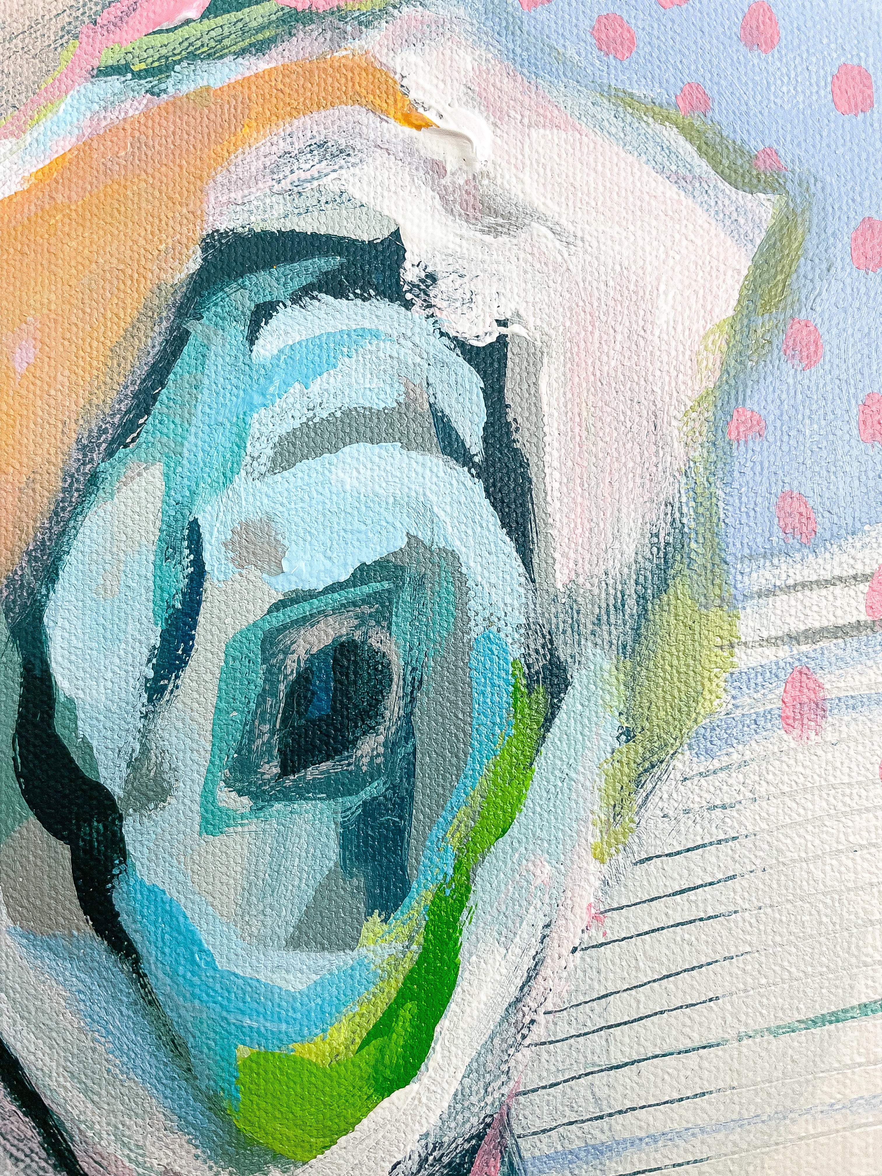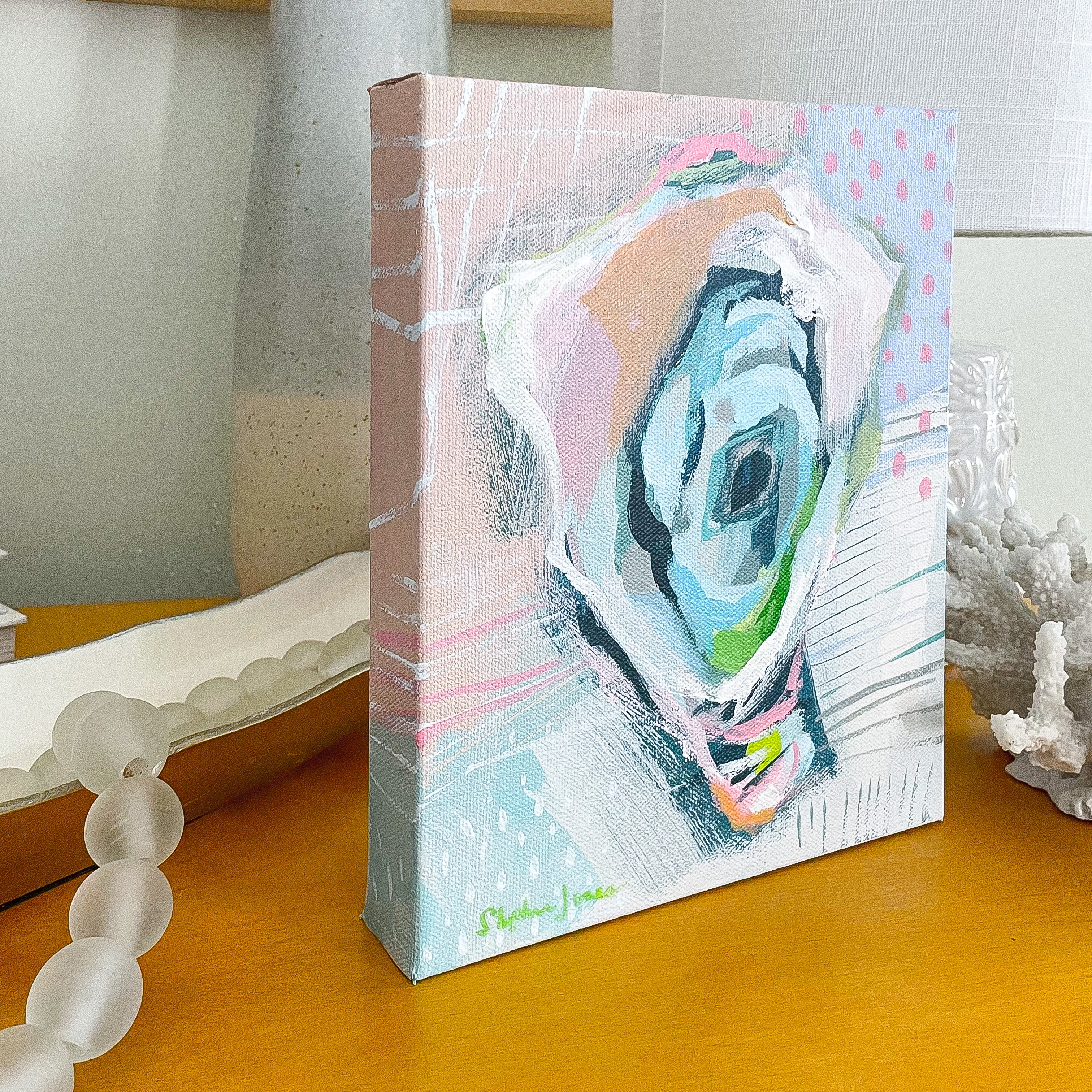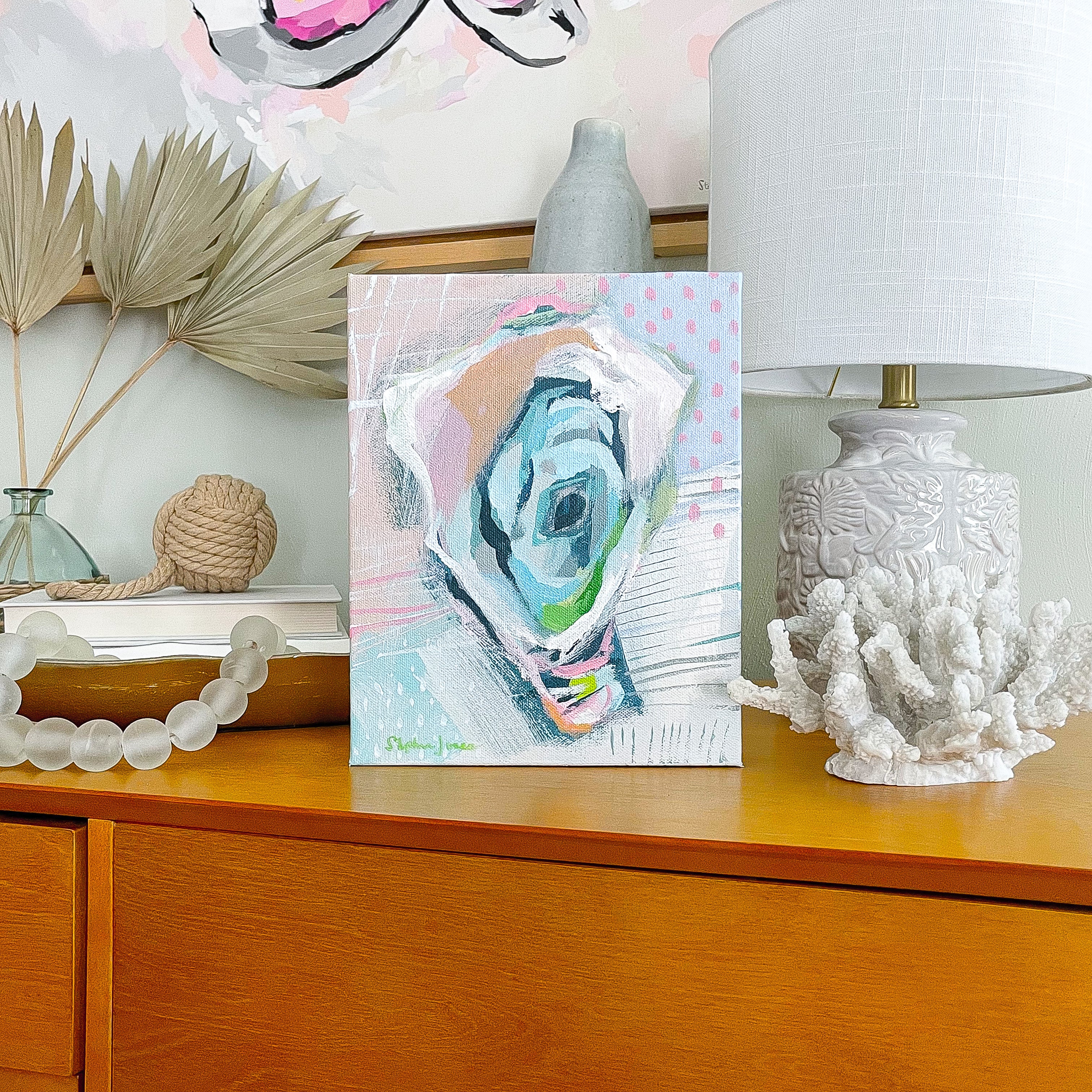 This original 8x10” acrylic oyster painting by Stephie Jones features a 1.5" gallery wrapped canvas edge with painted sides. It adds a sophisticated, summery, coastal vibe to your home.