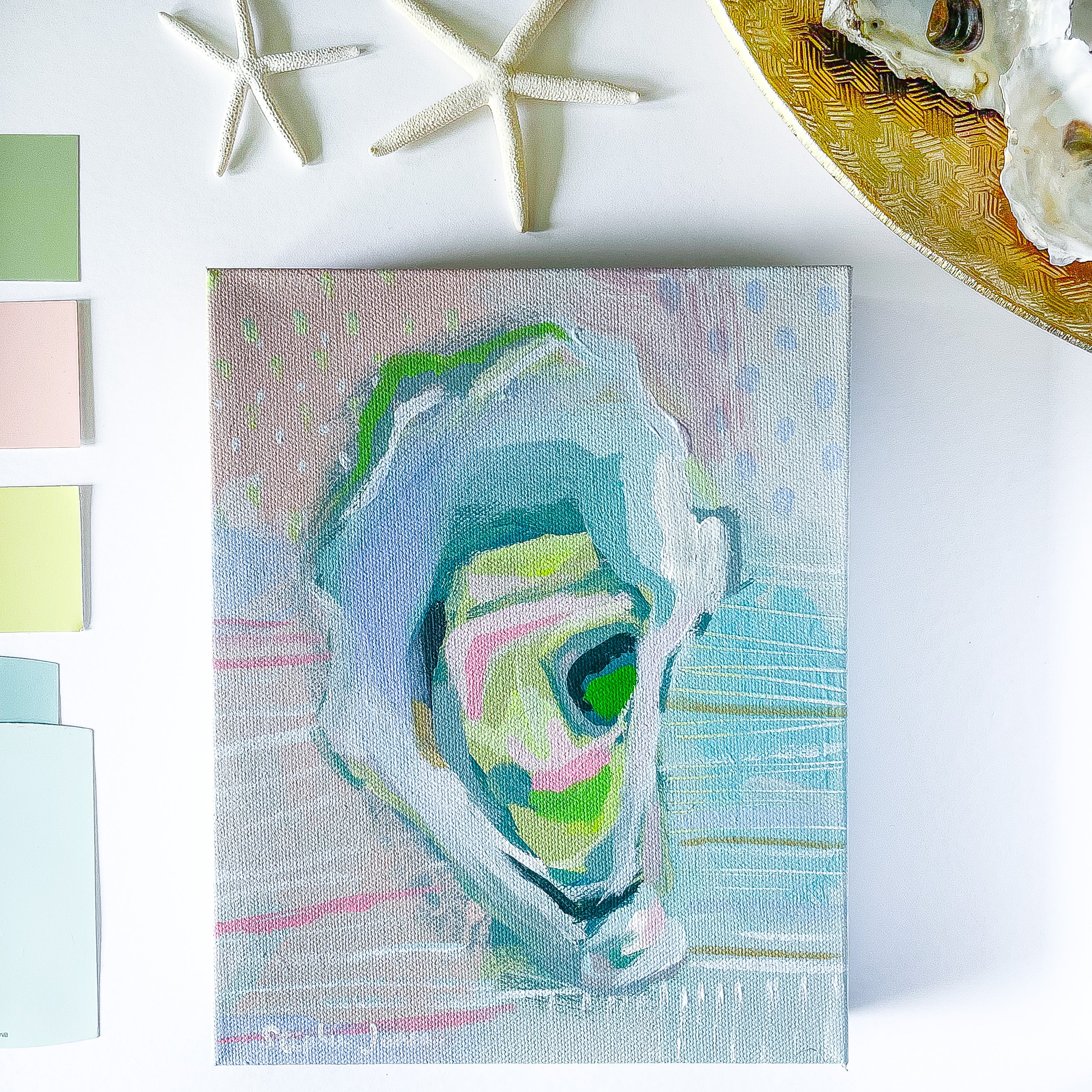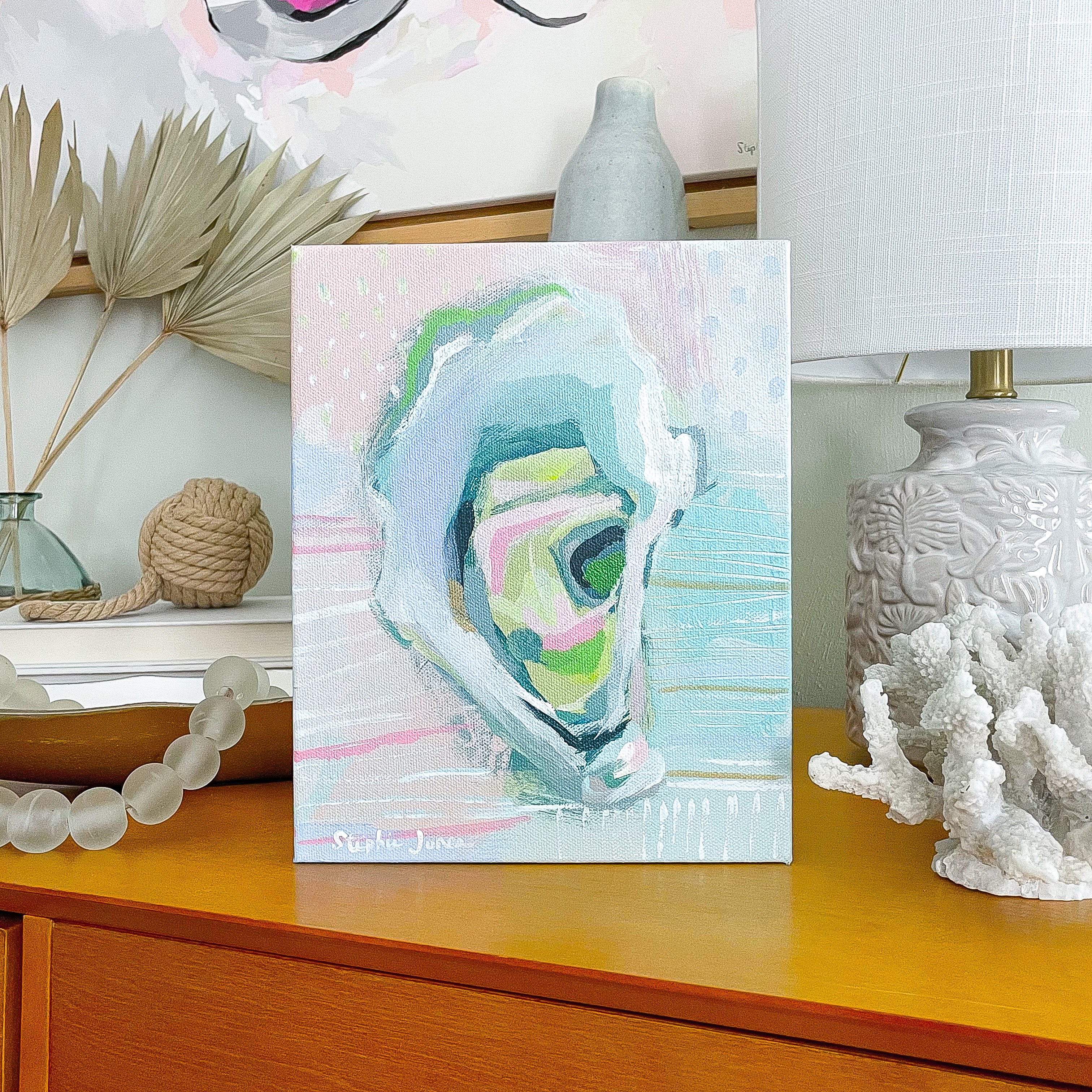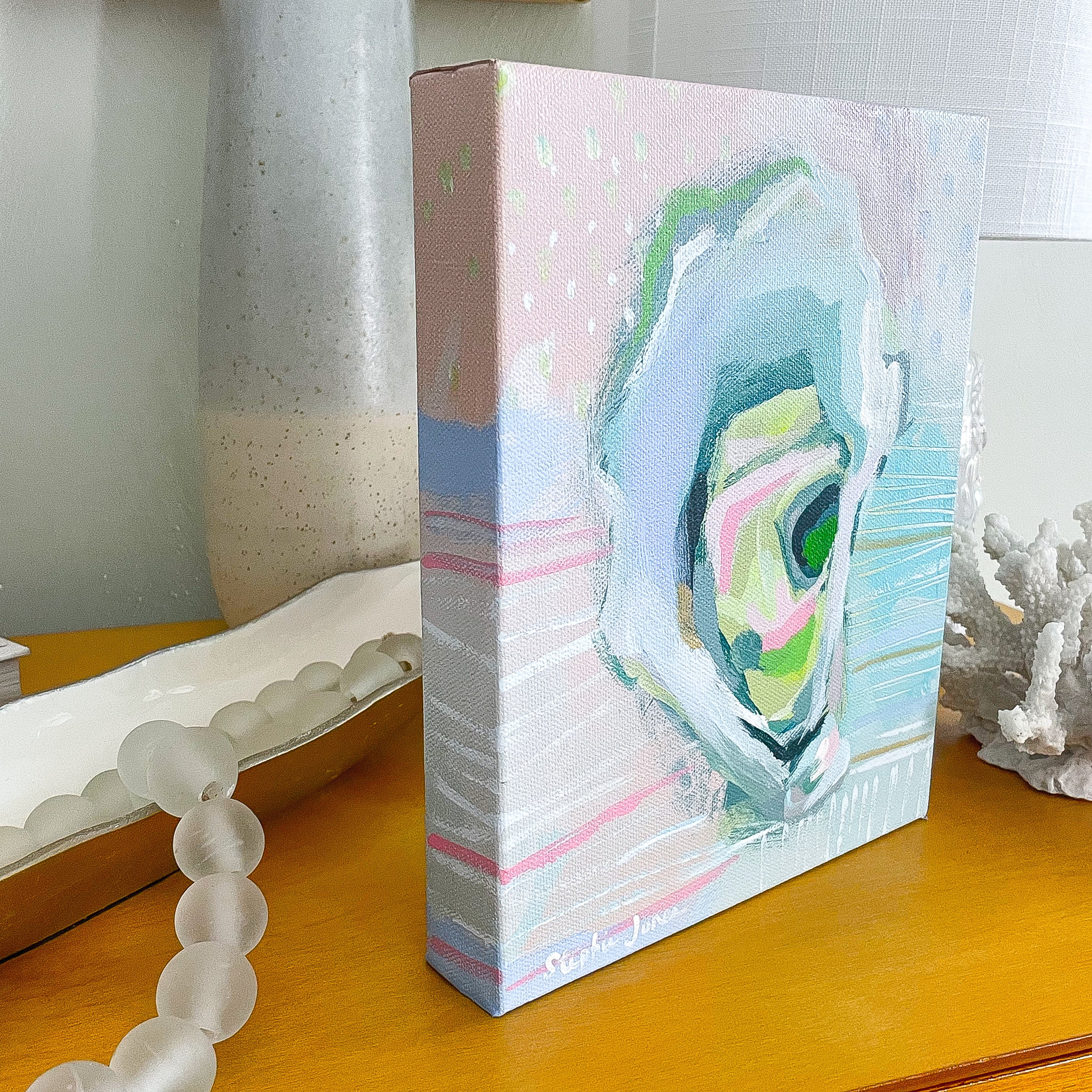 This original 8x10” acrylic oyster painting by Stephie Jones features a 1.5" gallery wrapped canvas edge with painted sides. It adds a sophisticated, summery, coastal vibe to your home.