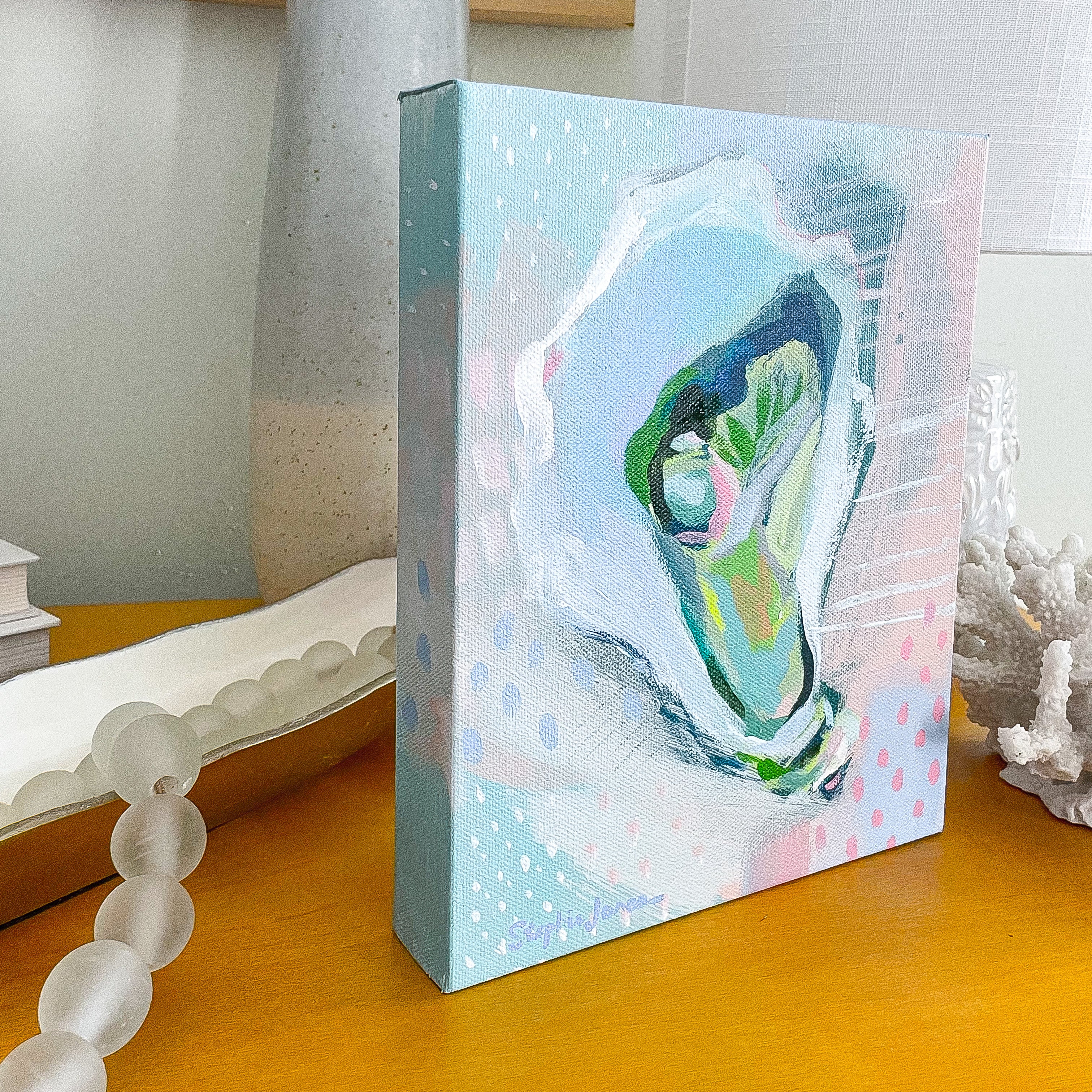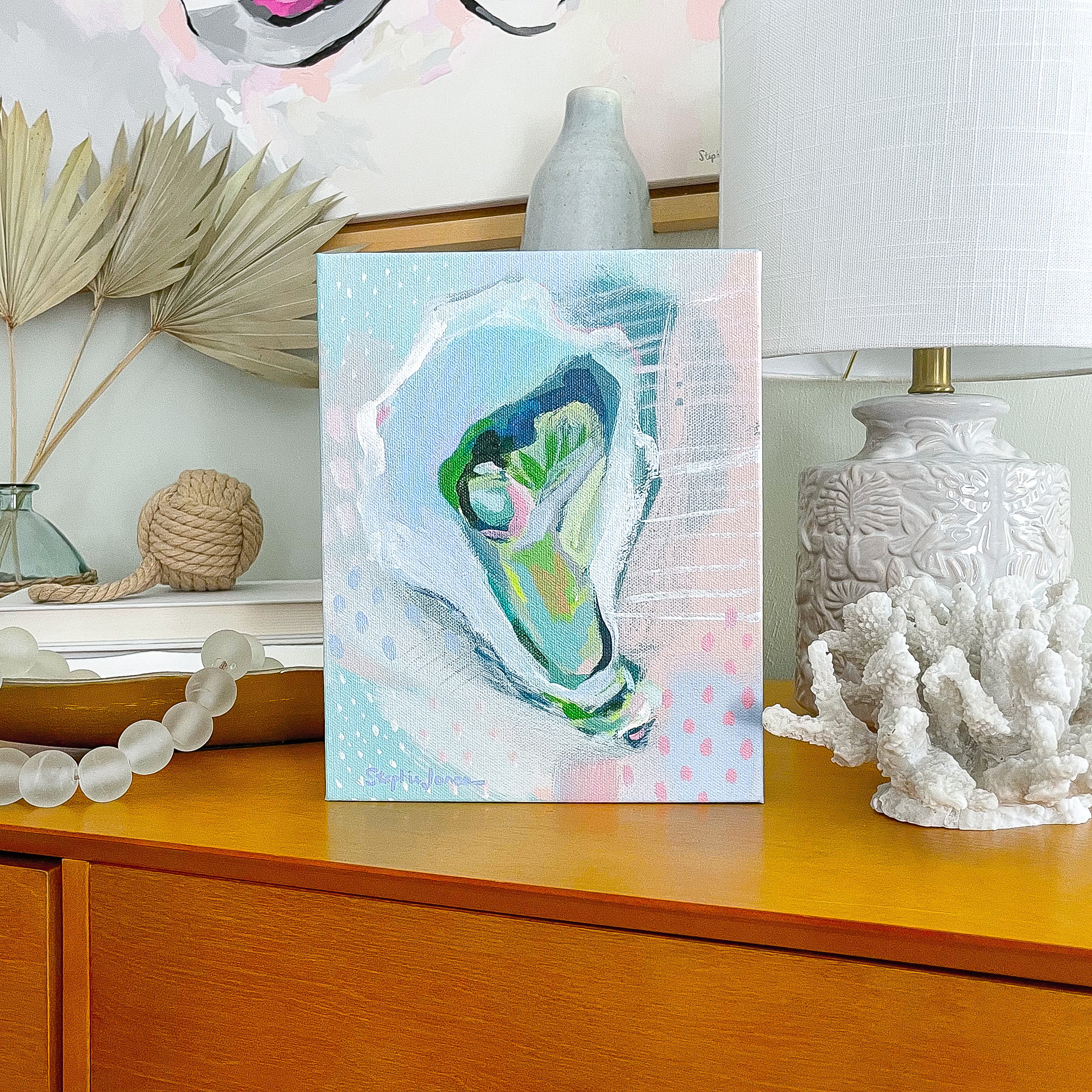 This original 8x10” acrylic oyster painting by Stephie Jones features a 1.5" gallery wrapped canvas edge with painted sides. It adds a sophisticated, summery, coastal vibe to your home.