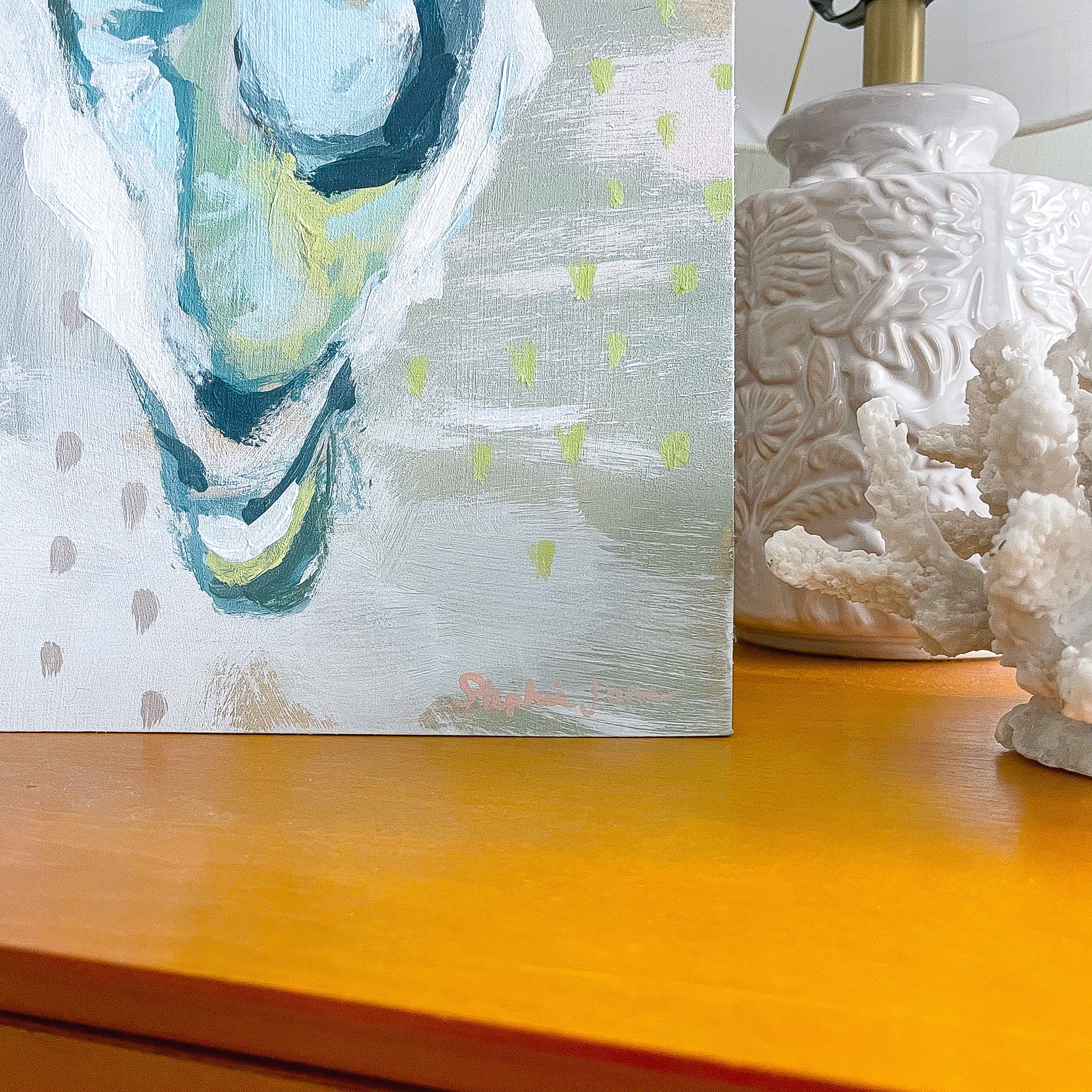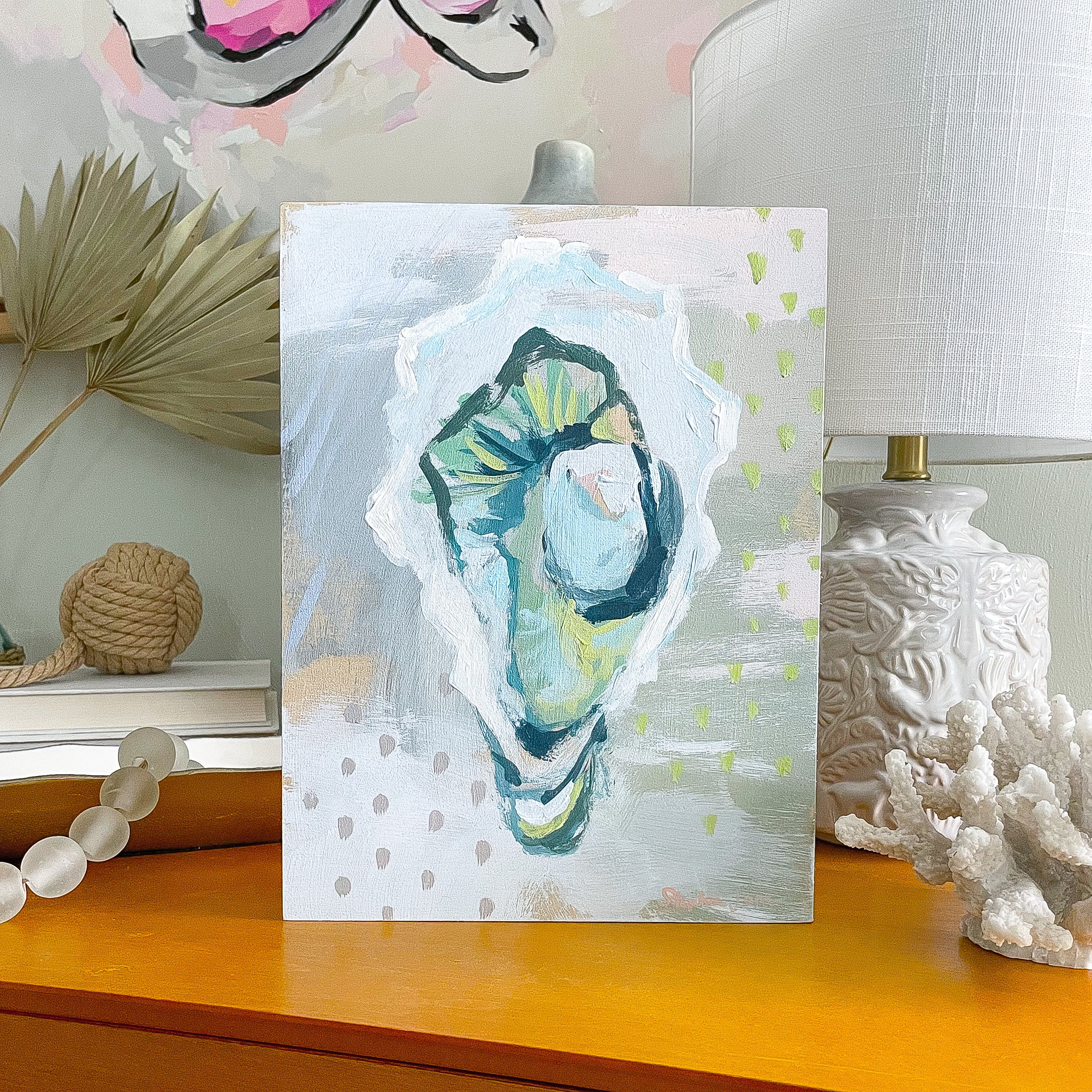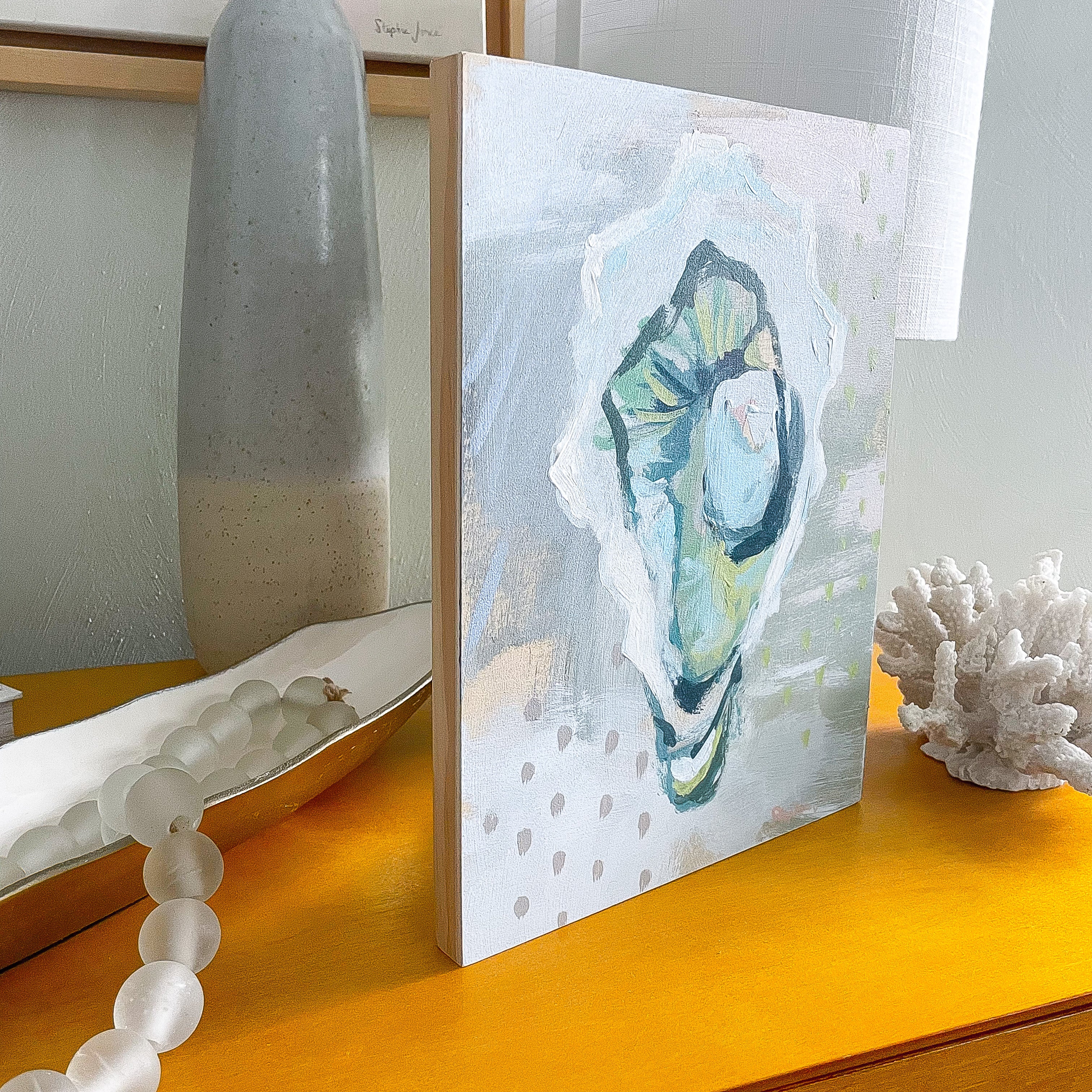 This original 9x12” acrylic oyster painting by Stephie Jones is painted on wood panel. It adds a sophisticated, summery, coastal vibe to your home.