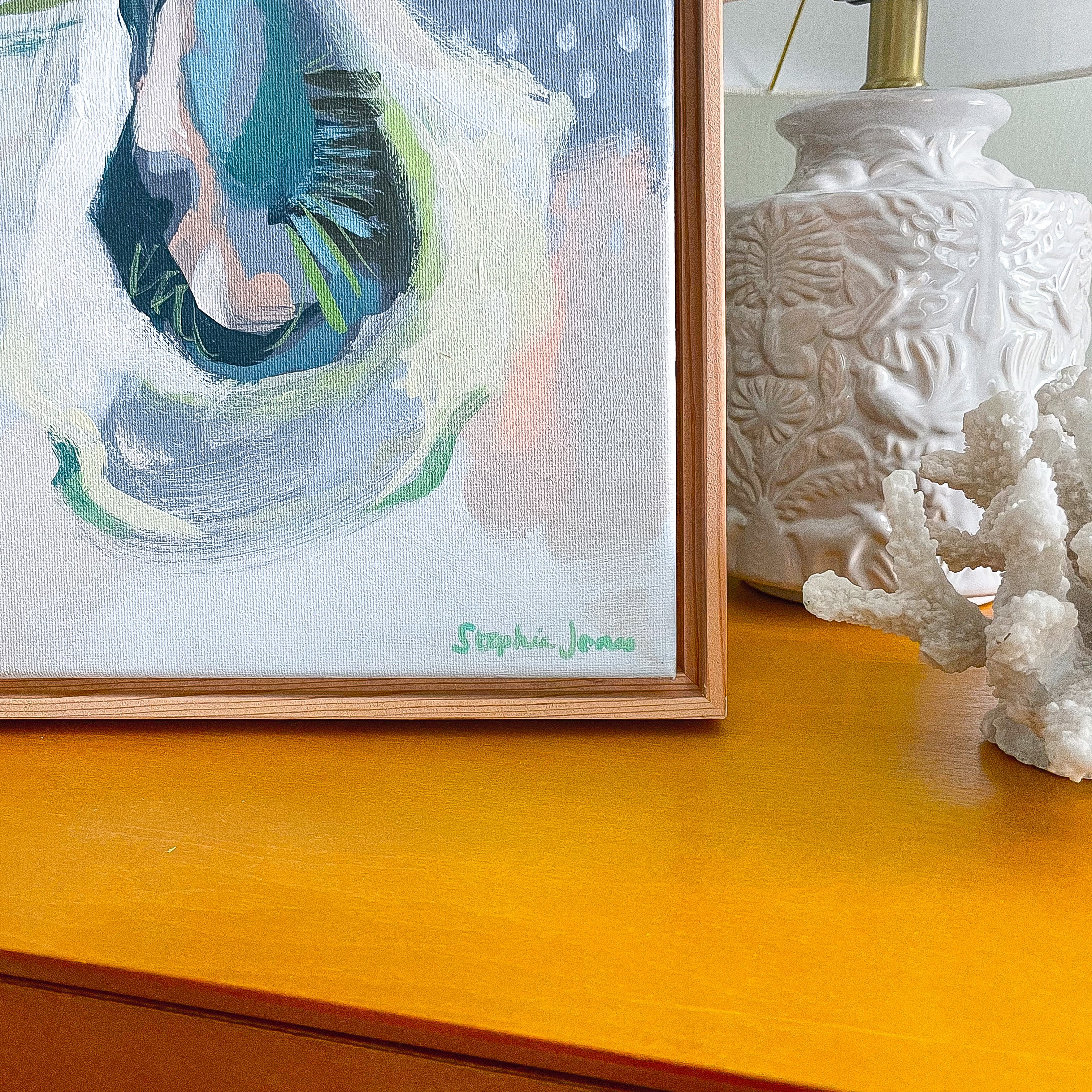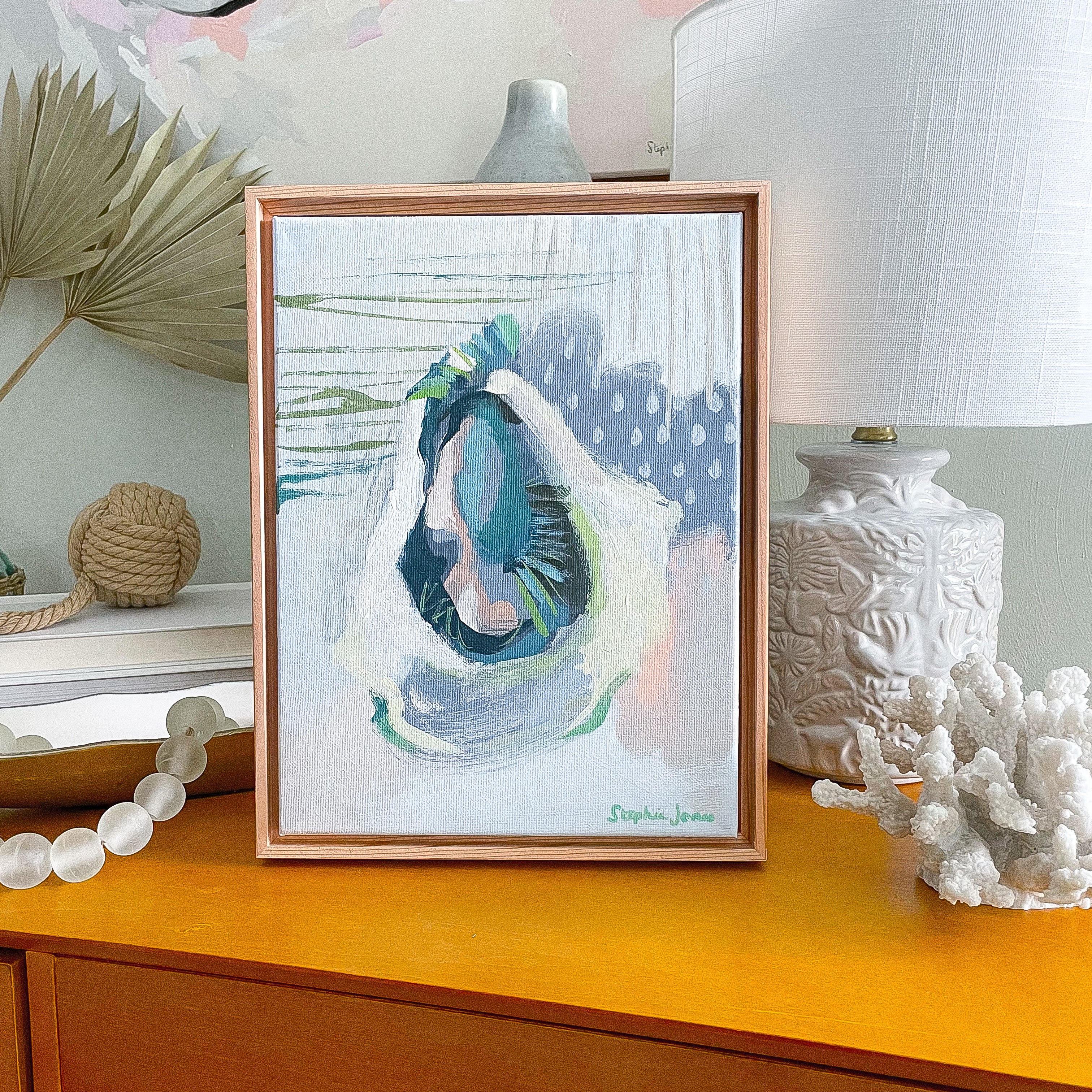 This original 9x12” acrylic oyster painting by Stephie Jones features a natural wood float frame. It adds a sophisticated, summery, coastal vibe to your home.