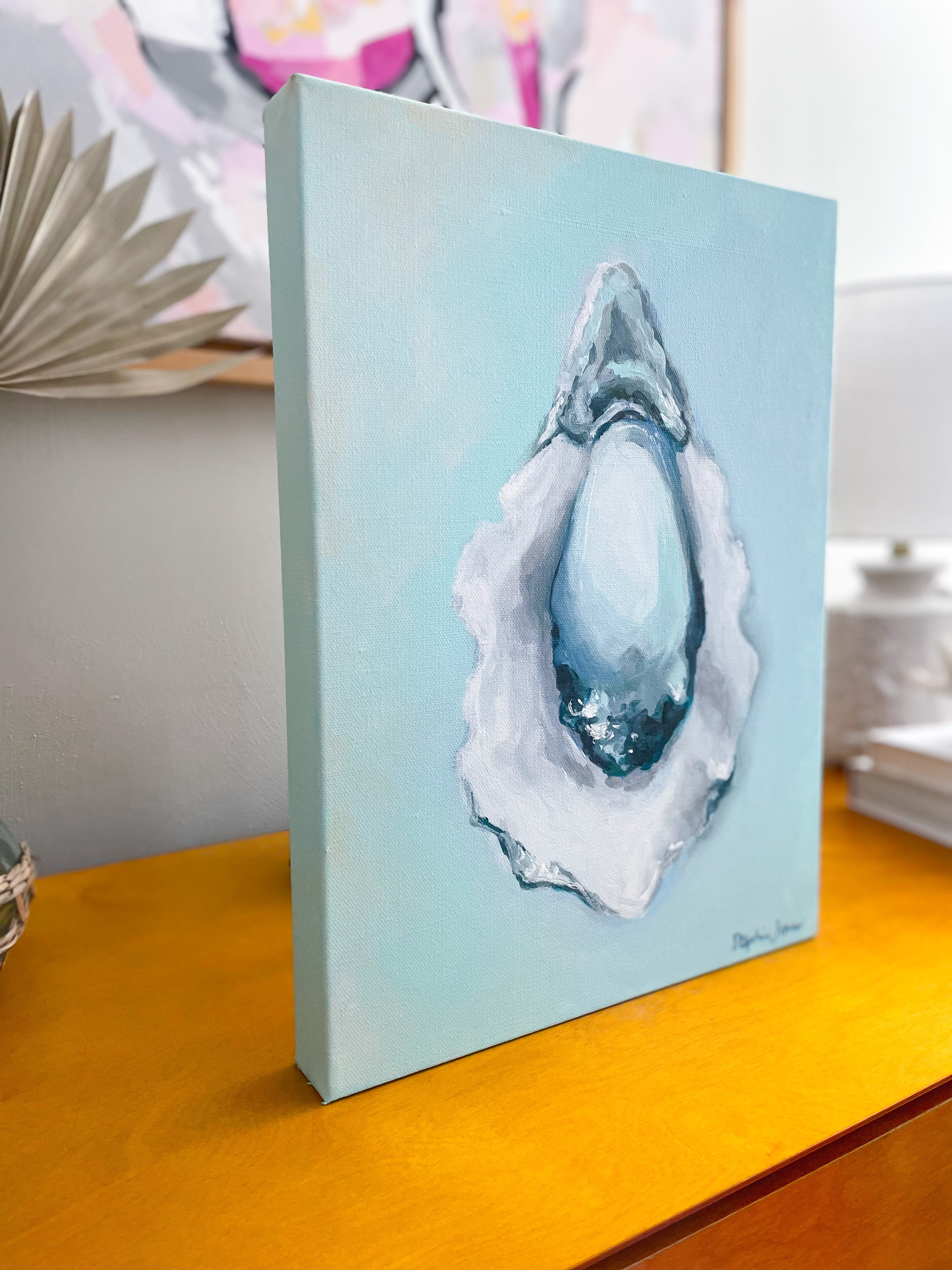 This original 12x16” acrylic oyster painting by Stephie Jones features a 1.5" gallery wrapped canvas edge with painted sides. It adds a sophisticated, summery, coastal vibe to your home.