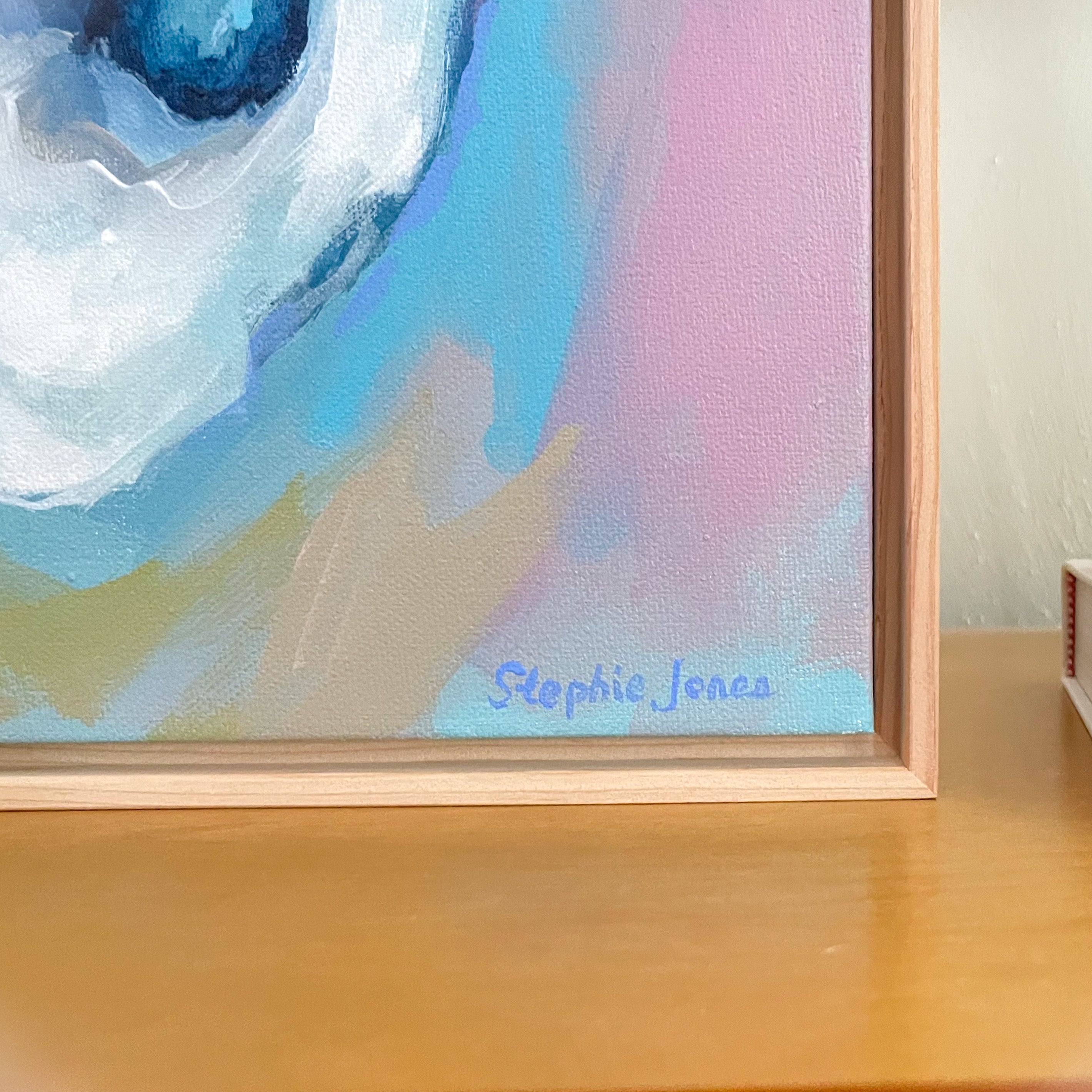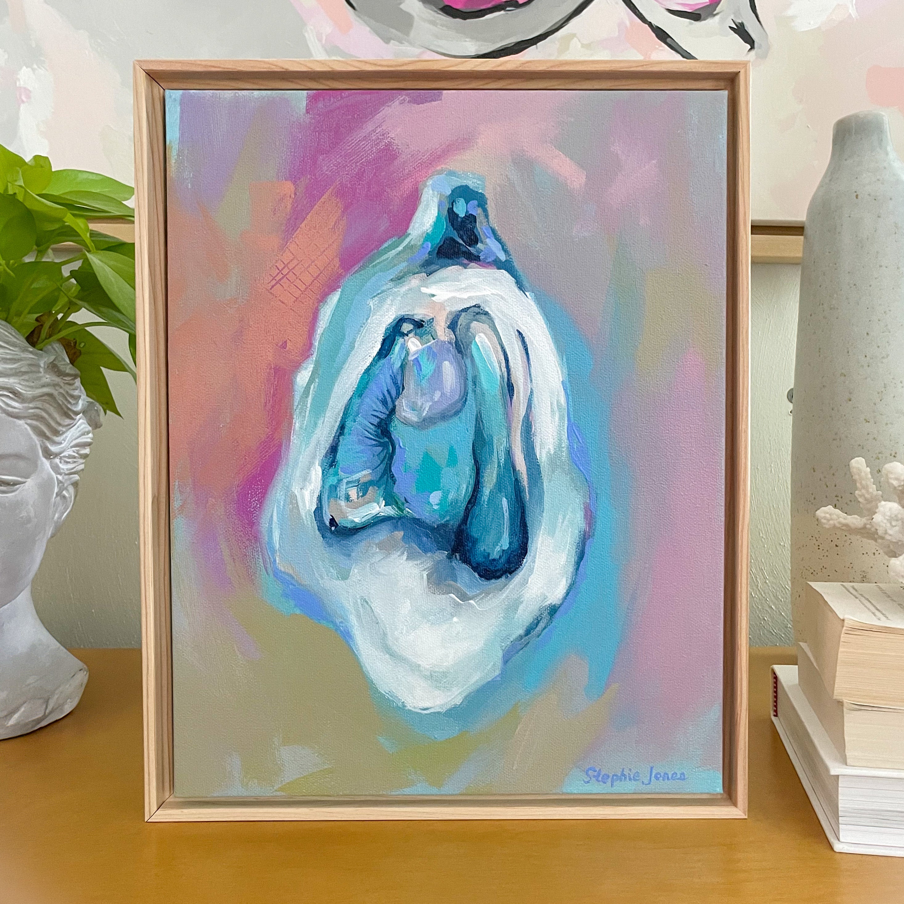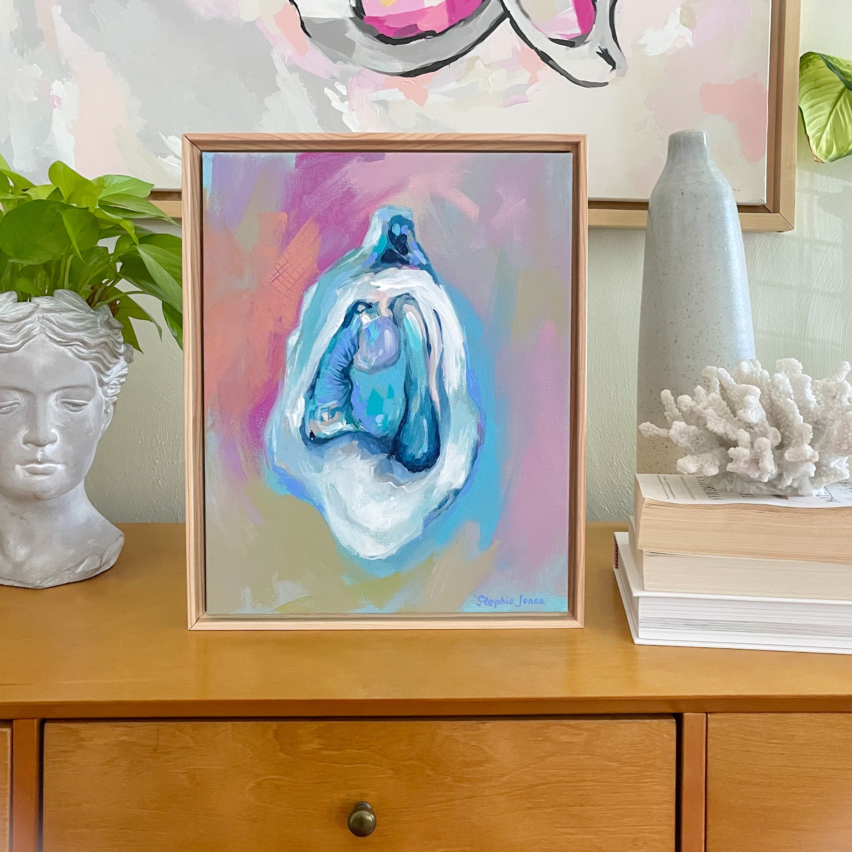 Brightly painted oyster by Stephie Jones, acrylic on canvas.