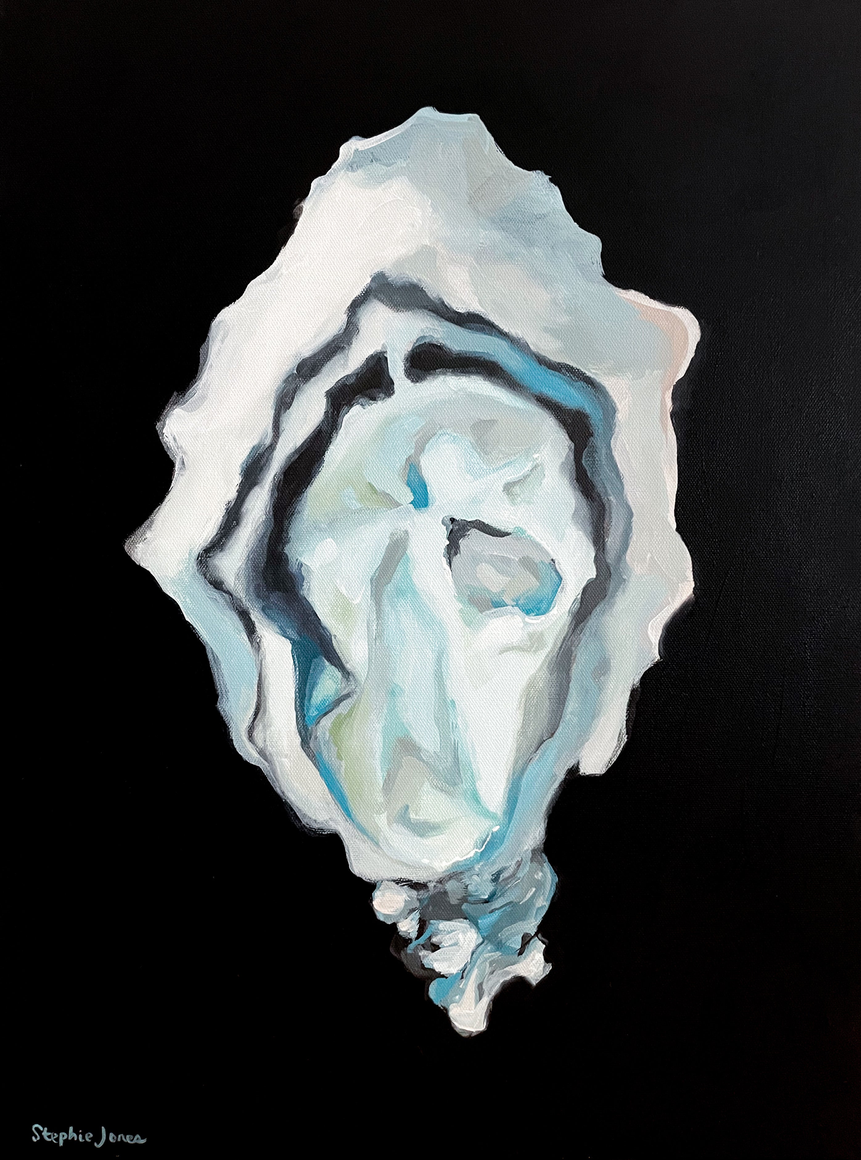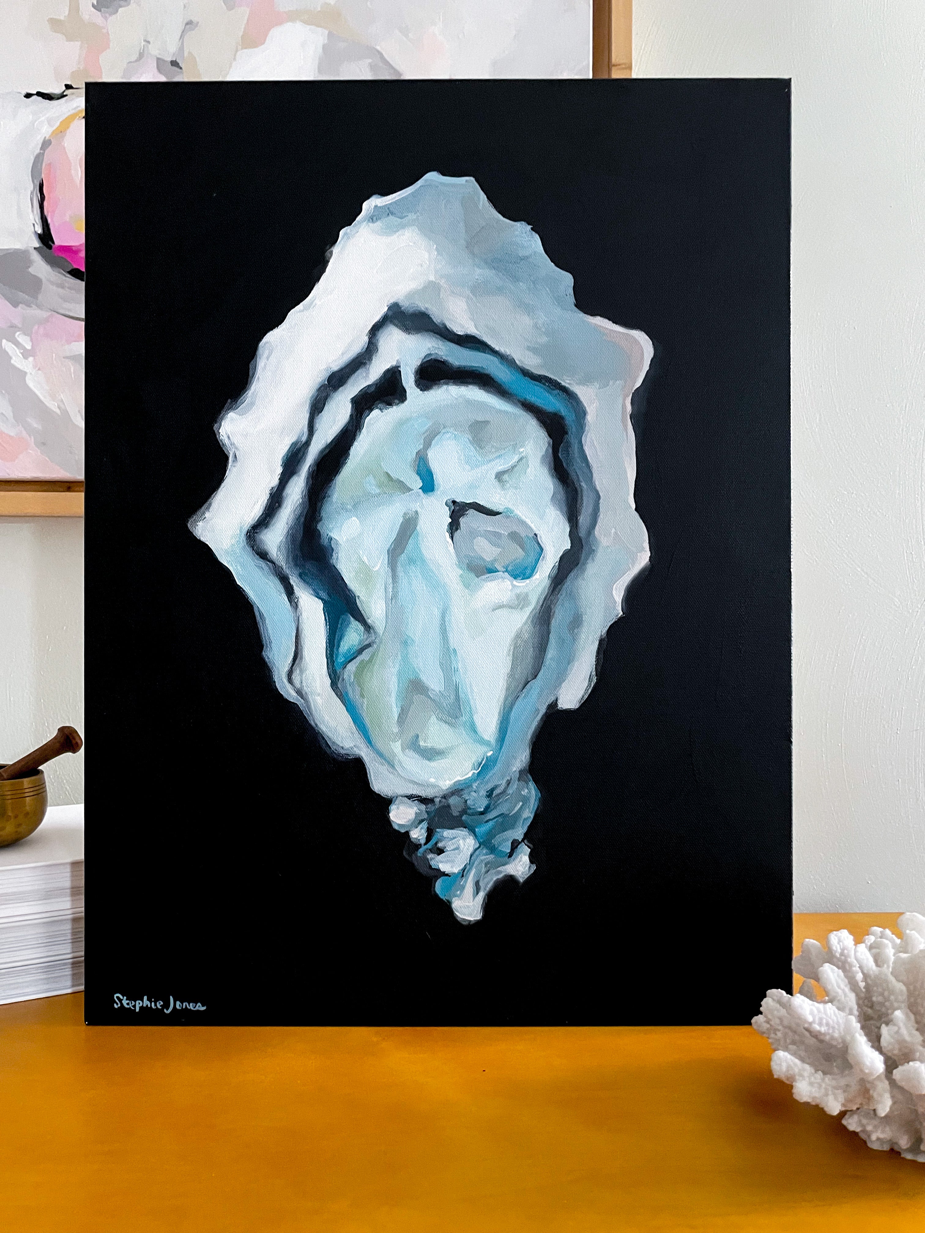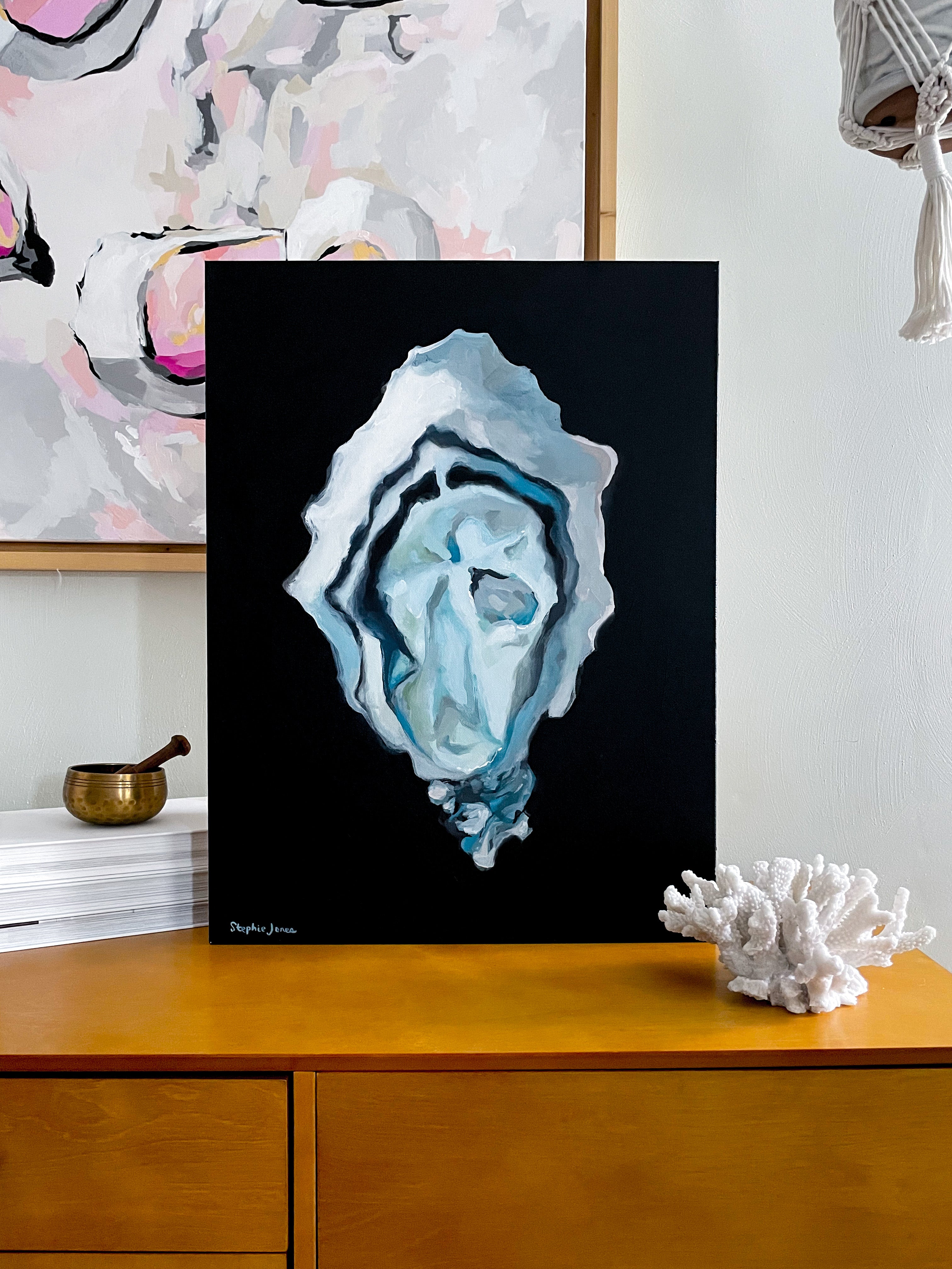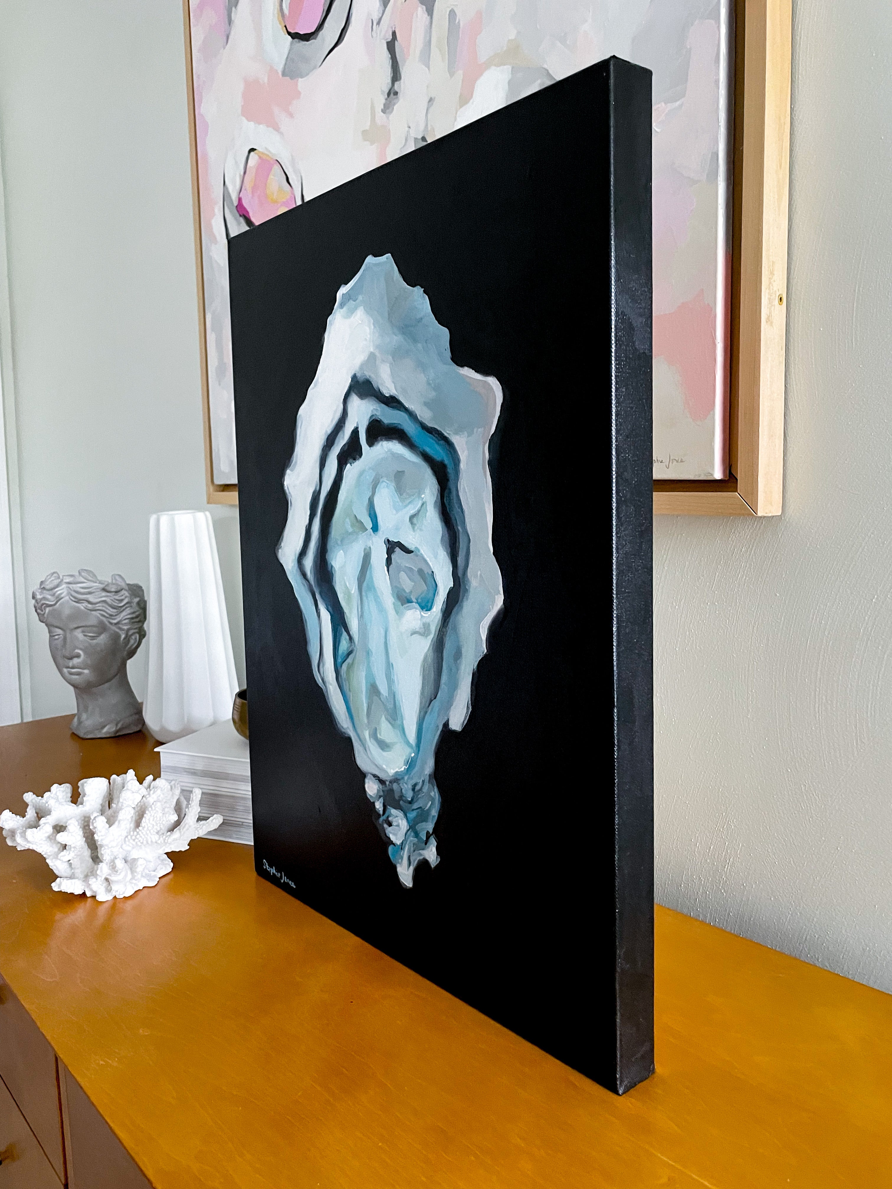 This original 18x24” acrylic oyster painting by Stephie Jones features a 1.5" gallery wrapped canvas edge with painted sides. Wired and ready to hang. It adds a sophisticated, summery, coastal vibe to your home.